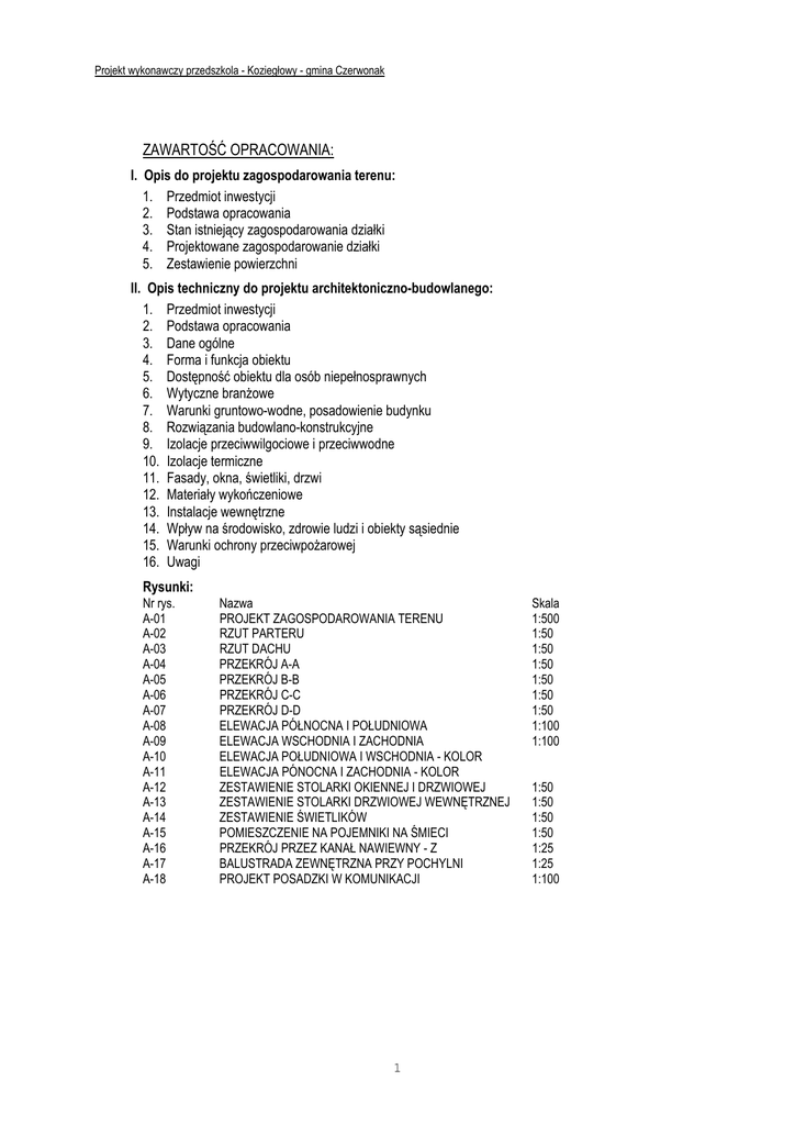Projekt wykonawczy przedszkola - Koziegłowy - gmina Czerwonak ZAWARTOŚĆ OPRACOWANIA: I. Opis do projektu zagospodarowania terenu: 1. Przedmiot inwestycji 2. Podstawa opracowania 3. Stan istniejący zagospodarowania działki 4. Projektowane zagospodarowanie działki 5. Zestawienie powierzchni II. Opis techniczny do projektu architektoniczno-budowlanego: 1. Przedmiot inwestycji 2. Podstawa opracowania 3. Dane ogólne 4. Forma i funkcja obiektu 5. Dostępność obiektu dla osób niepełnosprawnych 6. Wytyczne branżowe 7. Warunki gruntowo-wodne, posadowienie budynku 8. Rozwiązania budowlano-konstrukcyjne 9. Izolacje przeciwwilgociowe i przeciwwodne 10. Izolacje termiczne 11. Fasady, okna, świetliki, drzwi 12. Materiały wykończeniowe 13. Instalacje wewnętrzne 14. Wpływ na środowisko, zdrowie ludzi i obiekty sąsiednie 15. Warunki ochrony przeciwpożarowej 16. Uwagi Rysunki: Nr rys. A-01 A-02 A-03 A-04 A-05 A-06 A-07 A-08 A-09 A-10 A-11 A-12 A-13 A-14 A-15 A-16 A-17 A-18 Nazwa PROJEKT ZAGOSPODAROWANIA TERENU RZUT PARTERU RZUT DACHU PRZEKRÓJ A-A PRZEKRÓJ B-B PRZEKRÓJ C-C PRZEKRÓJ D-D ELEWACJA PÓŁNOCNA I POŁUDNIOWA ELEWACJA WSCHODNIA I ZACHODNIA ELEWACJA POŁUDNIOWA I WSCHODNIA - KOLOR ELEWACJA PÓNOCNA I ZACHODNIA - KOLOR ZESTAWIENIE STOLARKI OKIENNEJ I DRZWIOWEJ ZESTAWIENIE STOLARKI DRZWIOWEJ WEWNĘTRZNEJ ZESTAWIENIE ŚWIETLIKÓW POMIESZCZENIE NA POJEMNIKI NA ŚMIECI PRZEKRÓJ PRZEZ KANAŁ NAWIEWNY - Z BALUSTRADA ZEWNĘTRZNA PRZY POCHYLNI PROJEKT POSADZKI W KOMUNIKACJI 1 Skala 1:500 1:50 1:50 1:50 1:50 1:50 1:50 1:100 1:100 1:50 1:50 1:50 1:50 1:25 1:25 1:100 Projekt wykonawczy przedszkola - Koziegłowy - gmina Czerwonak I . OPIS DO PROJEKTU ZAGOSPODAROWANIA TERENU 1. Przedmiot inwestycji Przedmiotem inwestycji jest zagospodarowanie terenu wokół projektowanego budynku przedszkola, położonego na działkach nr 164/4, 164/5 (ark. 13) przy ul. Kanałowej w Koziegłowach (Gmina Czerwonak). Działki te zgodnie z decyzją o ustaleniu lokalizacji inwestycji celu publicznego przeznaczone są pod budowę przedszkola wraz z infrastrukturą towarzyszącą. 2. Podstawa opracowania: Niniejsze opracowanie wykonane jest w oparciu o: • Zlecenie inwestora • Przepisy budowlane • Mapę do celów projektowych (Mapa Zasadnicza w skali 1:500) • Decyzja o ustaleniu lokalizacji inwestycji celu publicznego z dnia 28.04.2008r. dla budowy przedszkola wraz z infrastrukturą towarzyszącą • Dokumentacje geotechniczną opracowana przez Wacława Ludwiczaka 3. Stan istniejący zagospodarowania działki Działki nr 164/4 i 164/5 są niezabudowane i stanowią obszar zieleni pomiędzy osiedlem budynków wielorodzinnych a ulicą Kanałową, przy której znajduje się niska zabudowa jednorodzinna. Przez działkę nr 164/4 przebiega utwardzony ciąg pieszy, wzdłuż którego znajdują się dwa rzędy niskich drzew. Do omawianych działek dostęp zapewniony jest od ul. Kanałowej, która łączy się z ulicą Poznańską. Obecna naturalna powierzchnia terenu w miejscu projektowanego obiektu wyniesiona jest w granicach rzędnych od około 85,27 do 86,08 m n.p.m. ze spadkiem w kierunku południowym. W pobliżu działek znajdują się sieci: gazowa, elektroenergetyczna, wodna, cieplna, kanalizacyjna: sanitarna i deszczowa, jak również sieć telefoniczna. 4. Projektowane zagospodarowanie działki. Projekt przewiduje budowę budynku przedszkola wraz z zagospodarowaniem terenu. Dojazd i dojście na teren posesji planuje się od ul. Kanałowej. Na działkach nr 164/5 rozmieszczono miejsca postojowe dla samochodów osobowych, w tym również dla osób niepełnosprawnych. Dostęp pieszy do budynku uwzględnia potrzeby osób niepełnosprawnych poruszających się na wózkach inwalidzkich, po przez odpowiednie ukształtowanie dojść oraz podjazdów. Nawierzchnia dojazdu i dojść pieszych będzie utwardzona z płytek i kostek brukowych - betonowych, parking planuje się wyłożyć płytami ażurowymi (POZBRUK). Plac zabaw będzie wykonany z piasku o grubości 30 cm. Pozostały teren nieutwardzony przeznacza się obsadzić zielenią niską i wysoką. Jeżeli lokalizacja istniejących niskich krzewów koliduje z projektowaną nawierzchnią, wtedy krzewy te należy przesadzić lub usunąć. Nawierzchnie terenu utwardzonego należy ukształtować tak, aby wody opadowe spływały do studzienek kanalizacji deszczowej, lub na teren nieutwardzony. Ze względu na dużą powierzchnię jaką zajmuje budynek przedszkola i występujące nieznaczne pochylenie terenu, należy powierzchnię działki wyrównać i ukształtować w ten sposób aby wody opadowe spływały w stronę przeciwną do budynku. Z zebranego gruntu należy ukształtować górkę, a nadmiar ziemi wywieźć na wysypisko. 2 Projekt wykonawczy przedszkola - Koziegłowy - gmina Czerwonak Pojemniki na odpady stałe znajdują się na zewnątrz budynku przy placu gospodarczym w zadaszonym i osłoniętym miejscu. Odpady kuchenne będą magazynowane w wydzielonym pomieszczeniu. Projektowany budynek przedszkola podłączony będzie do sieci zewnętrznych: - przyłącze wody - przyłącze kanalizacji sanitarnej - przyłącze kanalizacji deszczowej - przyłącze energetyczne - przyłącze sieci cieplnej Istniejące uzbrojenie terenu należy dostosować do potrzeb rozbudowywanego obiektu. Na omawianym terenie planuje się oświetlenie terenu lampami zewnętrznymi. 5. Zestawienie powierzchni: - powierzchnia zabudowy budynku projektowanego: 1289,00 m2 – 15,48% - powierzchnie dojazdów utwardzonych – bruk betonowy: 407,12 m2 – 4,89% - powierzchnie dojść utwardzonych – bruk betonowy: 595,86 m2 – 7,16% - powierzchnie płyty ażurowej parkingów – płyty ażurowe: 378,29 m2 – 4,54% - powierzchnia nawierzchni placu zabaw (piasek gr. 30 cm): 511,15 m2 – 6,14% - powierzchnia tarasu – bruk betonowy: 191,21 m2 – 2,30% - powierzchnia zieleni: 4719,13 m2 – 56,68% - opaska wokół budynku – żwir płukany (32 - 63 mm): 84,48 m2 – 1,01% - istniejący cho