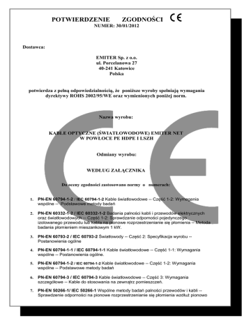 POTWIERDZENIE ZGODNOŚCI NUMER: 30/01/2012 Dostawca: EMITER Sp. z o.o. ul. Porcelanowa 27 40-241 Katowice Polska potwierdza z pełną odpowiedzialnością, że poniższe wyroby spełniają wymagania dyrektywy ROHS 2002/95/WE oraz wymienionych poniżej norm. Nazwa wyrobu: KABLE OPTYCZNE (ŚWIATŁOWODOWE) EMITER NET W POWŁOCE PE HDPE I LSZH Odmiany wyrobu: WEDŁUG ZAŁĄCZNIKA Do oceny zgodności zastosowano normy o numerach: 1. PN-EN 60794-1-2 / IEC 60794-1-2 Kable światłowodowe -- Część 1-2: Wymagania wspólne -- Podstawowe metody badań 2. PN-EN 60332-1-2 / IEC 60332-1-2 Badania palności kabli i przewodów elektrycznych oraz światłowodowych -- Część 1-2: Sprawdzanie odporności pojedynczego izolowanego przewodu lub kabla na pionowe rozprzestrzenianie się płomienia -- Metoda badania płomieniem mieszankowym 1 kW. 3. PN-EN 60793-2 / IEC 60793-2 Światłowody -- Część 2: Specyfikacja wyrobu -Postanowienia ogólne 4. PN-EN 60794-1-1 / IEC 60794-1-1 Kable światłowodowe -- Część 1-1: Wymagania wspólne -- Postanowienia ogólne. 5. PN-EN 60794-1-2 / IEC 60794-1-2 Kable światłowodowe -- Część 1-2: Wymagania wspólne -- Podstawowe metody badań 6. PN-EN 60794-3 / IEC 60794-3 Kable światłowodowe -- Część 3: Wymagania szczegółowe -- Kable do stosowania na zewnątrz pomieszczeń. 7. PN-EN 50266-1/ IEC 50266-1 Wspólne metody badań palności przewodów i kabli -Sprawdzenie odporności na pionowe rozprzestrzenianie się płomienia wzdłuż pionowo POTWIERDZENIE ZGODNOŚCI NUMER: 30/01/2012 zamontowanych wiązek kabli lub przewodów -- Część 1: Aparatura 8. PN-EN 50267-1/ IEC 50267-1 Wspólne metody badania palności przewodów i kabli -Badanie gazów powstałych podczas spalania materiałów pobranych z przewodów i z kabli -- Część 1: Aparatura. 9. PN-EN 50267-2-1/ IEC 50267-2-1 Wspólne metody badania palności przewodów i kabli -- Badanie gazów powstałych podczas spalania materiałów pobranych z przewodów i z kabli -- Część 2-1: Metody -- Oznaczanie zawartości kwaśnego gazu halogenowego 10. PN-EN 50267-2-2/ IEC 50267-1 Wspólne metody badania palności przewodów i kabli -- Badanie gazów powstałych podczas spalania materiałów pobranych z przewodów i z kabli -- Część 2-2: Metody -- Określanie kwasowości gazów przez pomiar pH i konduktywności 11. PN-EN 50267-2-3/ IEC 50267-2-3 Wspólne metody badania palności przewodów i kabli -- Badanie gazów powstałych podczas spalania materiałów pobranych z przewodów i z kabli -- Część 2-3: Metody -- Określanie kwasowości gazów przez wyznaczanie średniej ważonej pH i konduktywności 12. PN-EN 61034-1/ IEC 61034-1 Pomiar gęstości dymów wydzielanych przez palące się przewody lub kable w określonych warunkach -- Część 1: Aparatura 13. PN-EN 61034-2/ IEC 61034-2 Pomiar gęstości dymów wydzielanych przez palące się przewody lub kable w określonych warunkach -- Część 2: Metoda badania i wymagania. 14. PN-EN 50266-1/ IEC 50266-1 Wspólne metody badań palności przewodów i kabli -- Sprawdzenie odporności na pionowe rozprzestrzenianie się płomienia wzdłuż pionowo zamontowanych wiązek kabli lub przewodów -- Część 1: Aparatura 15. PN-IEC 60331-11/ IEC 60331-11 Badania kabli i przewodów elektrycznych poddanych działaniu ognia -- Ciągłość obwodu -- Część 11: Aparatura -- Pojedynczy palnik o temperaturze płomienia co najmniej 750 stopni C 16. PN-IEC 60331-25/ IEC60331-25 Badania kabli i przewodów elektrycznych poddanych działaniu ognia -- Ciągłość obwodu -- Część 25: Metody badania i wymagania -- Kable światłowodowe 17. PN-EN 60332-1-1/ IEC 60332-1-1 Badania palności kabli i przewodów elektrycznych oraz światłowodowych -- Część 1-1: Sprawdzanie odporności pojedynczego izolowanego przewodu lub kabla na pionowe rozprzestrzenianie się płomienia – Aparatura 18. PN-EN 60332-1-2/ IEC 60332-1-2 Badania palności kabli i przewodów elektrycznych oraz światłowodowych -- Część 1-2: Sprawdzanie odporności pojedynczego izolowanego przewodu lub kabla na pionowe rozprzestrzenianie się płomienia -- Metoda badania płomieniem mieszankowym 1 kW. 19. PN-EN 60332-1-3/ IEC 60332-1-3 Badania palności kabli i przewodów elektrycznych oraz światłowodowych -- Część 1-3: Sprawdzanie odporności pojedynczego izolowanego przewodu lub kabla na pionowe rozprzestrzenianie się płomienia -- Metoda badania za pomocą obserwacji spadających rozżarzonych kropli/cząstek materiału POTWIERDZENIE ZGODNOŚCI NUMER: 30/01/2012 20. PN-EN 60332-2-1/ IEC60332-2-1 Badania palności kabli i przewodów elektrycznych oraz światłowodowych -- Część 2-1: Sprawdzanie odporności pojedynczego cienkiego izolowanego przewodu lub kabla na pionowe rozprzestrzenianie się płomienia -Aparatura 21. PN-EN 60332-3/ IEC 60332-3 Badania palności kabli i przewodów elektrycznych oraz światłowodowych 22. PN-EN 50267-1/ IEC 50267 Wspólne metody badania palności przewodów i kabli -- Badanie gazów powstałych podczas spalania materiałów pobranych z przewodów i z kabli -- Część 1: Aparatura 23. PN-EN 50267-2-1/ IEC 50267-2 Wspólne metody badania palności przewodów i kabli -- Badanie gazów powstałych podczas spalania materiałów pobranych z przewodów i z kabli -- Część 2-1: Metody -- Oznaczanie zawartości kwaśnego gazu halogenowego 24. PN-EN 50267-2-2 / IEC 50267-2-2 Wspólne metody badania palności przewodów i kabli -- Badanie gazów powstałych podczas spalania materiałów pobranych z przewodów i z kabli -- Część 2-2: Metody -- Określanie kwasowości gazów przez pomiar pH i konduktywności 25. PN-EN 50267-2-3/ IEC 50267-2-3 Wspólne metody badania palności przewodów i kabli -- Badanie gazów powstałych podczas spalania materiałów pobranych z przewodów i z kabli -- Część 2-3: Metody -- Określanie kwasowości gazów przez wyznaczanie średniej ważonej pH i konduktywności 26. PN-EN 187000 Ogólne wymagania -- Kable światłowodowe 27. PN-E
