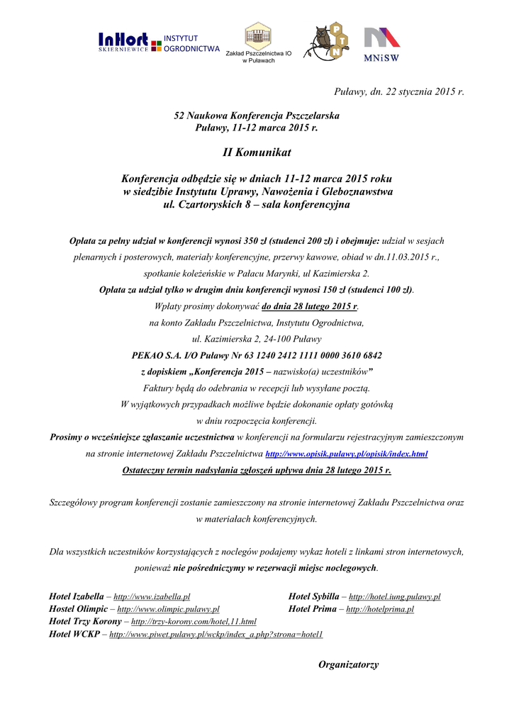 INSTYTUT OGRODNICTWA Zakład Pszczelnictwa IO w Puławach Puławy, dn. 22 stycznia 2015 r. 52 Naukowa Konferencja Pszczelarska Puławy, 11-12 marca 2015 r. II Komunikat Konferencja odbędzie się w dniach 11-12 marca 2015 roku w siedzibie Instytutu Uprawy, Nawożenia i Gleboznawstwa ul. Czartoryskich 8 – sala konferencyjna Opłata za pełny udział w konferencji wynosi 350 zł (studenci 200 zł) i obejmuje: udział w sesjach plenarnych i posterowych, materiały konferencyjne, przerwy kawowe, obiad w dn.11.03.2015 r., spotkanie koleżeńskie w Pałacu Marynki, ul Kazimierska 2. Opłata za udział tylko w drugim dniu konferencji wynosi 150 zł (studenci 100 zł). Wpłaty prosimy dokonywać do dnia 28 lutego 2015 r. na konto Zakładu Pszczelnictwa, Instytutu Ogrodnictwa, ul. Kazimierska 2, 24-100 Puławy PEKAO S.A. I/O Puławy Nr 63 1240 2412 1111 0000 3610 6842 z dopiskiem „Konferencja 2015 – nazwisko(a) uczestników” Faktury będą do odebrania w recepcji lub wysyłane pocztą. W wyjątkowych przypadkach możliwe będzie dokonanie opłaty gotówką w dniu rozpoczęcia konferencji. Prosimy o wcześniejsze zgłaszanie uczestnictwa w konferencji na formularzu rejestracyjnym zamieszczonym na stronie internetowej Zakładu Pszczelnictwa http://www.opisik.pulawy.pl/opisik/index.html Ostateczny termin nadsyłania zgłoszeń upływa dnia 28 lutego 2015 r. Szczegółowy program konferencji zostanie zamieszczony na stronie internetowej Zakładu Pszczelnictwa oraz w materiałach konferencyjnych. Dla wszystkich uczestników korzystających z noclegów podajemy wykaz hoteli z linkami stron internetowych, ponieważ nie pośredniczymy w rezerwacji miejsc noclegowych. Hotel Izabella – http://www.izabella.pl Hotel Sybilla – http://hotel.iung.pulawy.pl Hostel Olimpic – http://www.olimpic.pulawy.pl Hotel Prima – http://hotelprima.pl Hotel Trzy Korony – http://trzy-korony.com/hotel,11.html Hotel WCKP – http://www.piwet.pulawy.pl/wckp/index_a.php?strona=hotel1 Organizatorzy