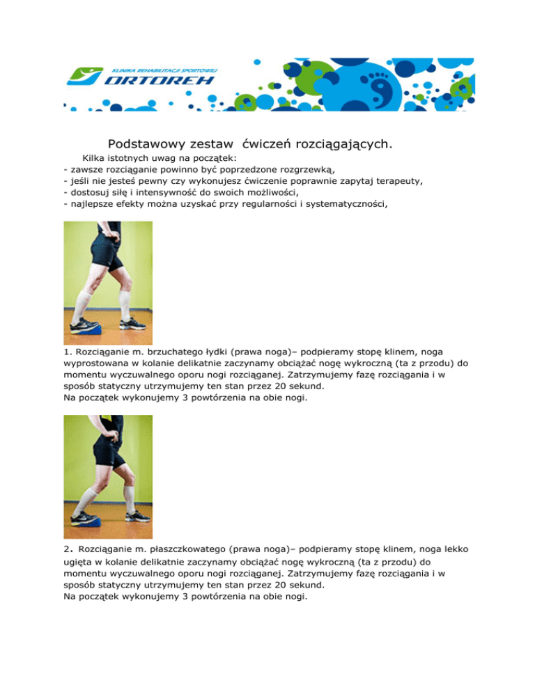 Podstawowy zestaw ćwiczeń rozciągających. - Kilka istotnych uwag na początek: zawsze rozciąganie powinno być poprzedzone rozgrzewką, jeśli nie jesteś pewny czy wykonujesz ćwiczenie poprawnie zapytaj terapeuty, dostosuj siłę i intensywność do swoich możliwości, najlepsze efekty można uzyskać przy regularności i systematyczności, 1. Rozciąganie m. brzuchatego łydki (prawa noga)– podpieramy stopę klinem, noga wyprostowana w kolanie delikatnie zaczynamy obciążać nogę wykroczną (ta z przodu) do momentu wyczuwalnego oporu nogi rozciąganej. Zatrzymujemy fazę rozciągania i w sposób statyczny utrzymujemy ten stan przez 20 sekund. Na początek wykonujemy 3 powtórzenia na obie nogi. 2. Rozciąganie m. płaszczkowatego (prawa noga)– podpieramy stopę klinem, noga lekko ugięta w kolanie delikatnie zaczynamy obciążać nogę wykroczną (ta z przodu) do momentu wyczuwalnego oporu nogi rozciąganej. Zatrzymujemy fazę rozciągania i w sposób statyczny utrzymujemy ten stan przez 20 sekund. Na początek wykonujemy 3 powtórzenia na obie nogi. 3. Rozciąganie grupy m. przyśrodkowych zginaczy – szukamy fragmentu wolnej ściany, kładziemy się na plecach z pośladkami jak najbliżej ściany. Odcinek lędźwiowy kręgosłupa przylega do podłoża, kolana wyprostowane ze stopami skierowanymi do wewnątrz. Pozwalamy aby nogi „rozjechały się” na boki do momentu oporu. W tym momencie cierpliwie leżymy sobie, aż minie 20 sekund. Ilość powtórzeń 5 razy (faza odpoczynku, powrót do pozycji z ugiętymi kolanami) 4. Rozciąganie grupy m. biodrowo-lędźwiowych – pozycja w klęku przodem, lewa strona jest rozciągana (pilnujemy aby lewe biodro nie zostawało mocno z tyłu). 5. Rozciąganie m. czworogłowego (szczególnie m. prostego uda) – pozycja wyjściowa j/w, chwytamy lewą ręką (ewentualnie przeciwną) za goleń i przyciągamy do pośladka. Ważne aby utrzymać odpowiedni kąt nachylenia kości udowej w stosunku do podłoża, tak aby nie naciskać na rzepkę. Jeśli nie jesteś w stanie uchwycić goleni zrób przedłużkę w postaci paska (zwiększamy ramię dźwigni). 6. Rozciąganie m. pośladkowych – pozycja w leżeniu na plecach, zakładamy nogę na nogę i lekko naciskamy na kolano do momentu wyczuwalnego oporu. Zdjęcie obok pokazuje sposób bardziej dynamiczny rozciągania tej samej grupy mięśniowej. Przytrzymujemy przez 20 sekund. Ilość powtórzeń 5 razy. 7. Rozciąganie pasma biodrowo-piszczelowego, naprężacza powięzi szerokiej - w tym ustawieniu rozciągamy prawą stronę, staramy się aby biodro było wysunięte do przodu. 8. Wersja ćwiczeń rozciągających z użyciem podpórki w postaci płotka. Każde z ćwiczeń rozciąga inną partię mięśniową: dwugłowy uda, zginacze wewnętrzne, pasmo boczne uda 9.Rozciąganie m. prostego uda. 10. Rozciąganie m. dwugłowego uda – należy pilnować aby kolano było w wyproście. w razie pytań: [email protected] lub www.ortoreh.pl Pozdrowienia od zespołu kliniki Ortoreh