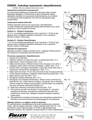EDB650, Instrukcja czyszczenia i dezynfekowania UWAGA: Nie myć urządzenia strumieniem wody ! Czyszczenie powierzchni zewnętrznych Do czyszczenia plastikowych powierzchni zbiornika należy używać łagodnego detergentu. Powierzchnie ze stali nierdzewnej czyścić specjalnym środkiem do czyszczenia stali nierdzewnej, np. środkiem do czyszczenia stali nierdzewnej firmy 3M lub odpowiednim jego zamiennikiem. Rys. 13. Czyszczenie wnętrza zbiornika Wnętrze zbiornika powinno być czyszczone i dezynfekowane co sześć miesięcy lub częściej (jeśli wystąpi taka potrzeba), przy użyciu roztworów A oraz B opisanych poniżej. Roztwór A – Roztwór Czyszczący 30 ml (1 oz) wybielacza/podchlorynu sodu rozpuścić w 7.6 litra (2 gal) gorącej wody a następnie dokładnie wymieszać w celu uzyskania 200 ppm roztworu chlorowego. Roztwór B – Roztwór Dezynfekujący 7 ml (1/4 oz) wybielacza/podchlorynu sodu rozpuścić w 7.6 litra (2 gal) gorącej wody a następnie dokładnie wymieszać w celu uzyskania 50 ppm roztworu chlorowego. Rys. 14. Szczotka do czyszczenia Specjalna szczotka z długim trzonkiem (prod. z katalogu Follett) powinna być używana do czyszczenia dna zbiornika Ice Pro. Procedura czyszczenia i dezynfekowania 1. Usunąć lód ze zbiornika. 2. Odłączyć zasilanie od wytwornicy lodu i od dyspensera (Rys.13.1). 3. Zdjąć panel z oknem rewizyjnym (Rys. 13.2). 4. Zdjąć przednią osłonę: odkręcić boczne śruby mocujące z obu stron, a następnie unieść osłonę nad kołki prowadzące i odłożyć (Rys. 13.3). 5. Zwolnić klamry mocujące motoreduktor i przesunąć na bok silnik wraz z zespolonym mechanizmem sprzęgłowym (Rys. 14.1). 6. Zdjąć kanał dmuchawy. W tym celu poluzować śrubę mocującą,odsunąć na bok blaszkę dociskową, następnie unieść kanał dmuchawy (Rys. 14.2). 7. Zdjąć osłonę zrzutni lodu (Rys. 14.4). 8. Wyciągnąć podajnik ślimakowy (Rys. 15.1). 9. Wyciągnąć rurę podajnika ślimakowego: odkręcić śruby na klamrze po Rys. 15. lewej stronie rury, unieść klamrę mocującą i wyciągnąć rurę ze zbiornika. Zwrócić uwagę na nacięcie pozycjonujące w górnej części rury podajnika dla celów ponownej, poprawnej instalacji rury. 10. Zdjąć tacę ociekową z konstrukcji wsporczej (Rys. 15.3). 11. Przy pomocy szczotki oraz Roztworu Czyszczącego A - wyczyścić wszystkie komponenty, wewnętrzne powierzchnie zbiornika oraz powierzchnie zrzutni lodu. Następnie wszystko dokładnie wypłukać czystą wodą. 12. Zdezynfekować wszystkie komponenty oraz wewnętrzne powierzchnie zbiornika prz pomocy Roztworu Dezynfekującego B. Nie spłukiwać. Obsługa systemu rur odpływu wody ze zbiornika Po wyczyszczeniu i zdezyfekowaniu ale przed napełanieniem zbiornika lodem, wlać do odpływu zbiornika roztwór: jednego kubka (237 ml/ 1 oz) podchlorynu sodu rozpuszczonego w 3,8 litra (1 gal) gorącej wody. Powyższe wykonać, aby zapobiec rozwojowi glonów w rurach odpływowych. 801 Church Lane • Easton, PA 18040, USA Toll free (800) 523-9361 • (610) 252-7301 Fax (610) 250-0696 • www.follettice.com ® © Follett Corporation Form #FE-AK 11/13