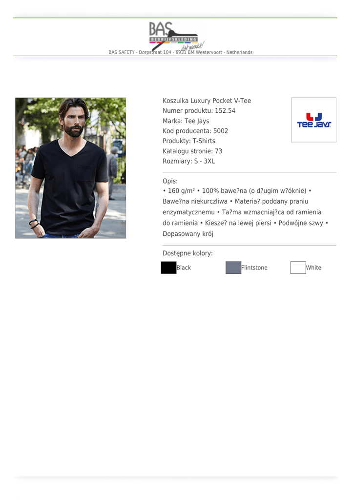 BAS SAFETY - Dorpstraat 104 - 6931 BM Westervoort - Netherlands Koszulka Luxury Pocket V-Tee Numer produktu: 152.54 Marka: Tee Jays Kod producenta: 5002 Produkty: T-Shirts Katalogu stronie: 73 Rozmiary: S - 3XL Opis: • 160 g/m² • 100% bawe?na (o d?ugim w?óknie) • Bawe?na niekurczliwa • Materia? poddany praniu enzymatycznemu • Ta?ma wzmacniaj?ca od ramienia do ramienia • Kiesze? na lewej piersi • Podwójne szwy • Dopasowany krój Dostępne kolory: Black Flintstone White