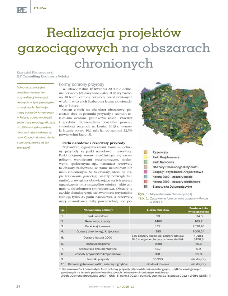 PALIWA Realizacja projektów gazociągowych na obszarach chronionych Krzysztof Pietraszewski ILF Consulting Engineers Polska Ochrona przyrody jest poważnym wyzwaniem przy realizacji inwestycji liniowych, w tym gazociągów przesyłowych. Analizując mapę obszarów chronionych w Polsce, trudno wyobrazić sobie trasę rurociągu dłuższą niż 100 km i jednocześnie nieprzecinającą takiego terenu. Czy jednak utrudnienia z tym związane są aż tak znaczące? Formy ochrony przyrody W ustawie z dnia 16 kwietnia 2004 r. o ochronie przyrody [2], nazywaną dalej UOP, wyróżniono 10 form ochrony przyrody przedstawionych w tab. 1 wraz z ich liczbą oraz łączną powierzchnią w Polsce. Osiem z nich ma charakter obszarowy, pozostałe dwa to pomniki przyrody i szeroko rozumiana ochrona gatunkowa roślin, zwierząt i grzybów. Powierzchnia obszarów prawnie chronionej przyrody na koniec 2013 r. wynosiła łącznie ponad 10,1 mln ha, co stanowi 32,5% powierzchni kraju [3]. Parki narodowe i rezerwaty przyrody Najbardziej rygorystycznymi formami ochrony przyrody są parki narodowe i rezerwaty. Parki obejmują tereny wyróżniające się szczególnymi wartościami przyrodniczymi, naukowymi, społecznymi itp., natomiast rezerwaty to obszary zachowane w stanie naturalnym lub mało zmienionym. Są to obszary, które na etapie trasowania gazociągu należy bezwzględnie omijać, z uwagi na obowiązujące na ich terenie ograniczenia oraz szczególne miejsce, jakie zajmują w świadomości społeczeństwa. Obszary te zwykle charakteryzują się zwartością terytorialną (istnieją tylko 23 parki narodowe), a rezerwaty mają stosunkowo małą powierzchnię, co po- Rys. 1. Mapa obszarów chronionych [1] Tab. 1. Zestawienie form ochrony przyrody w Polsce w 2013 r. Lp. Nazwa formy ochrony Liczba obiektów Powierzchnia w tysiącach ha 1. Parki narodowe 23 314,6 2. Rezerwaty przyrody 1480 165,7 3. Parki krajobrazowe 122 2530,9* 4. Obszary chronionego krajobrazu 385 7006,2* Obszary Natura 2000 145 obszary specjalnej ochrony ptaków 845 specjalne obszary ochrony siedlisk 4910,1 3456,3 6. Użytki ekologiczne 7090 50,6 7. Stanowiska dokumentacyjne 162 0,9 8. Zespoły przyrodniczo-krajobrazowe 331 95,8 9. Pomniki przyrody 36 353 nie dotyczy 10 Ochrona gatunkowa roślin, zwierząt i grzybów nie do określenia nie dotyczy 5. * Bez rezerwatów i pozostałych form ochrony przyrody (stanowisk dokumentacyjnych, użytków ekologicznych, położonych na terenie parków krajobrazowych i obszarów chronionego krajobrazu. źródło „Ochrona Środowiska 2014”, GUS [3] dane z 2013 r. punkt 5, stan na 21 listopada 2012 r. źródło GDOŚ [4] 24 styczeń - marzec 1 / 2015 [12] PALIWA zwala je ominąć bez znacznego wydłużenia trasy. Na tych terenach obowiązuje 27 obostrzeń. Te, które mają wpływ na realizację inwestycji gazociągowej, to przede wszystkim zakazy: budowy lub przebudowy obiektów budowlanych i urządzeń technicznych; niszczenia nor, gniazd, legowisk i innych schronień zwierząt oraz ich miejsc rozrodu; niszczenia lub umyślnego uszkadzania roślin oraz grzybów, niszczenia gleby, ruchu pojazdów poza drogami publicznymi oraz poza drogami położonymi na nieruchomościach stanowiących własność lub będących w użytkowaniu wieczystym parków narodowych. Odstępstwa od tych restrykcji dla realizacji inwestycji liniowych celu publicznego są możliwe w przypadku braku racjonalnych rozwiązań alternatywnych i po zagwarantowaniu kompensacji przyrodniczej (w rozumieniu Prawa ochrony środowiska). Decyzję w tej sprawie wydaje: • w przypadku parku narodowego – minister właściwy do spraw środowiska, po zasięgnięciu opinii dyrektora parku narodowego; • w przypadku rezerwatu przyrody – Generalny Dyrektor Ochrony Środowiska. Nie jest to pusty zapis, czego dowodem jest budowa gazociągu przesyłowego wysokiego ciśnienia (DN800, 8,4 MPa) łączącego terminal LNG w Świnoujściu z krajowym systemem przesyłowym gazu poprzez węzeł w Goleniowie. Dla tej inwestycji wydano decyzję o środowiskowych uwarunkowaniach (znak RDOŚ-32-WOOŚ.TŚ-6613/37-9/at), pomimo iż przebiega na odcinku o długości około 2,7 km przez Woliński Park Narodowy [5]. Obszary Natura 2000 Kolejną formą ochrony środowiska, która może poważnie wpłynąć na realizację inwestycji gazociągowej, są obszary Natura 2000. Ich głównym celem jest „(...) zachowanie określonych typów siedlisk przyrodniczych i gatunków roślin i zwierząt, które uważa się za cenne (znaczące dla zachowania dziedzictwa przyrodniczego Europy) i zagrożone wyginięciem w skali całej Europy” [6]. Rozróżnia się dwa podstawowe typy tych terenów: • obszary specjalnej ochrony ptaków (OSO), których przedmiotem ochrony są ptaki oraz ich siedliska; • specjalne obszary ochrony siedlisk (SOO), których celami ochrony są wymagające działań ochronnych typy siedlisk przyrodniczych o znaczeniu dla całej Unii Europejskiej (naturalne oraz półnaturalne tereny lądowe i wodne, wyróżniające się specyficznymi czynnikami geograficznymi, fizycznymi cechami środowiska i określonymi zbiorowiskami roślinnymi) oraz wybrane cenne gatunki roślin i zwierząt (poza ptakami). W UOP dodatkowo pojawia się pojęcie obszaru mającego znaczenie dla Wspólnoty, czyli spełniającego kryteria Natury 2000, zatwierdzonego przez Komisję Europejską, ale dla którego nie został wyznaczony jeszcze akt prawa krajowego tworzący SOO lub OSO. Na rządowej stronie internetowej (natura2000.gdos.gov.pl.) możemy przeczytać, że „Zgodnie z zapisami UOP zabrania się podejmowania działań mogących osobno lub w połączeniu z innymi działaniami, znacząco negatywnie oddziaływać na cele ochrony danego obszaru Natura 2000, niezależnie od ich położenia względem obszaru. Nie oznacza to jednak, że na obszarach Natura 2000 nie można realizować przedsięwzięć – zabronione jest to, co ma znaczący negatywny wpływ na cele ochrony poszczeg