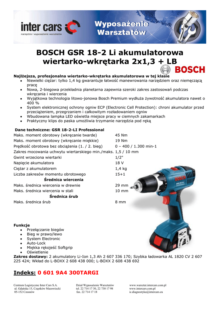 BOSCH GSR 18-2 Li akumulatorowa wiertarko-wkrętarka 2x1,3 + LB Najlżejsza, profesjonalna wiertarko-wkrętarka akumulatorowa w tej klasie Niewielki ciężar: tylko 1,4 kg gwarantuje łatwość manewrowania narzędziem oraz niemęczącą pracę Nowa, 2-biegowa przekładnia planetarna zapewnia szeroki zakres zastosowań podczas wkręcania i wiercenia Wyjątkowa technologia litowo-jonowa Bosch Premium wydłuża żywotność akumulatora nawet o 400 % System elektronicznej ochrony ogniw ECP (Electronic Cell Protection): chroni akumulator przed przeciążeniem, przegrzaniem i całkowitym rozładowaniem ogniw Wbudowana lampka LED oświetla miejsce pracy w ciemnych zakamarkach Praktyczny klips do paska umożliwia trzymanie narzędzia pod ręką Dane techniczne: GSR 18-2-LI Professional Maks. moment obrotowy (wkręcanie twarde) 45 Nm Maks. moment obrotowy (wkręcanie miękkie) 19 Nm Prędkość obrotowa bez obciążenia (1. / 2. bieg) 0 – 400 / 1.300 min-1 Zakres mocowania uchwytu wiertarskiego min./maks. 1,5 / 10 mm Gwint wrzeciona wiertarki 1/2" Napięcie akumulatora 18 V Ciężar z akumulatorem 1,4 kg Liczba zakresów momentu obrotowego 15+1 Średnica wiercenia Maks. średnica wiercenia w drewnie 29 mm Maks. średnica wiercenia w stali 10 mm Średnica śrub Maks. średnica śrub 8 mm Funkcje Przełączanie biegów Bieg w prawo/lewo System Electronic Auto-Lock Miękka rękojeść Softgrip Oświetlenie Zakres dostawy: 2 akumulatory Li-Ion 1,3 Ah 2 607 336 170; Szybka ładowarka AL 1820 CV 2 607 225 424; Wkład do L-BOXX 2 608 438 000; L-BOXX 2 608 438 692 Indeks: 0 601 9A4 300TARGI Centrum Logistyczne Inter Cars S.A. ul. Gdańska 15, Cząstków Mazowiecki 05-152 Czosnów Dział Wyposażenie Warsztatów tel. 22 714 17 30, 22 730 17 98 fax. 22 714 17 18 www.warsztat.intercars.com.pl www.intercars.com.pl [email protected]