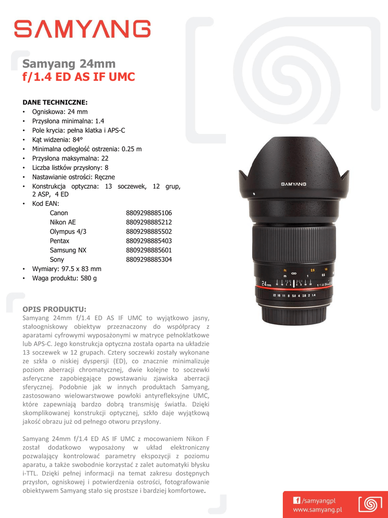 Samyang 24mm f/1.4 ED AS IF UMC DANE TECHNICZNE: • Ogniskowa: 24 mm • Przysłona minimalna: 1.4 • Pole krycia: pełna klatka i APS-C • Kąt widzenia: 84° • Minimalna odległość ostrzenia: 0.25 m • Przysłona maksymalna: 22 • Liczba listków przysłony: 8 • Nastawianie ostrości: Ręczne • Konstrukcja optyczna: 13 soczewek, 12 grup, 2 ASP, 4 ED • Kod EAN: Canon 8809298885106 Nikon AE 8809298885212 Olympus 4/3 8809298885502 Pentax 8809298885403 Samsung NX 8809298885601 Sony 8809298885304 • Wymiary: 97.5 x 83 mm • Waga produktu: 580 g OPIS PRODUKTU: Samyang 24mm f/1.4 ED AS IF UMC to wyjątkowo jasny, stałoogniskowy obiektyw przeznaczony do współpracy z aparatami cyfrowymi wyposażonymi w matryce pełnoklatkowe lub APS-C. Jego konstrukcja optyczna została oparta na układzie 13 soczewek w 12 grupach. Cztery soczewki zostały wykonane ze szkła o niskiej dyspersji (ED), co znacznie minimalizuje poziom aberracji chromatycznej, dwie kolejne to soczewki asferyczne zapobiegające powstawaniu zjawiska aberracji sferycznej. Podobnie jak w innych produktach Samyang, zastosowano wielowarstwowe powłoki antyrefleksyjne UMC, które zapewniają bardzo dobrą transmisję światła. Dzięki skomplikowanej konstrukcji optycznej, szkło daje wyjątkową jakośd obrazu już od pełnego otworu przysłony. Samyang 24mm f/1.4 ED AS IF UMC z mocowaniem Nikon F został dodatkowo wyposażony w układ elektroniczny pozwalający kontrolowad parametry ekspozycji z poziomu aparatu, a także swobodnie korzystad z zalet automatyki błysku i-TTL. Dzięki pełnej informacji na temat zakresu dostępnych przysłon, ogniskowej i potwierdzenia ostrości, fotografowanie obiektywem Samyang stało się prostsze i bardziej komfortowe.