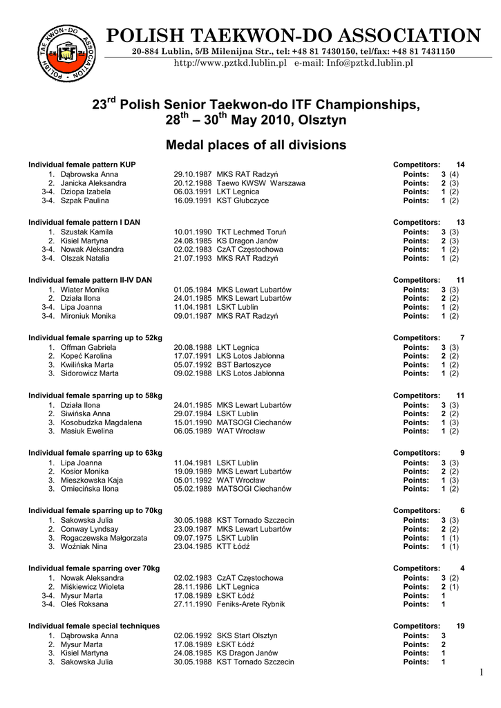 POLISH TAEKWON-DO ASSOCIATION 20-884 Lublin, 5/B Milenijna Str., tel: +48 81 7430150, tel/fax: +48 81 7431150 http://www.pztkd.lublin.pl e-mail: [email protected] 23rd Polish Senior Taekwon-do ITF Championships, 28th – 30th May 2010, Olsztyn Medal places of all divisions Individual female pattern KUP 1. Dąbrowska Anna 2. Janicka Aleksandra 3-4. Dziopa Izabela 3-4. Szpak Paulina 29.10.1987 20.12.1988 06.03.1991 16.09.1991 MKS RAT Radzyń Taewo KWSW Warszawa LKT Legnica KST Głubczyce Competitors: Points: 3 Points: 2 Points: 1 Points: 1 14 (4) (3) (2) (2) Individual female pattern I DAN 1. Szustak Kamila 2. Kisiel Martyna 3-4. Nowak Aleksandra 3-4. Olszak Natalia 10.01.1990 24.08.1985 02.02.1983 21.07.1993 TKT Lechmed Toruń KS Dragon Janów CzAT Częstochowa MKS RAT Radzyń Competitors: Points: 3 Points: 2 Points: 1 Points: 1 13 (3) (3) (2) (2) Individual female pattern II-IV DAN 1. Wiater Monika 2. Działa Ilona 3-4. Lipa Joanna 3-4. Mironiuk Monika 01.05.1984 24.01.1985 11.04.1981 09.01.1987 MKS Lewart Lubartów MKS Lewart Lubartów LSKT Lublin MKS RAT Radzyń Competitors: Points: 3 Points: 2 Points: 1 Points: 1 11 (3) (2) (2) (2) Individual female sparring up to 52kg 1. Offman Gabriela 2. Kopeć Karolina 3. Kwilińska Marta 3. Sidorowicz Marta 20.08.1988 17.07.1991 05.07.1992 09.02.1988 LKT Legnica LKS Lotos Jabłonna BST Bartoszyce LKS Lotos Jabłonna Competitors: Points: 3 Points: 2 Points: 1 Points: 1 (3) (2) (2) (2) Individual female sparring up to 58kg 1. Działa Ilona 2. Siwińska Anna 3. Kosobudzka Magdalena 3. Masiuk Ewelina 24.01.1985 29.07.1984 15.01.1990 06.05.1989 MKS Lewart Lubartów LSKT Lublin MATSOGI Ciechanów WAT Wrocław Competitors: Points: 3 Points: 2 Points: 1 Points: 1 11 (3) (2) (3) (2) Individual female sparring up to 63kg 1. Lipa Joanna 2. Kosior Monika 3. Mieszkowska Kaja 3. Omiecińska Ilona 11.04.1981 19.09.1989 05.01.1992 05.02.1989 LSKT Lublin MKS Lewart Lubartów WAT Wrocław MATSOGI Ciechanów Competitors: Points: 3 Points: 2 Points: 1 Points: 1 (3) (2) (3) (2) Individual female sparring up to 70kg 1. Sakowska Julia 2. Conway Lyndsay 3. Rogaczewska Małgorzata 3. Woźniak Nina 30.05.1988 23.09.1987 09.07.1975 23.04.1985 KST Tornado Szczecin MKS Lewart Lubartów LSKT Lublin KTT Łódź Competitors: Points: 3 Points: 2 Points: 1 Points: 1 (3) (2) (1) (1) Individual female sparring over 70kg 1. Nowak Aleksandra 2. Miśkiewicz Wioleta 3-4. Mysur Marta 3-4. Oleś Roksana 02.02.1983 28.11.1986 17.08.1989 27.11.1990 CzAT Częstochowa LKT Legnica ŁSKT Łódź Feniks-Arete Rybnik Competitors: 4 Points: 3 (2) Points: 2 (1) Points: 1 Points: 1 Individual female special techniques 1. Dąbrowska Anna 2. Mysur Marta 3. Kisiel Martyna 3. Sakowska Julia 02.06.1992 17.08.1989 24.08.1985 30.05.1988 SKS Start Olsztyn ŁSKT Łódź KS Dragon Janów KST Tornado Szczecin Competitors: Points: 3 Points: 2 Points: 1 Points: 1 7 9 6 19 1 Individual female power test 1. Rogaczewska Małgorzata 2. Nowak Aleksandra 3. Omiecińska Ilona 3. Zając Ewelina Team Female Pattern 1. MKS RAT Radzyń 2. LSKT Lublin 3-4. LKT Legnica 3-4. MATSOGI Ciechanów 09.07.1975 02.02.1983 05.02.1989 04.12.1985 LSKT Lublin CzAT Częstochowa MATSOGI Ciechanów WSKT Wrocław Team Female Sparring 1. MKS Lewart Lubartów 2. LKT Legnica 3-4. MATSOGI Ciechanów 3-4. MKS RAT Radzyń Competitors: 21 Points: 3 Points: 2 Points: 1 Points: 1 Teams: 5 Points: 3 (2) Points: 2 (1) Points: 1 (1) Points: 1 Teams: Points: Points: Points: Points: 7 3 2 1 1 (2) (2) (1) (1) Individual male pattern I DAN 1. Wronowski Marcin 2. Dudek Dawid 3-4. Dąbrowski Paweł 3-4. Forgiel Karol 23.06.1986 14.02.1987 20.06.1991 17.12.1988 MKS Lewart Lubartów MKS Lewart Lubartów LKT Legnica LKT Legnica Competitors: Points: 3 Points: 2 Points: 1 Points: 1 15 (4) (3) (2) (2) Individual male pattern II DAN 1. Raczyński Kamil 2. Ciężki Łukasz 3-4. Idzikowski Dariusz 3-4. Szałkowski Grzegorz 23.08.1990 04.10.1985 17.11.1979 12.11.1988 WSKT Wrocław MKS RAT Radzyń SKS Start Olsztyn Feniks-Arete Rybnik Competitors: Points: 3 Points: 2 Points: 1 Points: 1 11 (4) (2) (2) (1) Individual male pattern III DAN 1. Szwejkowski Piotr 2. Szwejkowski Paweł 3-4. Cytryniak Michał 3-4. Karnawalski Wiktor 23.01.1983 23.01.1983 25.05.1974 13.01.1975 MATSOGI Ciechanów MATSOGI Ciechanów CTKD Łódź LZS BAT Bełchatów Competitors: Points: 3 Points: 2 Points: 1 Points: 1 (3) (2) (2) (1) Individual male pattern IV DAN 1. Suska Jarosław 2. Sudak Łukasz 3-4. Kamola Sławomir 3-4. Szczepaniuk Tomasz 18.10.1972 13.02.1980 29.03.1974 29.12.1971 MKS Lewart Lubartów WSKT Wrocław LSKT Lublin LKS Lotos Jabłonna Competitors: 4 Points: 3 (2) Points: 2 (1) Points: 1 Points: 1 Individual male pattern KUP 1. Cur Tomasz 2. Chudzik Daniel 3-4. Dąbrowski Tomasz 3-4. Dudek Tomasz 04.07.1991 05.02.1993 06.07.1989 06.11.1990 MKS Lewart Lubartów LKS Lotos Jabłonna MKS RAT Radzyń KS Dragon Janów Competitors: Points: 3 Points: 2 Points: 1 Points: 1 13 (4) (2) (1) (2) Individual male sparring up to 54kg 1. Wadowski Artur 2. Cur Tomasz 3. Góra Tomasz 3. Łuszcz Piotr 17.02.1990 04.07.1991 20.11.1989 20.06.1990 MKS Lewart Lubartów MKS Lewart Lubartów CzAT Częstochowa LKS Lotos Jabłonna Competitors: Points: 3 Points: 2 Points: 1 Points: 1 (3) (2) (1) (2) Individual male sparring up to 63kg 1. Raczyński Kamil 2. Szwejkowski Paweł 3. Dąbrowski Paweł 3. Forgiel Karol 23.08.1990 23.01.1983 20.06.1991 17.12.1988 WSKT Wrocław MATSOGI Ciechanów LKT Legnica LKT Legnica Competitors: Points: 3 Points: 2 Points: 1 Points: 1 11 (3) (3) (3) (3) Individual male sparring up to 71kg 1. Wasilewski Piotr 2. Wronowski Marcin 3. Niechwiej Mateusz 3. Osuchowski Artur 08.10.1984 23.06.1986 17.06.1990 28.10.1985 Taewo KWSW Warszawa MKS Lewart Lubartów LKT Legnica KS Dragon Janów Competitors: Points: 3 Points: 2 Points: 1 Points: 1 16 (4) (3) (4) (3) 9 7 2 Individual male sparring up to 80kg 1. Dziubicki Michał 2. Sudak Łukasz 3. Dudek Tomasz 3. Zazulak Radosław 07.09.1983 1