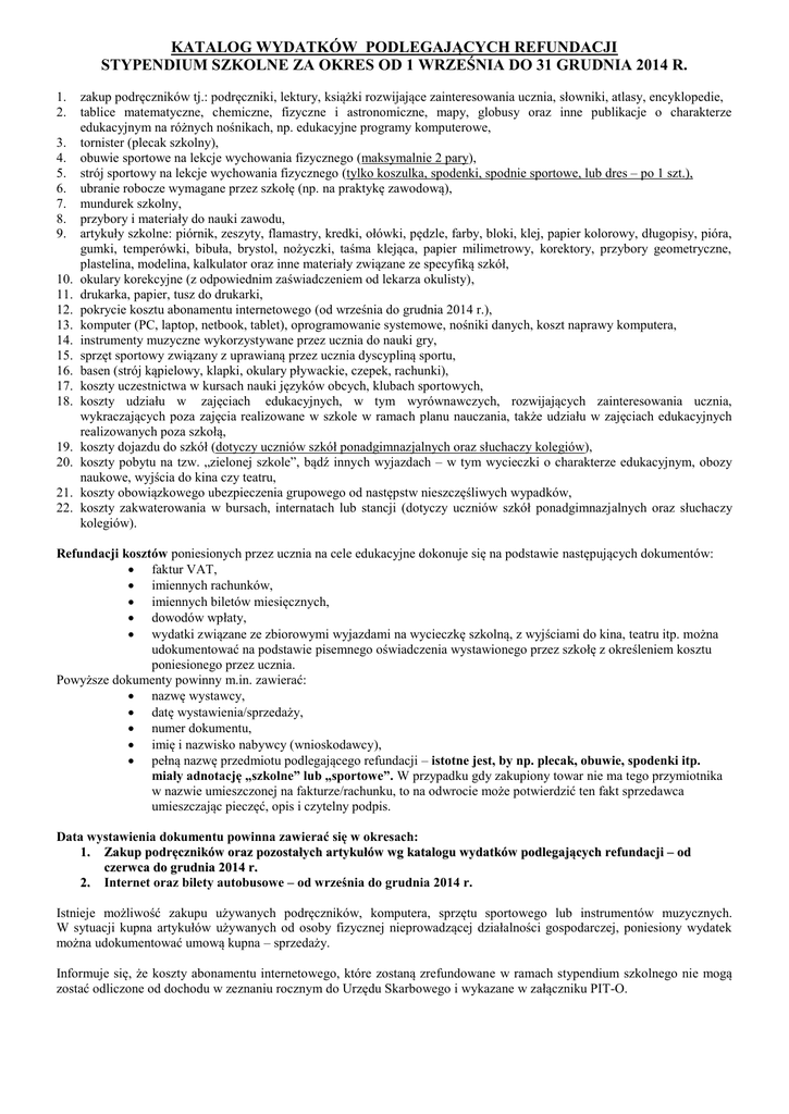 KATALOG WYDATKÓW PODLEGAJĄCYCH REFUNDACJI STYPENDIUM SZKOLNE ZA OKRES OD 1 WRZEŚNIA DO 31 GRUDNIA 2014 R. 1. 2. 3. 4. 5. 6. 7. 8. 9. 10. 11. 12. 13. 14. 15. 16. 17. 18. 19. 20. 21. 22. zakup podręczników tj.: podręczniki, lektury, książki rozwijające zainteresowania ucznia, słowniki, atlasy, encyklopedie, tablice matematyczne, chemiczne, fizyczne i astronomiczne, mapy, globusy oraz inne publikacje o charakterze edukacyjnym na różnych nośnikach, np. edukacyjne programy komputerowe, tornister (plecak szkolny), obuwie sportowe na lekcje wychowania fizycznego (maksymalnie 2 pary), strój sportowy na lekcje wychowania fizycznego (tylko koszulka, spodenki, spodnie sportowe, lub dres – po 1 szt.), ubranie robocze wymagane przez szkołę (np. na praktykę zawodową), mundurek szkolny, przybory i materiały do nauki zawodu, artykuły szkolne: piórnik, zeszyty, flamastry, kredki, ołówki, pędzle, farby, bloki, klej, papier kolorowy, długopisy, pióra, gumki, temperówki, bibuła, brystol, nożyczki, taśma klejąca, papier milimetrowy, korektory, przybory geometryczne, plastelina, modelina, kalkulator oraz inne materiały związane ze specyfiką szkół, okulary korekcyjne (z odpowiednim zaświadczeniem od lekarza okulisty), drukarka, papier, tusz do drukarki, pokrycie kosztu abonamentu internetowego (od września do grudnia 2014 r.), komputer (PC, laptop, netbook, tablet), oprogramowanie systemowe, nośniki danych, koszt naprawy komputera, instrumenty muzyczne wykorzystywane przez ucznia do nauki gry, sprzęt sportowy związany z uprawianą przez ucznia dyscypliną sportu, basen (strój kąpielowy, klapki, okulary pływackie, czepek, rachunki), koszty uczestnictwa w kursach nauki języków obcych, klubach sportowych, koszty udziału w zajęciach edukacyjnych, w tym wyrównawczych, rozwijających zainteresowania ucznia, wykraczających poza zajęcia realizowane w szkole w ramach planu nauczania, także udziału w zajęciach edukacyjnych realizowanych poza szkołą, koszty dojazdu do szkół (dotyczy uczniów szkół ponadgimnazjalnych oraz słuchaczy kolegiów), koszty pobytu na tzw. „zielonej szkole”, bądź innych wyjazdach – w tym wycieczki o charakterze edukacyjnym, obozy naukowe, wyjścia do kina czy teatru, koszty obowiązkowego ubezpieczenia grupowego od następstw nieszczęśliwych wypadków, koszty zakwaterowania w bursach, internatach lub stancji (dotyczy uczniów szkół ponadgimnazjalnych oraz słuchaczy kolegiów). Refundacji kosztów poniesionych przez ucznia na cele edukacyjne dokonuje się na podstawie następujących dokumentów: faktur VAT, imiennych rachunków, imiennych biletów miesięcznych, dowodów wpłaty, wydatki związane ze zbiorowymi wyjazdami na wycieczkę szkolną, z wyjściami do kina, teatru itp. można udokumentować na podstawie pisemnego oświadczenia wystawionego przez szkołę z określeniem kosztu poniesionego przez ucznia. Powyższe dokumenty powinny m.in. zawierać: nazwę wystawcy, datę wystawienia/sprzedaży, numer dokumentu, imię i nazwisko nabywcy (wnioskodawcy), pełną nazwę przedmiotu podlegającego refundacji – istotne jest, by np. plecak, obuwie, spodenki itp. miały adnotację „szkolne” lub „sportowe”. W przypadku gdy zakupiony towar nie ma tego przymiotnika w nazwie umieszczonej na fakturze/rachunku, to na odwrocie może potwierdzić ten fakt sprzedawca umieszczając pieczęć, opis i czytelny podpis. Data wystawienia dokumentu powinna zawierać się w okresach: 1. Zakup podręczników oraz pozostałych artykułów wg katalogu wydatków podlegających refundacji – od czerwca do grudnia 2014 r. 2. Internet oraz bilety autobusowe – od września do grudnia 2014 r. Istnieje możliwość zakupu używanych podręczników, komputera, sprzętu sportowego lub instrumentów muzycznych. W sytuacji kupna artykułów używanych od osoby fizycznej nieprowadzącej działalności gospodarczej, poniesiony wydatek można udokumentować umową kupna – sprzedaży. Informuje się, że koszty abonamentu internetowego, które zostaną zrefundowane w ramach stypendium szkolnego nie mogą zostać odliczone od dochodu w zeznaniu rocznym do Urzędu Skarbowego i wykazane w załączniku PIT-O.