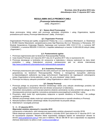 Bronisze, dnia 30 grudnia 2016 roku Aktualizacja z dnia 11 stycznia 2017 roku REGULAMIN AKCJI PROMOCYJNEJ „Promocja kalendarzowa” (dalej: „Regulamin”) § 1. Nazwa Akcji Promocyjnej Akcja promocyjna, której celem jest promocja sprzedaży produktów i usług Organizatora, będzie prowadzona pod nazwą „Promocja kalendarzowa” (dalej: „Promocja”). § 2. Organizator Promocji Organizatorem Promocji jest spółka Jungheinrich Polska Sp. z o.o. z siedzibą w Broniszach, ul. Świerkowa 3, 05-850 Ożarów Mazowiecki, zarejestrowana przez Sąd Rejonowy dla m.st. Warszawy w Warszawie, XIV Wydział Gospodarczy Krajowego Rejestru Sądowego pod numerem KRS 0000137163, o numerze NIP 1130082801, o numerze REGON 010465346, o kapitale zakładowym w kwocie 13.000.000,00 złotych (dalej: „Organizator”). § 3. Postanowienia ogólne 1. Promocja organizowana jest na terytorium Rzeczpospolitej Polskiej. 2. Czas trwania Promocji: od 2 stycznia 2017 roku do 31 grudnia 2017 roku w wyznaczone dni. 3. Promocja obowiązuje w konkretne dni oznaczone w kalendarzu i dotyczy wybranych na dany dzień produktów i usług. Kalendarium promocji zamieszczone jest na stronie internetowej http://www.jungheinrich.pl/produkty/wozki-widlowe/oferty-specjalne/ § 4. Uczestnicy Promocji 1. Promocja przeznaczona jest wyłącznie dla osób prawnych lub osób fizycznych prowadzących działalność gospodarczą na terytorium Rzeczypospolitej Polskiej o nienagannej dyscyplinie płatniczej tj. nieposiadających zadłużenia wg ksiąg rachunkowych Organizatora lub regulujących zobowiązania wobec Organizatora w formie płatności „z góry” lub „przy dostawie” (dalej: klient). 2. Promocja nie dotyczy zakupów produktów i usług Organizatora w celach ich odsprzedaży. § 5. Zasady Promocji 1. Promocja polega na przyznaniu klientowi określonego rabatu przy zakupie określonego produktu lub usługi Organizatora w konkretnym dniu lub okresie oznaczonym w kalendarzu. 2. Warunkiem skorzystania z promocji jest pisemne złożenie zamówienia na dany produkt lub usługę w dniu obowiązywania promocji zgodnie z procedurą zamawiania poszczególnych produktów i usług. 3. Przyznany rabat może być wykorzystany wyłącznie w sposób określony w Promocji i nie podlega wymianie na gotówkę. 4. Wartość przyznanego rabatu może być wykorzystana jednorazowo w sposób określony w Promocji. 5. Niewykorzystana wartość udzielonego rabatu nie przechodzi na przyszłe zakupy. 6. Kalendarium i szczegóły promocji: 1) 2 – 31 stycznia 2017r. Wyprzedaż wózków używanych z rocznika 2016 (oznaczenie w kalendarzu: start miesięcznej wyprzedaży wózków używanych rocznika 2016) Oferta obejmuje wybrane używane wózki widłowe z rocznika 2016 i jest ważna do 31 stycznia 2017r. lub do wyczerpania zapasów. Aktualna oferta wyprzedaży dostępna będzie we wskazanym okresie na stronie www.jungheinrich.com.pl oraz pod nr telefonu +48 22 355 89 91 lub w odpowiedzi na zapytania ofertowe skierowane na adres e-mail: [email protected]. 2) 23 stycznia 2017r. 5% rabatu na zakup części zamiennych do naprawy regałów magazynowych po przeglądzie eksperckim (oznaczenie w kalendarzu: 5% rabatu na zakup części regałowych do naprawy po przeglądzie) Oferta obejmuje przyznanie rabatu w wysokości 5% od ceny netto z cennika Organizatora na zakup wszystkich części zamiennych niezbędnych do naprawy regałów magazynowych po uprzednio wykonanym przez Organizatora przeglądzie eksperckim regałów magazynowych klienta. Warunkiem przyznania rabatu jest otrzymanie przez Organizatora w dniu obowiązywania Promocji skutecznego zamówienia na zakup w/w części. 3) 8 lutego 2017r. i 5 września 2017r. Rabat w wysokości 500 zł netto na usługę wynajmu krótkoterminowego przy zawarciu nowej umowy wynajmu długoterminowego (oznaczenie w kalendarzu: do każdego kontraktu na wynajem długoterminowy voucher 500 zł na wynajem krótkoterminowy) Oferta obejmuje przyznanie rabatu w wysokości 500 zł. (pięćset złotych 00/100) netto od ceny z cennika wynajmu wózków widłowych Organizatora na usługę wynajmu krótkoterminowego wózka widłowego, z wyłączeniem transportu urządzenia. Przyznany rabat dotyczy jednorazowej, nowej usługi wynajmu krótkoterminowego zamówionej i wykonanej w okresie od dnia zawarcia umowy wynajmu długoterminowego do dnia 31 grudnia 2017r. 4) 3 marca 2017r. Przegląd akumulatora trakcyjnego w cenie 99 zł netto (usługa wraz z dojazdem) (oznaczenie w kalendarzu: przegląd akumulatora trakcyjnego w cenie 99 zł (usługa wraz z dojazdem) dla pierwszych 100 zleceń przesłanych tego dnia) Oferta obejmuje jeden przegląd konserwacyjny jednego akumulatora trakcyjnego wraz z dojazdem do klienta w cenie ryczałtowej 99 zł. (dziewięćdziesiąt dziewięć złotych 00/100) netto zamówiony w dniu obowiązywania Promocji i wykonany do dnia 31 grudnia 2017r. Oferta dotyczy 100 pierwszych otrzymanych przez Organizatora w dniu obowiązywania Promocji, zamówień na wykonanie w/w usługi. Zamówienie winno zostać skutecznie wysłane na aktywny adres mailowy Organizatora o strukturze: [email protected] lub [email protected] – decyduje kolejność wpływu zamówień identyfikowana wg daty i godziny otrzymania zamówienia, określonej w poczcie elektronicznej Organizatora. 5) 20 marca 2017r. Rabat w postaci pierwszego przeglądu konserwacyjnego przy zakupie nowego wózka widłowego unoszącego typ Ameise SPM 113 (oznaczenie w kalendarzu: przy zakupie wózka unoszącego Ameise SPM 113 pierwszy przegląd techniczny gratis) Oferta dotyczy skutecznego zakupu w sklepie internetowym Jungheinrich Profishop www.jh-online.pl w dniu obowiązywania Promocji, wózka widłowego unoszącego typ Ameise SPM 113, cena którego zawiera pierwszy przegląd konserwacyjny (gwarancyjny), który zostanie wykonany przez Organizatora zgodnie z instrukcją obsługi, nie później jednak niż do dnia 31 grudnia 2017r. 6) 5 kwietnia 2017r., 4 lipca 2017r.