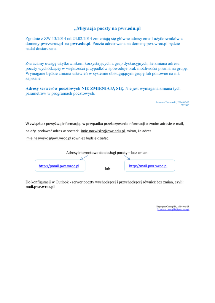 „Migracja poczty na pwr.edu.pl Zgodnie z ZW 13/2014 od 24.02.2014 zmieniają się główne adresy email użytkowników z domeny pwr.wroc.pl na pwr.edu.pl. Poczta adresowana na domenę pwr.wroc.pl będzie nadal dostarczana. Zwracamy uwagę użytkownikom korzystających z grup dyskusyjnych, że zmiana adresu poczty wychodzącej w większości przypadków spowoduje brak możliwości pisania na grupę. Wymagane będzie zmiana ustawień w systemie obsługującym grupę lub ponowne na niż zapisane. Adresy serwerów pocztowych NIE ZMIENIAJĄ SIĘ. Nie jest wymagana zmiana tych parametrów w programach pocztowych. Ireneusz Tarnowski, 2014-02-12 WCSS” W związku z powyższą informacją, w przypadku przekazywania informacji o swoim adresie e-mail, należy podawać adres w postaci: [email protected], mimo, że adres [email protected] również będzie działać. Adresy internetowe do obsługi poczty – bez zmian: http://pmail.pwr.wroc.pl lub http://mail.pwr.wroc.pl Do konfiguracji w Outlook - serwer poczty wychodzącej i przychodzącej również bez zmian, czyli: mail.pwr.wroc.pl Krystyna Czemplik, 2014-02-28 [email protected]