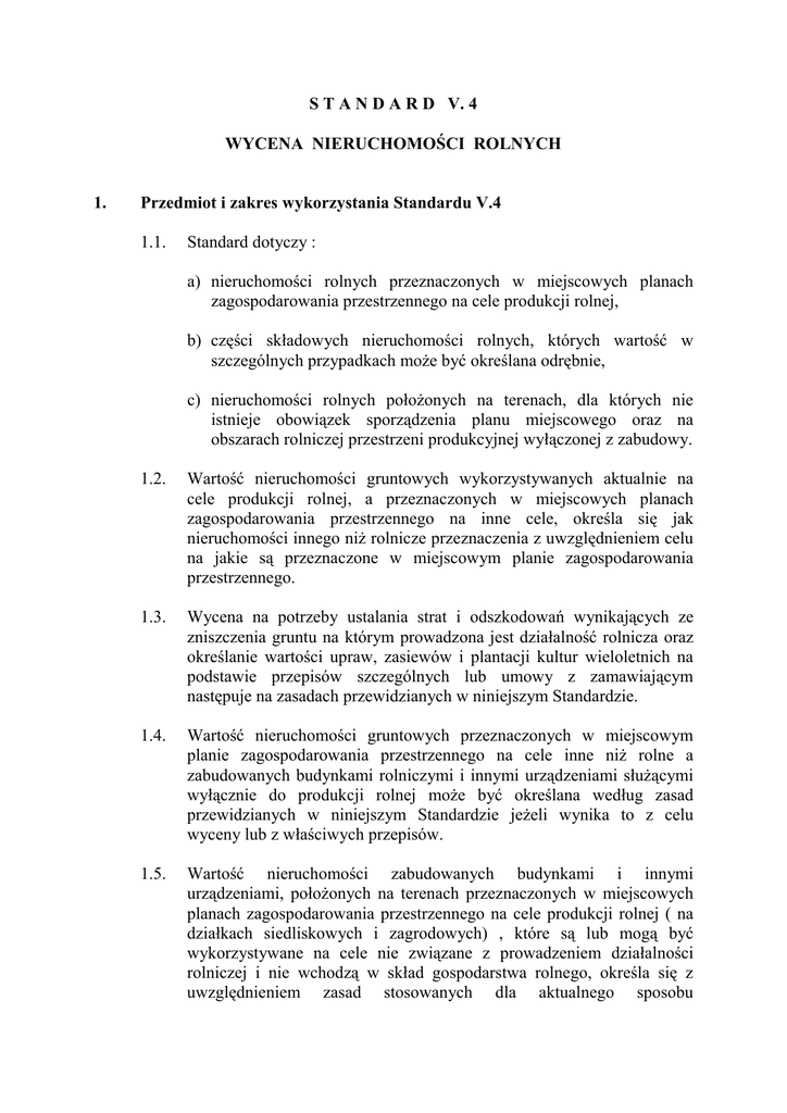 S T A N D A R D V. 4 WYCENA NIERUCHOMOŚCI ROLNYCH 1. Przedmiot i zakres wykorzystania Standardu V.4 1.1. Standard dotyczy : a) nieruchomości rolnych przeznaczonych w miejscowych planach zagospodarowania przestrzennego na cele produkcji rolnej, b) części składowych nieruchomości rolnych, których wartość w szczególnych przypadkach moŜe być określana odrębnie, c) nieruchomości rolnych połoŜonych na terenach, dla których nie istnieje obowiązek sporządzenia planu miejscowego oraz na obszarach rolniczej przestrzeni produkcyjnej wyłączonej z zabudowy. 1.2. Wartość nieruchomości gruntowych wykorzystywanych aktualnie na cele produkcji rolnej, a przeznaczonych w miejscowych planach zagospodarowania przestrzennego na inne cele, określa się jak nieruchomości innego niŜ rolnicze przeznaczenia z uwzględnieniem celu na jakie są przeznaczone w miejscowym planie zagospodarowania przestrzennego. 1.3. Wycena na potrzeby ustalania strat i odszkodowań wynikających ze zniszczenia gruntu na którym prowadzona jest działalność rolnicza oraz określanie wartości upraw, zasiewów i plantacji kultur wieloletnich na podstawie przepisów szczególnych lub umowy z zamawiającym następuje na zasadach przewidzianych w niniejszym Standardzie. 1.4. Wartość nieruchomości gruntowych przeznaczonych w miejscowym planie zagospodarowania przestrzennego na cele inne niŜ rolne a zabudowanych budynkami rolniczymi i innymi urządzeniami słuŜącymi wyłącznie do produkcji rolnej moŜe być określana według zasad przewidzianych w niniejszym Standardzie jeŜeli wynika to z celu wyceny lub z właściwych przepisów. 1.5. Wartość nieruchomości zabudowanych budynkami i innymi urządzeniami, połoŜonych na terenach przeznaczonych w miejscowych planach zagospodarowania przestrzennego na cele produkcji rolnej ( na działkach siedliskowych i zagrodowych) , które są lub mogą być wykorzystywane na cele nie związane z prowadzeniem działalności rolniczej i nie wchodzą w skład gospodarstwa rolnego, określa się z uwzględnieniem zasad stosowanych dla aktualnego sposobu uŜytkowania – jeŜeli występuje zgodność realizowanej funkcji w szczególności z przepisami o planowaniu przestrzennym, o ochronie gruntów rolnych i leśnych oraz przepisami prawa budowlanego. 2. 1.6. Przedmiotem wyceny według zasad niniejszego Standardu jest nieruchomość rolna jako przedmiot prawa własności lub jako przedmiot prawa uŜytkowania wieczystego, uŜytkowania oraz uŜytkowania wkładu gruntowego w rolniczej spółdzielni produkcyjnej. 1.7. Zasady określone w niniejszym Standardzie stosuje się odpowiednio do wyceny na potrzeby ustalania strat i odszkodowań wynikających ze zniszczenia gruntu oraz określania wartości upraw, zasiewów i plantacji kultur wieloletnich zlokalizowanych na gruntach wykorzystywanych jako pracownicze ogrody działkowe, ogrody przydomowe oraz działki przyzagrodowe członków rolniczej spółdzielni produkcyjnej. 1.8. Budynki mieszkalne wchodzące w skład gospodarstwa rolnego podlegają wycenie na zasadach przewidzianych w niniejszym Standardzie. Nieruchomości rolne ich cechy i definicje. 2.1. Do cech nieruchomości rolnych w rozumieniu niniejszego Standardu naleŜą w szczególności: Dla nieruchomości niezabudowanych i nie przeznaczonych pod zabudowę : a) lokalizacja i połoŜenie, b) róŜnorodność rodzajów uŜytków gruntowych, c) róŜnorodność utworów tworzących glebę i jej oŜywiony charakter, d) występowanie gleb o róŜnej przydatności rolniczej, e) występowanie szczególnych cech określających zdolności produkcyjne gleb w tym zagroŜenie erozją, przydatność do produkcji określonych roślin, kultura gleb, trudność uprawy, kamienistość, f) wyposaŜenie w budowle i urządzenia słuŜące produkcji rolnej, g) moŜliwość innego, niŜ rolnicze, wykorzystania. Dla nieruchomości zabudowanych lub przeznaczonych do zabudowy : h) lokalizacja i połoŜenie, i) róŜnorodność istniejącej lub moŜliwej zabudowy oraz stan tej zabudowy, j) występowanie gruntów o róŜnej przydatności do zabudowy, k) wyposaŜenie w sieci infrastruktury technicznej. 2.2. Uprawami i zasiewami są rolnicze plantacje roślinne jednoroczne oraz jeŜeli przepis szczególny nie stanowi inaczej, plantacje roślin dwuletnich lub plantacje roślin wieloletnich. 2.3. Kulturami wieloletnimi są rolnicze plantacje roślinne: zielne, krzewinkowe, krzewiaste i drzewiaste, a w szczególności sady, plantacje, szkółki roślin sadowniczych i ozdobnych, plantacje nasienne roślin wieloletnich. 2.4. Budynkami rolniczymi są budynki związane z prowadzeniem działalności rolniczej w gospodarstwie rolnym, w tym słuŜące do produkcji, przechowywania środków produkcji i magazynowania produktów rolniczych. 2.5. Budowlami rolniczymi są budowle dla potrzeb rolnictwa przechowalnictwa produktów rolnych, w szczególności takie jak: a) b) c) d) e) f) 2.6. i zbiorniki na płynne odchody zwierzęce, płyty do składowania obornika, silosy na kiszonkę, silosy na zboŜe i paszę, komory fermentacyjne, zbiorniki biogazu. Do części składowych gruntu rolnego zalicza się w szczególności: a) b) c) d) e) budynki i budowle rolnicze, budynki mieszkalne wchodzące w skład gospodarstw rolnych, zasiewy i uprawy, plantacje kultur wieloletnich, drzewa i krzewy występujące na gruntach rolnych. 3. Zasady określania wartości. 3.1. Przedmiot wyceny winna stanowić nieruchomość rolna wraz z jej częściami składowymi. 3.2. JeŜeli z przepisów ustawy lub umowy z zamawiającym wycenę wynika, Ŝe z wyceny wyłączana jest określona część składowa nieruchomości gruntowej, w rozumieniu art. 48 kodeksu cywilnego lub grunt, powinno to być w operacie szacunkowym wyraźnie zaznaczone i uzasadnione. 3.3. Przedmiotem wyceny moŜe być takŜe sam grunt lub określona część składowa nieruchomości rolnej. W ten sposób wycenie mogą podlegać w szczególności: zasiewy, uprawy, planta