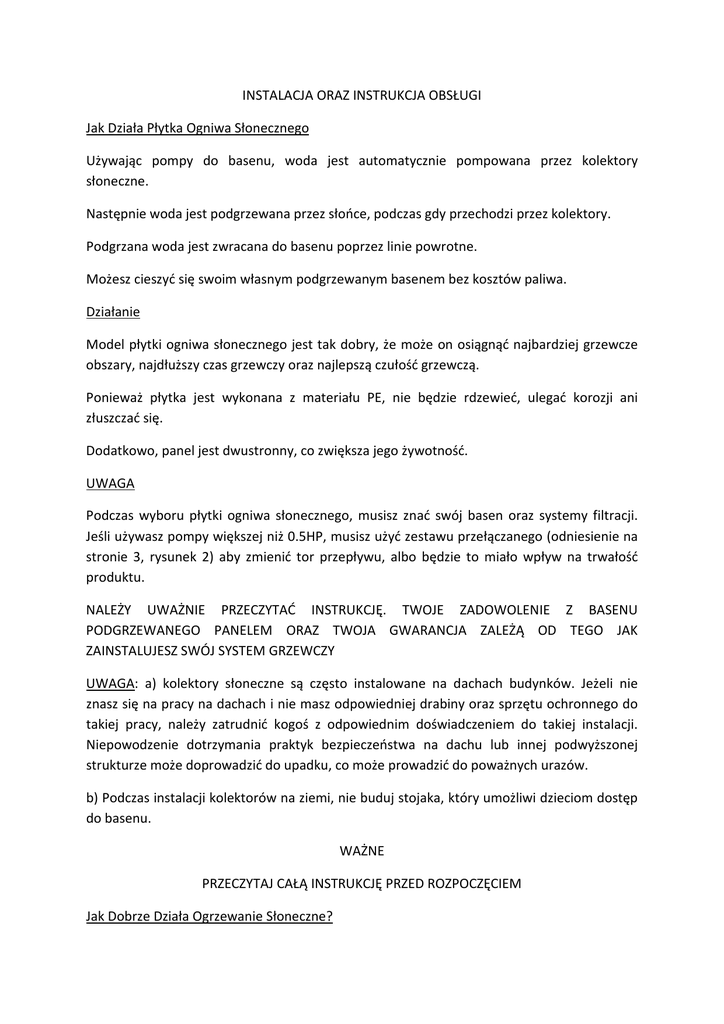 INSTALACJA ORAZ INSTRUKCJA OBSŁUGI Jak Działa Płytka Ogniwa Słonecznego Używając pompy do basenu, woda jest automatycznie pompowana przez kolektory słoneczne. Następnie woda jest podgrzewana przez słońce, podczas gdy przechodzi przez kolektory. Podgrzana woda jest zwracana do basenu poprzez linie powrotne. Możesz cieszyć się swoim własnym podgrzewanym basenem bez kosztów paliwa. Działanie Model płytki ogniwa słonecznego jest tak dobry, że może on osiągnąć najbardziej grzewcze obszary, najdłuższy czas grzewczy oraz najlepszą czułość grzewczą. Ponieważ płytka jest wykonana z materiału PE, nie będzie rdzewieć, ulegać korozji ani złuszczać się. Dodatkowo, panel jest dwustronny, co zwiększa jego żywotność. UWAGA Podczas wyboru płytki ogniwa słonecznego, musisz znać swój basen oraz systemy filtracji. Jeśli używasz pompy większej niż 0.5HP, musisz użyć zestawu przełączanego (odniesienie na stronie 3, rysunek 2) aby zmienić tor przepływu, albo będzie to miało wpływ na trwałość produktu. NALEŻY UWAŻNIE PRZECZYTAĆ INSTRUKCJĘ. TWOJE ZADOWOLENIE Z BASENU PODGRZEWANEGO PANELEM ORAZ TWOJA GWARANCJA ZALEŻĄ OD TEGO JAK ZAINSTALUJESZ SWÓJ SYSTEM GRZEWCZY UWAGA: a) kolektory słoneczne są często instalowane na dachach budynków. Jeżeli nie znasz się na pracy na dachach i nie masz odpowiedniej drabiny oraz sprzętu ochronnego do takiej pracy, należy zatrudnić kogoś z odpowiednim doświadczeniem do takiej instalacji. Niepowodzenie dotrzymania praktyk bezpieczeństwa na dachu lub innej podwyższonej strukturze może doprowadzić do upadku, co może prowadzić do poważnych urazów. b) Podczas instalacji kolektorów na ziemi, nie buduj stojaka, który umożliwi dzieciom dostęp do basenu. WAŻNE PRZECZYTAJ CAŁĄ INSTRUKCJĘ PRZED ROZPOCZĘCIEM Jak Dobrze Działa Ogrzewanie Słoneczne? Właściwie wymierzony oraz zainstalowany system podniesie temperaturę basenu do 100F w trakcie sezonu. Będziesz chciał utrzymywać cyrkulację wody przez kolektor słoneczny tylko kiedy świeci słońce, Kiedy jest pochmurno lub deszczowo, nie będzie on działać tak dobrze (i prawdopodobnie nie będziesz wówczas pływać), ale Twoja woda powróci do tej temperatury po jednym lub dwóch ciepłych dniach. Gdzie Mogę Założyć Kolektory Słoneczne? Gdziekolwiek gdzie otrzymasz co najmniej 6 godzin pełnego słońca w ciągu dnia. Im dłużej kolektory są na pełnym słońcu, tym lepiej będą pracować. Jeśli montujesz płytkę pod kątem (jak na dachu czy na wieszaku), kolektory powinny być skierowane w kierunku południowym. Jakich dodatkowych części będę potrzebować do zainstalowania systemu słonecznego na dachu? Musisz wybrać różne dodatkowe elementy zestawu do zainstalowania swoich systemów, oraz kupić Zestaw Przełączany oraz zestaw do montowania na dachu. OSTRZEŻENIE! Podczas montowania na wieszaku umieszczonym na ziemi, ustaw wieszak tak, aby nie dostarczał dostępu do basenu dzieciom. ZESTAW ELEMENTÓW 647060171001 ELEMENT STANDARDOWY NUMER ELEMENTU OPIS ILOŚĆ 1 PIERŚCIEŃ O 3 2 ZACISK 1-1/2’’S.S 2 3 ZACISK 1-3/4’’S.S 2 4 MAŁE KOLANKO 1 5 DUŻE KOLANKO 1 647060171002 ZESTAW PRZEŁĄCZANY NUMER ELEMENTU OPIS ILOŚĆ 1 ZAWÓR Z 3 WYJŚCIAMI 1 2 1 ½ ‘’ gwintowy zawór zwrotny 1 3 1 ½ ‘’ gwintowy kołek 1 4 1 ½ ‘’ gwintowe złącze z bolcem 1 5 1 ½ ‘’ gwintowe złącze bez bolca 1 6 PIERŚCIEŃ O 3 kupowane osobno 647060171003 ZESTAW DO MONTAŻU NA DACHHU NUMER ELEMENTU OPIS ILOŚĆ 1 RAMA ALUMINIOWA 12 2 GUMOWA USZCZELKA 36 3 ŚRUBY 36 kupowane osobno 647060171004 ELEMENT STANDARDOWY NUMER ELEMENTU OPIS ILOŚĆ 1 PIERŚCIEŃ O 3 2 ZACISK 1-1/2’’S.S 2 3 ZACISK 1-3/4’’S.S 2 4 MAŁE KOLANKO 1 5 DUŻE KOLANKO 1 6 WARSTWA REGULACYJNA 2 UKŁAD SYSTEMU UWAGA: Jeżeli nie znasz się na pracy na dachach i nie masz odpowiedniej drabiny oraz sprzętu ochronnego do takiej pracy, należy zatrudnić kogoś z odpowiednim doświadczeniem do takiej instalacji. Niepowodzenie dotrzymania praktyk bezpieczeństwa na dachu lub innej podwyższonej strukturze może doprowadzić do upadku, co może prowadzić do poważnych urazów. OSTRZEŻENIE: NIE WOLNO CHODZIĆ PO INSTALACJACH KOLEKTORÓW WŁONECZNYCH NA DACHACH: Sugeruje się, aby używać sztywnych rur PCV do instalacji na dachach. Kolektory powinny opadać nieco w kierunku punktu wlotu (tam gdzie woda wchodzi do kolektorów) aby zezwolić na drenaż. Rys.7 Istniejąca nasadka rury, wysadzony dla części połączenia Rys.3 1. Zdejmij czerwoną końcówkę ochronną. 2. Załóż pierścień O na końcówkę z bolcem (wytrzyj smar silikonowy). 3. Włóż końcówkę z bolcem do końcówki bez bolca (dopasuj otwór). 4. Przekręć główną rurę, oraz umocuj ją. Połącz z rurą gwintową 1 ½ ‘’. Rys.5 przegroda, wysadzona dla części połączenia Rys.6 Wysadzony dla części połączenia Rys.1 1. Zdejmij czerwoną osłonkę. 2. Załóż pierścień O na końcówkę z bolcem (wytrzyj smar silikonowy). 3. Włóż końcówkę z bolcem do końcówki bez bolca (dopasuj otwór). 4. Przekręć główną rurę, oraz umocuj ją. Rys.2 Załóż pierścień O na końcówkę z bolcem (wytrzyj smar silikonowy). Połącz z rurą gwintową 1 ½ ‘’. Rys.4 1. Wyboruj 1/8’’ dziurę pilotażową na śruby dostarczone dla wszystkich wsporników. Śruby powinny być wystarczająco długie aby dosięgnąć miejsce pod dachem. Wstrzyknij hojną ilość szczeliwa silikonowego do dziur oraz do otaczających powierzchni dachu. Zamontuj wsporniki na dachu (jak pokazano). 2. Włóż śrubę przez aluminiową ramę oraz ustaw uszczelkę gumową, użyj wiertła śrubowego do przymocowania na dachu. Rys.8 Musisz dobrze znać swój basen oraz systemy filtracji, i jeżeli używasz pompy większej niż 0.5hp musisz użyć zestawu zaworu do zmienienia toru przepływu oraz uniknięcia panelu słonecznego w celu uzyskania dużego ciśnienia przepływu, albo wpłynie to na trw
