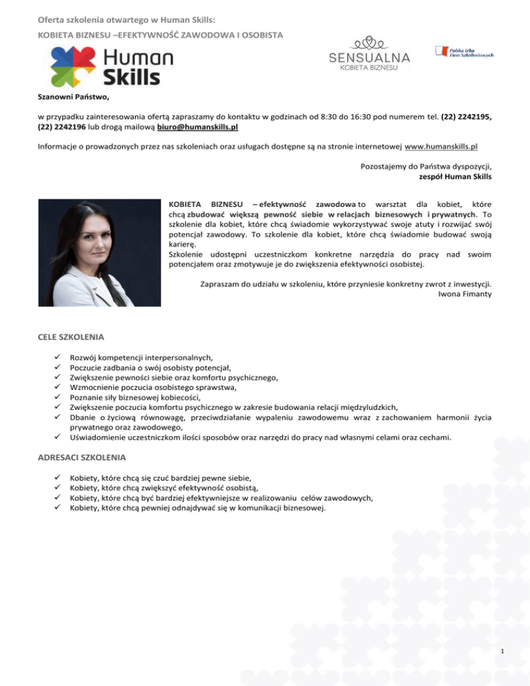 Oferta szkolenia otwartego w Human Skills: KOBIETA BIZNESU –EFEKTYWNOŚĆ ZAWODOWA I OSOBISTA Szanowni Państwo, w przypadku zainteresowania ofertą zapraszamy do kontaktu w godzinach od 8:30 do 16:30 pod numerem tel. (22) 2242195, (22) 2242196 lub drogą mailową [email protected] Informacje o prowadzonych przez nas szkoleniach oraz usługach dostępne są na stronie internetowej www.humanskills.pl Pozostajemy do Państwa dyspozycji, zespół Human Skills KOBIETA BIZNESU – efektywność zawodowa to warsztat dla kobiet, które chcą zbudować większą pewność siebie w relacjach biznesowych i prywatnych. To szkolenie dla kobiet, które chcą świadomie wykorzystywać swoje atuty i rozwijać swój potencjał zawodowy. To szkolenie dla kobiet, które chcą świadomie budować swoją karierę. Szkolenie udostępni uczestniczkom konkretne narzędzia do pracy nad swoim potencjałem oraz zmotywuje je do zwiększenia efektywności osobistej. Zapraszam do udziału w szkoleniu, które przyniesie konkretny zwrot z inwestycji. Iwona Fimanty CELE SZKOLENIA Rozwój kompetencji interpersonalnych, Poczucie zadbania o swój osobisty potencjał, Zwiększenie pewności siebie oraz komfortu psychicznego, Wzmocnienie poczucia osobistego sprawstwa, Poznanie siły biznesowej kobiecości, Zwiększenie poczucia komfortu psychicznego w zakresie budowania relacji międzyludzkich, Dbanie o życiową równowagę, przeciwdziałanie wypaleniu zawodowemu wraz z zachowaniem harmonii życia prywatnego oraz zawodowego, Uświadomienie uczestniczkom ilości sposobów oraz narzędzi do pracy nad własnymi celami oraz cechami. ADRESACI SZKOLENIA Kobiety, które chcą się czuć bardziej pewne siebie, Kobiety, które chcą zwiększyć efektywność osobistą, Kobiety, które chcą być bardziej efektywniejsze w realizowaniu celów zawodowych, Kobiety, które chcą pewniej odnajdywać się w komunikacji biznesowej. 1 Oferta szkolenia otwartego w Human Skills: KOBIETA BIZNESU –EFEKTYWNOŚĆ ZAWODOWA I OSOBISTA PROGRAM SZKOLENIA I DZIEŃ SZKOLENIA 09:00 – 09:30 Rozpoczęcie szkolenia. Wstęp – omówienie celów szkolenia oraz potrzeb uczestniczek. 09:30 – 12:30 Moduł I KOBIETA ŚWIADOMA – kolor osobowości zgodnie z typologią G. Junga (test indywidualny, omówienie wyników) pod kątem pobudzenia świadomości dotyczącej: a) Jak wykorzystać własny styl preferencji postrzegania otoczenia? b) Jak wykorzystać swoje mocne strony? c) Jak zneutralizować swoje słabsze strony? Komunikacja w biznesie z praktycznym użyciem typologii osobowości i z uwzględnieniem psychologii płci w kontekście budowania wizerunku kompetentnego pracownika. 12:30 – 13:00 Przerwa obiadowa 13:00 – 15:30 Moduł II KOBIETA ALFA czyli: a) Jak być asertywną radząc sobie z wampirami energetycznymi? b) Jak zarządzać sobą w czasie i swoimi celami (matryca, zasady zarządzania czasem)? c) Jak radzić sobie ze stresem oraz emocjami w sytuacjach biznesowych? d) Jak się nie wypalić? e) Jak zwiększać swoją efektywność? 15:30 – 16:00 Podsumowanie pierwszego dnia szkolenia. II DZIEŃ SZKOLENIA 09:00 – 09:30 Rozpoczęcie szkolenia. Omówienie przemyśleń z pierwszego dnia szkolenia. 09:30 – 12:30 Moduł III KOBIETA SUKCESU – osobisty potencjał zawodowy czyli: a) Jak przeanalizować poziom siły kompetencji (bank kompetencji)? b) Jak świadomie budować wizerunek kompetentnej liderki realizując założenia pracodawcy? c) Jak umiejętnie sprzedawać swoje silne kompetencje (metoda STAR, PAR itp.)? d) Jak neutralizować i pracować nad obszarami do rozwoju? 12:30 – 13:10 Przerwa obiadowa 13:10 – 15:30 Moduł IV KOBIETA STRATEGICZNA – komunikacja interpersonalna i współpraca w biznesie z elementami perswazji: a) Jak się przygotować fizycznie oraz psychicznie do rozmowy z konkretnym rozmówcą? b) Jak dopasować komunikat do rozmówcy? c) Jakich używać zwrotów perswazyjnych? d) Jak komunikować się z różnymi typami osobowości na różnych szczeblach kariery? e) Jak komunikować się z mężczyznami a jak z kobietami biorąc pod uwagę zasadę precedencji? f) Jak negocjować i sprzedawać swoje rozwiązania? g) Jak prowadzić trudne rozmowy? 15:30 – 16:00 Podsumowanie szkolenia. Omówienie wniosków. 2 Oferta szkolenia otwartego w Human Skills: KOBIETA BIZNESU –EFEKTYWNOŚĆ ZAWODOWA I OSOBISTA METODA SZKOLENIOWA Szkolenie prowadzone zgodnie z cyklem Kolba oraz zgodnie z metodą ABL (Activity Based Learning). Uczestnicy będą brali udział w aktywizujących ćwiczeniach indywidualnych oraz grupowych poprzedzonych niezbędnym wprowadzeniem teoretycznym. Uczestnicy będą mieli również możliwość autodiagnozy oraz otrzymają feedback od trenera. Trener będzie przedstawiał merytorykę zgodnie z 3 kanałami przekazu informacji – wzrok, ruch, słuch. Panel dyskusyjny, ćwiczenia grupowe i indywidualne, prezentacja, odgrywanie ról, analiza przypadków i filmów poglądowych. OPINIE „Poznałam swoje mocne i słabe strony.”; „Dowiedziałam się, na co powinnam zwracać uwagę przy autoprezentacji w biznesie.”; „Ciekawe informacje o typach osobowości.”; „Podobała mi się część szkolenia dotycząca emocji.”; „Przydatna część o komunikacji z różnymi typami osobowości, od teraz będę na to zwracać uwagę w kontaktach biznesowych.”. TERMINY: zgodnie z harmonogramem. PROFIL TRENERA: przesyłamy jako dodatkowy załącznik. CENA STAŁA: 1390 zł netto (+23% VAT) Zwolnienie z VAT – jeżeli szkolenie będzie opłacone w 70% lub w całości ze środków publicznych. CENA ZAWIERA: 1. Szkolenie dla kobiet biznesu jest prowadzone przez praktyka – trenera i psychologa z wieloletnim doświadczeniem. 2. Materiały szkoleniowe o tym jak być sensualną kobietą biznesu - w formie książki szkoleniowej (około 60 stron) zawierającej merytorykę, ćwiczenia, dobre rady, spis literatury. 3. Pakiet konferencyjny – notes, długopis, teczka. 4. Przerwy (kawa, herbata, woda, sok, ciastka