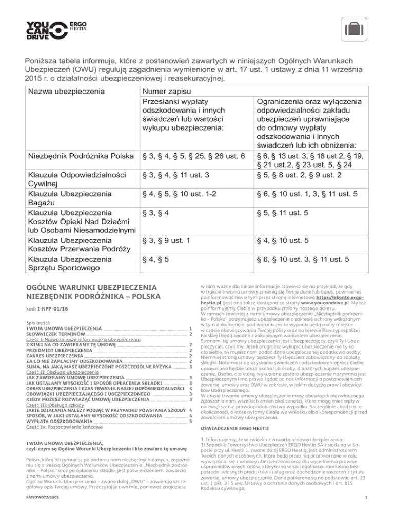 Poniższa tabela informuje, które z postanowień zawartych w niniejszych Ogólnych Warunkach Ubezpieczeń (OWU) regulują zagadnienia wymienione w art. 17 ust. 1 ustawy z dnia 11 września 2015 r. o działalności ubezpieczeniowej i reasekuracyjnej. Nazwa ubezpieczenia Numer zapisu Przesłanki wypłaty odszkodowania i innych świadczeń lub wartości wykupu ubezpieczenia: Niezbędnik Podróżnika Polska § 3, § 4, § 5, § 25, § 26 ust. 6 Klauzula Odpowiedzialności Cywilnej Klauzula Ubezpieczenia Bagażu Klauzula Ubezpieczenia Kosztów Opieki Nad Dziećmi lub Osobami Niesamodzielnymi Klauzula Ubezpieczenia Kosztów Przerwania Podróży Klauzula Ubezpieczenia Sprzętu Sportowego § 3, § 4, § 11 ust. 3 Ograniczenia oraz wyłączenia odpowiedzialności zakładu ubezpieczeń uprawniające do odmowy wypłaty odszkodowania i innych świadczeń lub ich obniżenia: § 6, § 13 ust. 3, § 18 ust.2, § 19, § 21 ust.2, § 23 ust. 5, § 24 § 5, § 8 ust. 2, § 9 ust. 2 § 4, § 5, § 10 ust. 1-2 § 6, § 10 ust. 1, 3, § 11 ust. 5 § 3, § 4 § 5, § 11 ust. 5 § 3, § 9 ust. 1 § 4, § 10 ust. 5 § 4, § 5 § 6, § 10 ust. 3, § 11 ust. 5 OGÓLNE WARUNKI UBEZPIECZENIA NIEZBĘDNIK PODRÓŻNIKA – POLSKA kod: I-NPP-01/16 Spis treści: Twoja umowa ubezpieczenia 1 Słowniczek terminów 2 Część I: Najważniejsze informacje o ubezpieczeniu Z kim i na co zawieramy tę umowę 2 Przedmiot ubezpieczenia 2 Zakres ubezpieczenia 2 Za co nie zapłacimy odszkodowania 2 SUMA, NA JAKĄ MASZ UBEZPIECZONE POSZCZEGÓLNE RYZYKA 3 Część II: Obsługa ubezpieczenia JAK ZAWIERAMY UMOWĘ UBEZPIECZENIA 3 JAK USTALAMY WYSOKOŚĆ I SPOSÓB OPŁACENIA SKŁADKI 3 OKRES UBEZPIECZENIA I CZAS TRWANIA NASZEJ ODPOWIEDZIALNOŚCI 3 OBOWIĄZKI UBEZPIECZAJĄCEGO I UBEZPIECZONEGO 3 KIEDY MOŻESZ ROZWIAZĄĆ UMOWĘ UBEZPIECZENIA 3 Część III: Obsługa szkody JAKIE DZIAŁANIA NALEŻY PODJĄĆ W PRZYPADKU POWSTANIA SZKODY 4 SPOSÓB, W JAKI USTALAMY WYSOKOŚĆ ODSZKODOWANIA 4 WYPŁATA ODSZKODOWANIA 5 Część IV: Postanowienia końcowe TWOJA UMOWA UBEZPIECZENIA, czyli czym są Ogólne Warunki Ubezpieczenia i kto zawiera tę umowę Polisa, którą otrzymujesz po podaniu nam niezbędnych danych, zapoznaniu się z treścią Ogólnych Warunków Ubezpieczenia „Niezbędnik podróżnika – Polska” oraz po opłaceniu składki, jest potwierdzeniem zawarcia z nami umowy ubezpieczenia. Ogólne Warunki Ubezpieczenia – zwane dalej „OWU” – zawierają szczegółowy opis Twojej umowy. Przeczytaj je uważnie, ponieważ znajdziesz PAT/OW072/1601 w nich ważne dla Ciebie informacje. Dowiesz się na przykład, że gdy w trakcie trwania umowy zmienią się Twoje dane lub adres, powinieneś poinformować nas o tym przez stronę internetową https://ekonto.ergohestia.pl (jest ona także dostępna ze strony www.youcandrive.pl. My też poinformujemy Ciebie w przypadku zmiany naszego adresu. W ramach zawartej z nami umowy ubezpieczenia „Niezbędnik podróżnika – Polska” otrzymujesz ubezpieczenie o zakresie ochrony wskazanym w tym dokumencie, pod warunkiem że wypadki będą miały miejsce w czasie obowiązywania Twojej polisy oraz na terenie Rzeczypospolitej Polskiej i będą zgodne z zakupionym wariantem ubezpieczenia. Stronami tej umowy ubezpieczenia jest Ubezpieczający, czyli Ty i Ubezpieczyciel, czyli my. Jeżeli pragniesz wykupić ubezpieczenie nie tylko dla siebie, to musisz nam podać dane ubezpieczanej dodatkowo osoby. Niemniej stroną umowy będziesz Ty i będziesz zobowiązany do zapłaty składki. Natomiast do uzyskania świadczeń i odszkodowań oprócz Ciebie uprawniona będzie także osoba lub osoby, dla których kupiłeś ubezpieczenie. Osoba, dla której wykupione zostało ubezpieczenie nazywana jest Ubezpieczonym i ma prawo żądać od nas informacji o postanowieniach zawartej umowy oraz OWU w zakresie, w jakim dotyczą praw i obowiązków Ubezpieczonego. W czasie trwania umowy ubezpieczenia masz obowiązek niezwłocznego zgłaszania nam wszelkich zmian okoliczności, które mogą mieć wpływ na zwiększenie prawdopodobieństwa wypadku. Szczególnie chodzi o te okoliczności, o które pytamy Ciebie we wniosku albo korespondencji przed zawarciem umowy ubezpieczenia. OŚWIADCZENIE ERGO HESTII 1. Informujemy, że w związku z zawartą umową ubezpieczenia: 1) Sopockie Towarzystwo Ubezpieczeń ERGO Hestia SA z siedzibą w Sopocie przy ul. Hestii 1, zwane dalej ERGO Hestią, jest administratorem Twoich danych osobowych, które będą przez nią przetwarzane w celu wywiązania się z umowy ubezpieczenia oraz dla wypełnienia prawnie usprawiedliwionych celów, którymi są w szczególności: marketing bezpośredni własnych produktów i usług oraz dochodzenie roszczeń z tytułu zawartej umowy ubezpieczenia. Dane pobierane są na podstawie: art. 23 ust. 1 pkt. 3 i 5 ww. Ustawy o ochronie danych osobowych i art. 815 Kodeksu cywilnego; 1 2) Masz prawo wglądu do swoich danych osobowych oraz ich poprawiania, a przetwarzanie tych danych w celach innych niż wymienione powyżej prawnie usprawiedliwione cele ERGO Hestii albo osób trzecich, którym przekazywane są te dane, wymaga uzyskania Twojej uprzedniej zgody. SŁOWNICZEK TERMINÓW, czyli co znaczą pojęcia użyte w Ogólnych Warunkach Ubezpieczenia §1 1. blizna pourazowa – blizna będąca następstwem oparzeń oraz ran wymagających zaopatrzenia chirurgicznego lub hospitalizacji. 2. Centrum Alarmowe – wskazany przez nas podmiot, któremu Ubezpieczony powinien zgłosić chęć skorzystania z usług i świadczeń w ramach ubezpieczenia Assistance w podróży. 3. eKonto – udostępniany Tobie serwis internetowy, który prezentuje posiadane przez Ciebie polisy oraz likwidowane szkody i umożliwia kontakt z ERGO Hestią w zakresie wybranych usług. 4. lokaut – zamknięcie zakładu pracy przez właściciela, połączone ze zwalnianiem pracowników, przeprowadzane dla zmuszenia ich do przyjęcia gorszych warunków pracy lub ze względu na strajk. 5. nieszczęśliwy w
