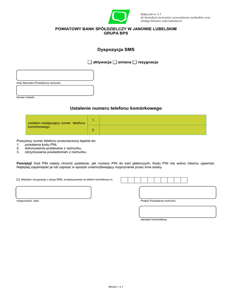 Załącznik nr 3.3 do Instrukcji otwierania i prowadzenia rachunków oraz obsługi klientów indywidualnych POWIATOWY BANK SPÓŁDZIELCZY W JANOWIE LUBELSKIM GRUPA BPS Dyspozycja SMS aktywacja zmiana rezygnacja Imię Nazwisko Posiadacza rachunku Numer modulo Ustalenie numeru telefonu komórkowego ustalam następujący numer telefonu komórkowego 1. 2. Powyższy numer telefonu przeznaczony będzie do: 1. przesłania kodu PIN, 2. dokonywania przelewów z rachunku, 3. otrzymywania powiadomień z rachunku. Pamiętaj! Kod PIN należy chronić podobnie, jak numery PIN do kart płatniczych. Kodu PIN nie wolno nikomu ujawniać. Najlepiej zapamiętać je lub zapisać w sposób uniemożliwiający rozpoznanie przez inne osoby. Składam rezygnację z usługi SMS, przekazywanej na telefon komórkowy nr: miejscowość, data Podpis Posiadacza rachunku stempel memoriałowy Strona 1 z 1