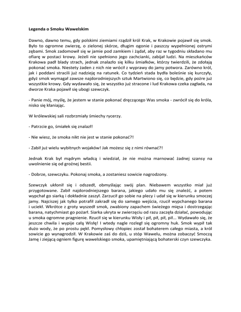 Legenda o Smoku Wawelskim Dawno, dawno temu, gdy polskimi ziemiami rządził król Krak, w Krakowie pojawił się smok. Było to ogromne zwierzę, o zielonej skórze, długim ogonie i paszczy wypełnionej ostrymi zębami. Smok zadomowił się w jamie pod zamkiem i żądał, aby raz w tygodniu składano mu ofiarę w postaci krowy. Jeżeli nie spełniono jego zachcianki, zabijał ludzi. Na mieszkańców Krakowa padł blady strach, jednak znalazło się kilku śmiałków, którzy twierdzili, że zdołają pokonać smoka. Niestety żaden z nich nie wrócił z wyprawy do jamy potwora. Zarówno król, jak i poddani stracili już nadzieję na ratunek. Co tydzień stada bydła boleśnie się kurczyły, gdyż smok wymagał zawsze najdorodniejszych sztuk Martwiono się, co będzie, gdy pożre już wszystkie krowy. Gdy wydawało się, że wszystko już stracone i lud Krakowa czeka zagłada, na dworze Kraka pojawił się ubogi szewczyk. - Panie mój, myślę, że jestem w stanie pokonać dręczącego Was smoka - zwrócił się do króla, nisko się kłaniając. W królewskiej sali rozbrzmiały śmiechy rycerzy. - Patrzcie go, śmiałek się znalazł! - Nie wiesz, że smoka nikt nie jest w stanie pokonać?! - Zabił już wielu wybitnych wojaków! Jak możesz się z nimi równać?! Jednak Krak był mądrym władcą i wiedział, że nie można marnować żadnej szansy na uwolnienie się od groźnej bestii. - Dobrze, szewczyku. Pokonaj smoka, a zostaniesz sowicie nagrodzony. Szewczyk ukłonił się i odszedł, obmyślając swój plan. Niebawem wszystko miał już przygotowane. Zabił najdorodniejszego barana, jakiego udało mu się znaleźć, a potem wypchał go siarką i dokładnie zaszył. Zarzucił go sobie na plecy i udał się w kierunku smoczej jamy. Najciszej jak tylko potrafił zakradł się do samego wejścia, rzucił wypchanego barana i uciekł. Wkrótce z groty wyszedł smok, zwabiony zapachem świeżego mięsa i dostrzegając barana, natychmiast go pożarł. Siarka ukryta w zwierzęciu od razu zaczęła działać, powodując u smoka ogromne pragnienie. Rzucił się w kierunku Wisły i pił, pił, pił, pił... Wydawało się, że jeszcze chwila i wypije całą Wisłę! I wtedy nagle rozległ się ogromny huk. Smok wypił tak dużo wody, że po prostu pękł. Pomysłowy chłopiec został bohaterem całego miasta, a król sowicie go wynagrodził. W Krakowie zaś do dziś, u stóp Wawelu, można zobaczyć Smoczą Jamę i ziejącą ogniem figurę wawelskiego smoka, upamiętniającą bohaterski czyn szewczyka.