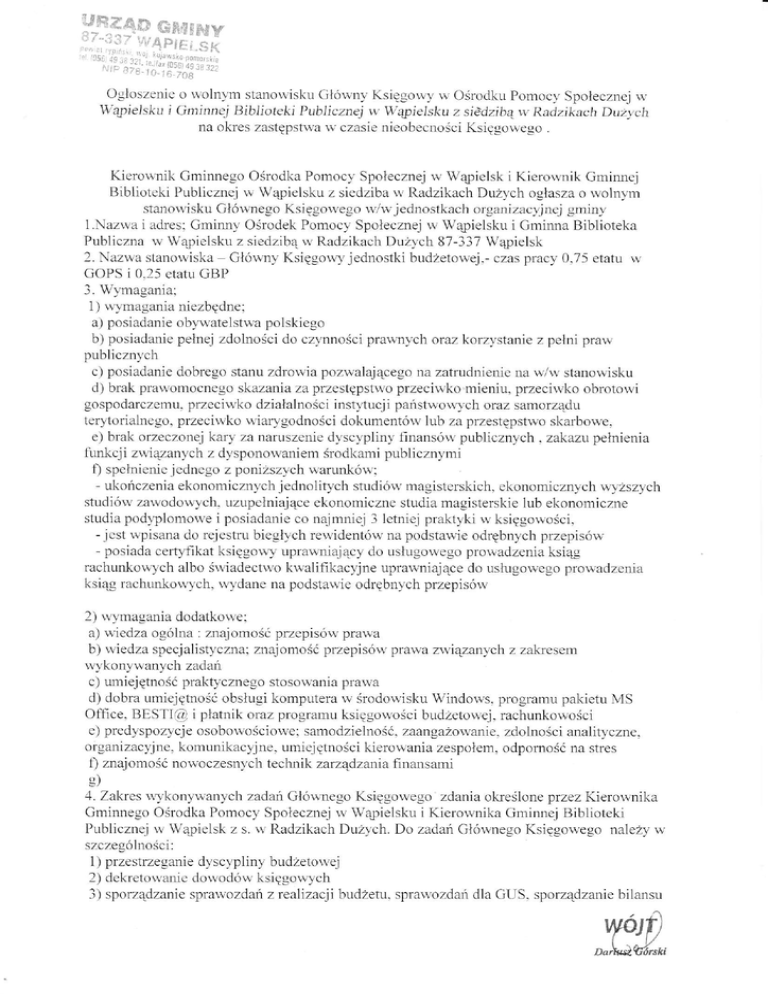 Biblioteki Publicznej w Wąpielsku z siedziba w Radzikach DuŻych ogłasza o wolnym