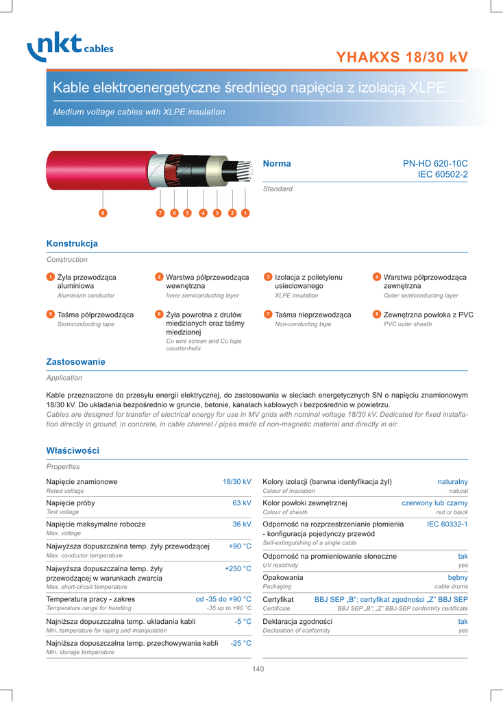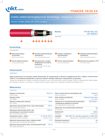 YHAKXS 18/30 kV Kable elektroenergetyczne średniego napięcia z izolacją XLPE Medium voltage cables with XLPE insulation Norma PN-HD 620-10C IEC 60502-2 Standard 8 7 6 5 4 3 2 1 Konstrukcja Construction 1 Żyła przewodząca aluminiowa 2 Aluminium conductor 5 Taśma półprzewodząca Warstwa półprzewodząca wewnętrzna 3 Inner semiconducting layer 6 Semiconducting tape Izolacja z polietylenu usieciowanego 4 XLPE insulation Żyła powrotna z drutów miedzianych oraz taśmy miedzianej 7 Warstwa półprzewodząca zewnętrzna Outer semiconducting layer Taśma nieprzewodząca 8 Zewnętrzna powłoka z PVC PVC outer sheath Non-conducting tape Cu wire screen and Cu tape counter-helix Zastosowanie Application Kable przeznaczone do przesyłu energii elektrycznej, do zastosowania w sieciach energetycznych SN o napięciu znamionowym 18/30 kV. Do układania bezpośrednio w gruncie, betonie, kanałach kablowych i bezpośrednio w powietrzu. Cables are designed for transfer of electrical energy for use in MV grids with nominal voltage 18/30 kV. Dedicated for fixed installation directly in ground, in concrete, in cable channel / pipes made of non-magnetic material and directly in air. Właściwości Properties Napięcie znamionowe 18/30 kV Rated voltage Kolory izolacji (barwna identyfikacja żył) naturalny Colour of insulation Napięcie próby 63 kV Test voltage natural Kolor powłoki zewnętrznej czerwony lub czarny Colour of sheath Napięcie maksymalne robocze 36 kV Max. voltage Najwyższa dopuszczalna temp. żyły przewodzącej +90 °C red or black Odporność na rozprzestrzenianie płomienia - konfiguracja pojedynczy przewód IEC 60332-1 Self-extinguishing of a single cable Max. conductor temperature Odporność na promieniowanie słoneczne tak Najwyższa dopuszczalna temp. żyły przewodzącej w warunkach zwarcia UV resistivity yes +250 °C Temperatura pracy - zakres Temperature range for handling Opakowania bębny Packaging Max. short-circuit temperature od -35 do +90 °C -35 up to +90 °C Najniższa dopuszczalna temp. układania kabli -5 °C Min. temperature for laying and manipulation Najniższa dopuszczalna temp. przechowywania kabli Certyfikat cable drums BBJ SEP „B”; certyfikat zgodności „Z” BBJ SEP Certificate BBJ SEP „B”; „Z” BBJ-SEP conformity certificate Deklaracja zgodności tak Declaration of conformity yes -25 °C Min. storage temperature 140 YHAKXS 18/30 kV Dane techniczne Technical data Liczba i przekrój znamionowy żył No. of cores and cross-section Kształt / konstrukcja żyły roboczej Shape of conductor mm² Średnica żyły roboczej Conductor diameter Grubość znamionowa izolacji Nominal insulation thickness Średnica żyły izolowanej wartość obliczeniowa Diameter over insulation approx. Grubość znamionowa opony Nominal sheath thickness Średnica zewnętrzna kabla - wartość obliczeniowa Outer diameter approx. mm mm mm mm mm Min. dopuszczalny promień gięcia Min. permitted bending radius Orientacyjna masa kabla o długości 1km Cable mass approx. mm kg/km 1x50/16 RMC 8,3 8,0 25,6 2,5 35 525 1043 1x70/16 RMC 9,8 8,0 27,1 2,5 36 540 1150 1x95/16 RMC 11,3 8,0 28,6 2,5 38 570 1276 1x120/16 RMC 12,8 8,0 30,1 2,5 39 585 1529 1x120/50 RMC 12,8 8,0 30,1 2,5 40 600 1871 1x150/25 RMC 14,2 8,0 31,5 2,5 41 615 1599 1x185/25 RMC 15,8 8,0 33,1 2,5 42 630 1759 1x240/25 RMC 18,1 8,0 35,4 2,5 45 675 1994 1x240/50 RMC 18,1 8,0 35,4 2,5 45 675 2404 1x300/25 RMC 20,2 8,0 37,5 2,5 47 705 2245 1x400/35 RMC 23,3 8,0 40,6 2,5 50 750 2739 1x500/35 RMC 26,5 8,0 43,8 2,6 53 795 3152 1x630/35 RMC 29,9 8,0 47,1 2,7 56 840 3862 1x800/35 RMC 34,2 8,0 51,4 2,8 61 915 4595 1x1000/35 RMC 38,1 8,0 55,3 3 67 1005 5703 Uwaga: Na zapytanie oferujemy także wykonania kabli o innych przekrojach żył powrotnych niż wskazane w tabelach w przedziale do przekroju znamionowego żyły powrotnej 70mm² Remark: We offer also alternative cable construction with different cross-section return core beside those one pointed in table, the biggest possible cross-section of return core is 70mm² 141 YHAKXS 18/30 kV Parametry elektryczne Electrical parameters Liczba i przekrój znamionowy żył No. of cores and cross-section Max. rezystancja żył w temp. 20°C Effective resistance of conductor Pojemność Capacitance Indukcyjność kabla w powietrzu / w ziemi w układzie trójkąt Cable inductance (trefoil installation) Indukcyjność kabla w powietrzu w układzie płaskim Cable inductance in air (parallel) Indukcyjność kabla w ziemi w układzie płaskim Cable inductance in ground (parallel) mm² Ω/km μF/km mH/km mH/km mH/km 1x50/16 0,641 0,13 0,48 0,65 0,73 1x70/16 0,443 0,15 0,45 0,62 0,70 1x95/16 0,320 0,16 0,43 0,60 0,67 1x120/16 0,253 0,17 0,41 0,58 0,64 1x120/50 0,253 0,17 0,41 0,55 0,60 1x150/25 0,206 0,19 0,40 0,56 0,62 1x185/25 0,164 0,20 0,39 0,55 0,60 1x240/25 0,125 0,22 0,37 0,53 0,58 1x240/50 0,125 0,22 0,36 0,51 0,55 1x300/25 0,100 0,24 0,35 0,51 0,56 1x400/35 0,078 0,26 0,34 0,49 0,52 1x500/35 0,061 0,29 0,32 0,48 0,50 1x630/35 0,0469 0,32 0,31 0,46 0,49 1x800/35 0,0367 0,36 0,3 0,45 0,47 1x1000/35 0,0291 0,39 0,29 0,44 0,45 142 YHAKXS 18/30 kV Parametry elektryczne Electrical parameters Liczba i przekrój znamionowy żył No. of cores and cross-section Prąd zwarciowy 1-sekundowy Short circuit current equiv. Prąd zwarciowy 1-sekundowy dla żyły powrotnej Short circuit current of screening equiv. Stała czasowa nagrzewania żyły układ trójkąt Time heating constant (trefoil) Stała czasowa nagrzewania żyły układ płaski Time heating constant (parallel) Dopuszczalna obciążalność prądowa kabla w powietrzu w układzie trójkąt* Current ratings of cable in air (trefoil)* Dopuszczalna obciążalność prądowa kabla w powietrzu w układzie płaskim* Current ratings of cable in air (parallel)* Dopuszczalna obciążalność prądowa kabla w ziemi w układzie trójkąt* Current ratings of cable in ground (trefoil)* Dopuszczalna obciążalność prądowa kabla w ziemi w układ