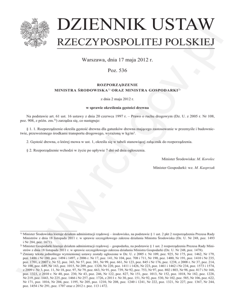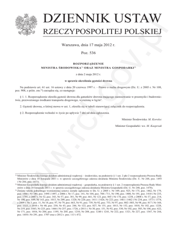 DZIENNIK USTAW w. rcl .go v.p l RZECZYPOSPOLITEJ POLSKIEJ Warszawa, dnia 17 maja 2012 r. Poz. 536 ROZPORZĄDZENIE MINISTRA ŚRODOWISKA 1) ORAZ MINISTRA GOSPODARKI 2) z dnia 2 maja 2012 r. w sprawie określenia gęstości drewna Na podstawie art. 61 ust. 16 ustawy z dnia 20 czerwca 1997 r. – Prawo o ruchu drogowym (Dz. U. z 2005 r. Nr 108, poz. 908, z późn. zm.3)) zarządza się, co następuje: § 1. 1. Rozporządzenie określa gęstość drewna dla gatunków drewna mającego zastosowanie w przemyśle i budownictwie, przewożonego środkami transportu drogowego, wyrażoną w kg/m3. 2. Gęstość drewna, o której mowa w ust. 1, określa się w tabeli stanowiącej załącznik do rozporządzenia. § 2. Rozporządzenie wchodzi w życie po upływie 7 dni od dnia ogłoszenia. Minister Środowiska: M. Korolec ww Minister Gospodarki: wz. M. Kasprzak Minister Środowiska kieruje działem administracji rządowej – środowisko, na podstawie § 1 ust. 2 pkt 2 rozporządzenia Prezesa Rady Ministrów z dnia 18 listopada 2011 r. w sprawie szczegółowego zakresu działania Ministra Środowiska (Dz. U. Nr 248, poz. 1493 i Nr 284, poz. 1671). 2) Minister Gospodarki kieruje działem administracji rządowej – gospodarka, na podstawie § 1 ust. 2 rozporządzenia Prezesa Rady Ministrów z dnia 18 listopada 2011 r. w sprawie szczegółowego zakresu działania Ministra Gospodarki (Dz. U. Nr 248, poz. 1478). 3) Zmiany tekstu jednolitego wymienionej ustawy zostały ogłoszone w Dz. U. z 2005 r. Nr 109, poz. 925, Nr 175, poz. 1462, Nr 179, poz. 1486 i Nr 180, poz. 1494 i 1497, z 2006 r. Nr 17, poz. 141, Nr 104, poz. 708 i 711, Nr 190, poz. 1400, Nr 191, poz. 1410 i Nr 235, poz. 1701, z 2007 r. Nr 52, poz. 343, Nr 57, poz. 381, Nr 99, poz. 661, Nr 123, poz. 845 i Nr 176, poz. 1238, z 2008 r. Nr 37, poz. 214, Nr 100, poz. 649, Nr 163, poz. 1015, Nr 209, poz. 1320, Nr 220, poz. 1411 i 1426, Nr 223, poz. 1461 i 1462 i Nr 234, poz. 1573 i 1574, z 2009 r. Nr 3, poz. 11, Nr 18, poz. 97, Nr 79, poz. 663, Nr 91, poz. 739, Nr 92, poz. 753, Nr 97, poz. 802 i 803, Nr 98, poz. 817 i Nr 168, poz. 1323, z 2010 r. Nr 40, poz. 230, Nr 43, poz. 246, Nr 122, poz. 827, Nr 151, poz. 1013, Nr 152, poz. 1018, Nr 182, poz. 1228, Nr 219, poz. 1443, Nr 225, poz. 1466 i Nr 257, poz. 1726, z 2011 r. Nr 30, poz. 151, Nr 92, poz. 530, Nr 102, poz. 585, Nr 106, poz. 622, Nr 171, poz. 1016, Nr 204, poz. 1195, Nr 205, poz. 1210, Nr 208, poz. 1240 i 1241, Nr 222, poz. 1321, Nr 227, poz. 1367, Nr 244, poz. 1454 i Nr 291, poz. 1707 oraz z 2012 r. poz. 113 i 472. 1) Dziennik Ustaw – 2 – Poz. 536 w. rcl .go v.p l Załącznik do rozporządzenia Ministra Środowiska oraz Ministra Gospodarki z dnia 2 maja 2012 r. (poz. 536) Tabela gęstości drewna dla gatunków drewna mającego zastosowanie w przemyśle i budownictwie, przewożonego środkami transportu drogowego Lp. Gatunek drewna 1 brzoza 810 2 buk 980 3 daglezja 660 4 dąb 950 5 grab 960 6 grochodrzew (robinia) 870 7 jesion 800 8 jodła 750 9 klon jawor 900 10 klon zwyczajny 900 11 lipa 670 12 modrzew 830 13 olcha 750 14 osika 710 15 sosna 740 16 świerk 720 17 topola 670 18 wiąz 820 ww 1) Gęstość drewna [kg/m3]1) W przypadku drewna mierzonego w stosach, jego objętość wyrażoną w metrach przestrzennych przelicza się na objętość w metrach sześciennych przy zastosowaniu współczynników zamiennych określonych w Polskiej Normie PN-D-95000.