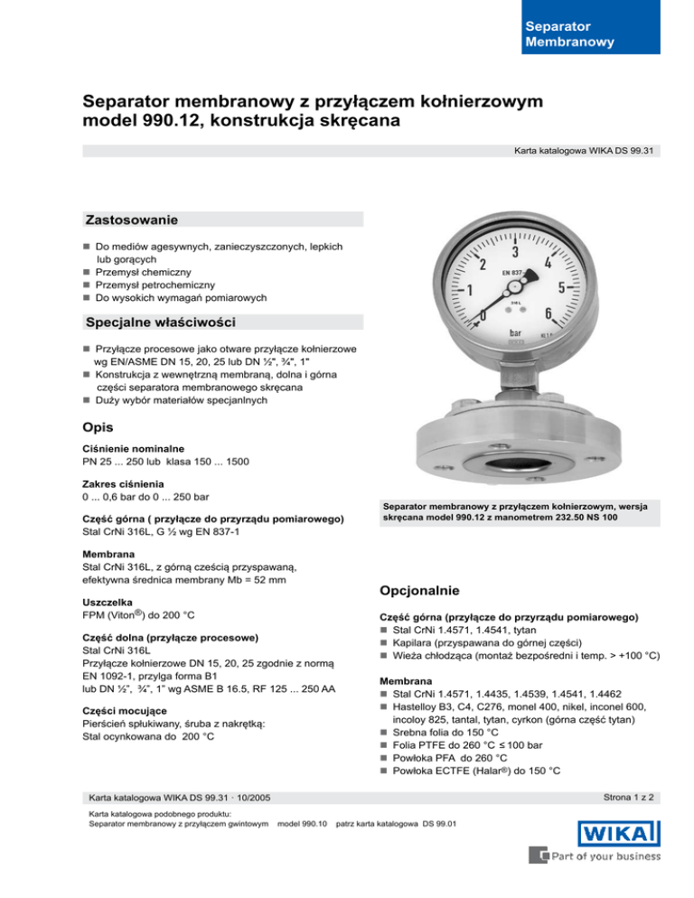 Separator Membranowy Separator membranowy z przyłączem kołnierzowym model 990.12, konstrukcja skręcana Karta katalogowa WIKA DS 99.31 Zastosowanie Do mediów agesywnych, zanieczyszczonych, lepkich lub gorących Przemysł chemiczny Przemysł petrochemiczny Do wysokich wymagań pomiarowych Specjalne właściwości Przyłącze procesowe jako otware przyłącze kołnierzowe wg EN/ASME DN 15, 20, 25 lub DN ½", ¾", 1" Konstrukcja z wewnętrzną membraną, dolna i górna części separatora membranowego skręcana Duży wybór materiałów specjanlnych Opis Ciśnienie nominalne PN 25 ... 250 lub klasa 150 ... 1500 Zakres ciśnienia 0 ... 0,6 bar do 0 ... 250 bar Część górna ( przyłącze do przyrządu pomiarowego) Stal CrNi 316L, G ½ wg EN 837-1 Membrana Stal CrNi 316L, z górną cześcią przyspawaną, efektywna średnica membrany Mb = 52 mm Uszczelka FPM (Viton®) do 200 °C Część dolna (przyłącze procesowe) Stal CrNi 316L Przyłącze kołnierzowe DN 15, 20, 25 zgodnie z normą EN 1092-1, przylga forma B1 lub DN ½”, ¾”, 1” wg ASME B 16.5, RF 125 ... 250 AA Części mocujące Pierścień spłukiwany, śruba z nakrętką: Stal ocynkowana do 200 °C Separator membranowy z przyłączem kołnierzowym, wersja skręcana model 990.12 z manometrem 232.50 NS 100 Opcjonalnie Część górna (przyłącze do przyrządu pomiarowego) Stal CrNi 1.4571, 1.4541, tytan Kapilara (przyspawana do górnej części) Wieża chłodząca (montaż bezpośredni i temp. > +100 °C) Membrana Stal CrNi 1.4571, 1.4435, 1.4539, 1.4541, 1.4462 Hastelloy B3, C4, C276, monel 400, nikel, inconel 600, incoloy 825, tantal, tytan, cyrkon (górna część tytan) Srebna folia do 150 °C Folia PTFE do 260 °C ≤100 bar Powłoka PFA do 260 °C Powłoka ECTFE (Halar®) do 150 °C Strona 1 z 2 Karta katalogowa WIKA DS 99.31 · 10/2005 Karta katalogowa podobnego produktu: Separator membranowy z przyłączem gwintowym model 990.10 patrz karta katalogowa DS 99.01 Wymiary w mm Uszczelka PTFE (dla membrany specjalnej standardowo) do 260 °C Metalowa podkładka sprężysta C (1.4571 posrebrzana lub inconel posrebrzany) do 400 °C Przyłącze kołnierzowe, konstrukcja skręcana 1036 874.01 Opcjonalnie Dolna część (przyłącze procesowe) Inne przyłącza kołnierzowe na zapytanie Przylga wg EN 1092-1, forma B2 lub wg ASME B 16.5, RF 125 AA, 500AA, RFSF; EN 1092-1 rowek i sprężyna, występ i wpust; ASME B 16.5 rowek pierścieniowy forma RJF (ograniczenie przy materiałach specjalnych - na zapytanie) Blokada przeskoku płomienia do przyłącza przy strefie 0 Części mocujące Kołnierz mocujący i śruby ze stali CrNi, do 260 °C Kołnierz mocujący ze stali CrNi, śuby ze stali, doporne na wysokie temperatury do 400 °C Przyłącze DN PN/klasa Norma 1) Przyłącze 15 10/40 zgodne z 15 63/100 normą 15 160 EN 1092-1 15 250 forma B1 / 20 10/40 DIN 2501 25 10/40 forma D 25 63/100 25 25 Przyłącze wg ½” ASME B 16.5 ½ ” raised face ½ ” ½” ¾” ¾” ¾” ¾” 1” 1” 1” 1” 160 250 150 300 600 1500 150 300 600 1500 150 300 600 1500 Rozmiar w mm D k d4 b f H G1 Waga w kg 95 105 105 130 105 115 140 140 150 95 95 95 120 100 120 120 130 110 125 125 150 1,6 2,0 2,1 3,2 1,9 2,1 3,2 3,6 4,0 1,6 1,6 1,8 3,6 1,7 1,9 2,2 3,3 1,6 2,0 2,3 4,8 65 75 75 90 75 85 100 100 105 60,5 66,5 66,5 82,5 70 82,5 82,5 89 79,5 89 89 101,5 45 45 45 45 58 68 68 68 68 35 35 35 35 43 43 43 43 51 51 51 51 28 25 25 26 25 22 24 28 28 28 28 32 40 28 22 25 32 22 22 24,5 36 2 2 2 2 2 2 2 2 2 2 2 7 7 2 2 7 7 2 2 7 7 56 53 53 54 53 50 52 52 56 56 56 60 68 56 50 53 60 50 50 52,5 64 4 x M 12 4 x M 12 4 x M 12 4 x M 16 4 x M 12 4 x M 12 4 x M 16 4 x M 16 4 x M 20 4 x ½“ UNC 4 x ½“ UNC 4 x ½“ UNC 4 x ¾“ UNC 4 x ½“ UNC 4 x G“ UNC 4 x G“ UNC 4 x ¾“ UNC 4 x ½“ UNC 4 x G“ UNC 4 x G“ UNC 4 x H“ UNC 1) PN 10/40 lub klasa 150 i 300 patrz karta katalogowa DS 99.27, dla klasy 400 lub 900 wymiary są takie same jak dla klasy 600 lub 1500 Dane do zamówienia Model / przyłącze procesowe (norma, rozmiar nominalny, ciśnienie nominalne, forma przylgi) / materiał części górnej, membrana, część dolna, części mocujące i uszczelki / przyłącze przyrządu pomiarowego / płyn wypełniający/ montaż z przyrządem pomiarowym ... / akcesoria / warunki eksploatacyjne: zastosowanie, max. i min. temperatura procesu, max. i min. temperatura otoczenia Strona 2 z 2 Karta katalogowa WIKA DS 99.31 · 10/2005 WIKA Polska spółka z ograniczoną odpowiedzialnością sp. k. Ul. Łęgska 29/35, 87-800 Włocławek Tel.: (+48) 54 23 01 100 Fax: (+48) 54 23 01 101 E-mail: [email protected] www.wikapolska.pl 9029141 10/2005 PL Specyfikacje i wymiary podane w niniejszej karcie przedstawiają stan konstrukcyjny aktualny w momencie wydruku. Istnieje możliwość wprowadzenia modyfikacji i zmian specyfikacji materiałowej bez wcześniejszego powiadomienia.
