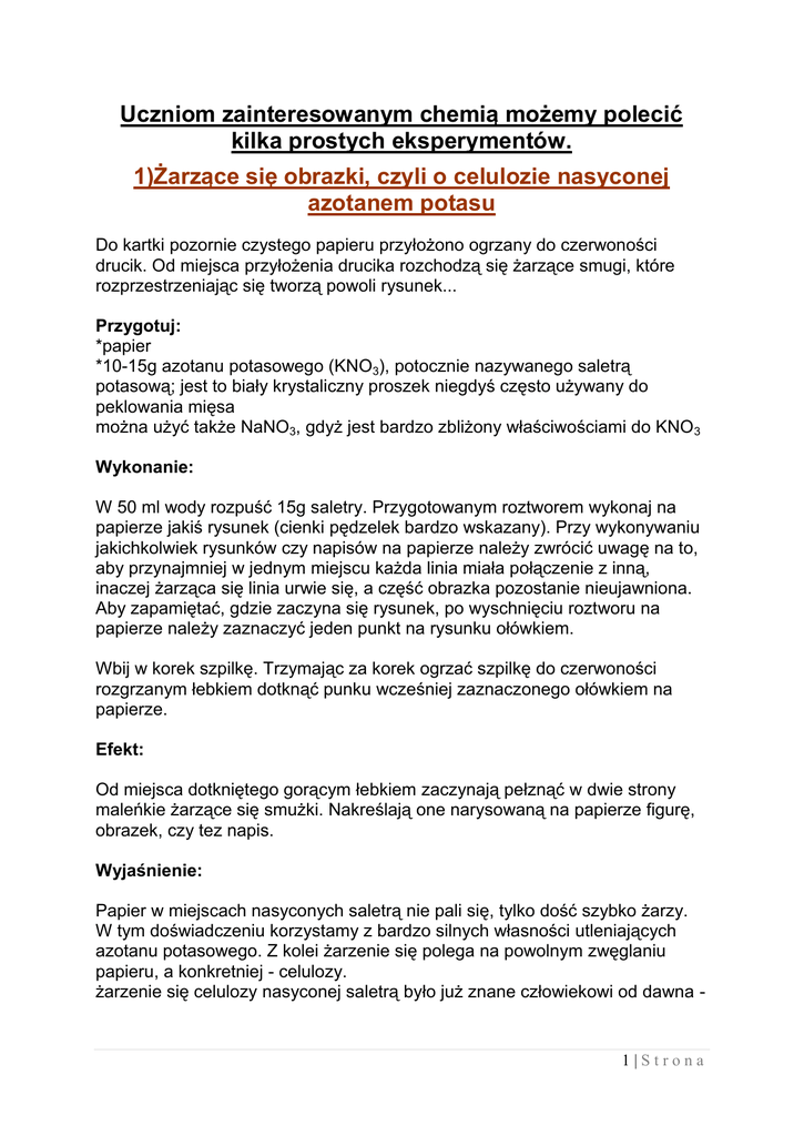 Uczniom zainteresowanym chemią możemy polecić kilka prostych eksperymentów. 1)Żarzące się obrazki, czyli o celulozie nasyconej azotanem potasu Do kartki pozornie czystego papieru przyłożono ogrzany do czerwoności drucik. Od miejsca przyłożenia drucika rozchodzą się żarzące smugi, które rozprzestrzeniając się tworzą powoli rysunek... Przygotuj: *papier *10-15g azotanu potasowego (KNO3), potocznie nazywanego saletrą potasową; jest to biały krystaliczny proszek niegdyś często używany do peklowania mięsa można użyć także NaNO3, gdyż jest bardzo zbliżony właściwościami do KNO3 Wykonanie: W 50 ml wody rozpuść 15g saletry. Przygotowanym roztworem wykonaj na papierze jakiś rysunek (cienki pędzelek bardzo wskazany). Przy wykonywaniu jakichkolwiek rysunków czy napisów na papierze należy zwrócić uwagę na to, aby przynajmniej w jednym miejscu każda linia miała połączenie z inną, inaczej żarząca się linia urwie się, a część obrazka pozostanie nieujawniona. Aby zapamiętać, gdzie zaczyna się rysunek, po wyschnięciu roztworu na papierze należy zaznaczyć jeden punkt na rysunku ołówkiem. Wbij w korek szpilkę. Trzymając za korek ogrzać szpilkę do czerwoności rozgrzanym łebkiem dotknąć punku wcześniej zaznaczonego ołówkiem na papierze. Efekt: Od miejsca dotkniętego gorącym łebkiem zaczynają pełznąć w dwie strony maleńkie żarzące się smużki. Nakreślają one narysowaną na papierze figurę, obrazek, czy tez napis. Wyjaśnienie: Papier w miejscach nasyconych saletrą nie pali się, tylko dość szybko żarzy. W tym doświadczeniu korzystamy z bardzo silnych własności utleniających azotanu potasowego. Z kolei żarzenie się polega na powolnym zwęglaniu papieru, a konkretniej - celulozy. żarzenie się celulozy nasyconej saletrą było już znane człowiekowi od dawna - 1|Strona konopny czy bawełniany sznur nasycony saletrą, to lont używany przez artylerzystów przez długie wieki. WAŻNE!!! doświadczenie należy wykonywać nad kawałkiem blachy czy sklejki, z dala od wszelkich łatwopalnych substancji (benzyna, spirytus, ale także firanki czy wata) /Opis powstał na podstawie książki "Ciekawe doświadczenia" S. Sękowskiego/ 2)Jajko Przygotuj: *jajko *słoik *ocet (CH3COOH) *wodę *butelkę Wykonanie: Surowe jajko kurze umieść w słoiczku i zalej octem, mocz je około 24 godzin. Kwas octowy reaguje ze skorupką i można zobaczyć, że białko i żółtko otoczone są cienką błoną (resztki skorupki można delikatnie zetrzeć). Następnie ostrożnie wylej ocet z naczynia, kilka razy przepłukaj wodą jajko w naczyniu, a następnie spróbuj umieścić je w butelce po śmietanie (lub innej butelce z szeroką szyjką). Do butelki wlej wodę i pozostaw na kolejne 24 godziny. Obserwuj to, że jajko pęcznieje i osiąga rozmiary jajka kaczego (gęsiego). Dlaczego? Błona jajka ma bardzo drobne pory (jest to błona półprzepuszczalna) przez które mogą przecisnąć się małe cząsteczki wody. Cząsteczki białka są na to za duże. Woda przenika do wewnątrz, a białko nie może przedostać się na zewnątrz - jest to zjawisko osmozy, które bardzo często występuje w przyrodzie (w komórkach, naczyniach krwionośnych). Osmoza do dyfuzja (samoczynne rozprzestrzenianie się substancji w innej) przez półprzepuszczalną błonę. Jeżeli wyjmiesz jajko z wody lub zanurzysz w stężonym roztworze soli kuchennej to jajko skurczy się. 2|Strona 3)Mocna herbata Przygotuj: *3 szklanki *łyżeczkę *sodę *kwasek cytrynowy lub ocet Wykonanie: Zaparz około 200cm3 herbaty (powinna mieć ciemny odcień). Postaw na stole 3. szklanki. Do każdej z nich najlej jednakową ilość herbaty. Do pierwszej dodaj pół łyżeczki kwasku cytrynowego lub łyżkę octu, drugą zostaw do porównania, do trzeciej dodaj pół łyżeczki sody. Obserwuj dokładnie zabarwienie roztworu. Barwa w szklance pierwszej zmienia się na bursztynową - charakteryzującą słabą herbatę, w trzeciej natomiast na ciemnobrunatną - charakterystyczną dla bardzo mocnego naparu. Zawarte w herbacie pochodne taniny zmieniają barwę pod wpływem pH. Dodatek sody (NaHCO3, który łatwo hydrolizuje, gdyż jest solą słabego kwasu i mocnej zasady, podnosi stężenie jonów wodorotlenkowych (OH-) w roztworze, a co za tym idzie zwiększa pH (odczyn zasadowy). Dodanie kwasu cytrynowego lub octowego (C6H8O7*H2O, CH3COOH), które dysocjując zwiększają stężenie jonów wodorowych (H+) w roztworze obniża pH (odczyn kwaśny). Wlej zawartość 3. szklanki do szklanki 1. Rozpocznie się dość burzliwa reakcja rozkładu anionów węglanowych. W jej wyniku zacznie się wydzielać dwutlenek węgla: HCO3- + H+ --> H2O + CO2^ Uzyskany roztwór wyglądem przypomina ciemne piwo lub coca-colę. 4)Piękne barwy Ten pan z bródką na zdjęciu obok to Michaił Siemionowicz Cwiet, rosyjski botanik i chemik. Na początku XX wieku pracował na Poltechnice Warszawskiej. I właśnie tu, w Warszawie próbując rozdzielić wyekstrahowany z roślin chlorofil wynalazł metodę rozdzielania mieszanin związków organicznych, która w XX wieku stała się bardzo popularna. Jako, że stosował ją do rozdzielania naturalnych barwników nazwał ją chromatografią - od greckiego khromatos czyli barwa. Tak się dziwnie złożyło, że nazwisko wynalazcy "Cwiet" po rosyjsku też znaczy barwa. Chromatografia najprościej mówiąc polega na przepuszczaniu mieszaniny 3|Strona przez jakiś ośrodek w którym poszczególne składniki mieszaniny wędrują z różnymi prędkościami i dzięki temu zostają rozdzielone. Przez cały XX wiek wymyślono wiele rodzajów chromatografii. Najprostsza w wykonaniu jest chromatografia bibułowa. Przygotuj: - mazak (kolor obojętny, ja użyłam koloru brązowego) - zlewka lub szklanka - kilkucentymetrowy pasek bibuły filtracyjnej bądź zwykłego papieru - ocet lub mieszanina denaturatu z wodą Do szklanki nalewamy 1 cm octu (1cm od dna). 2 cm od końca 