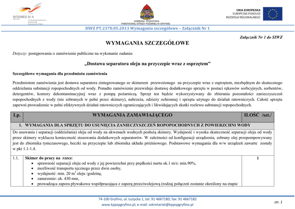 KOMENDA POWIATOWA PAŃSTWOWEJ STRAŻY POŻARNEJ W GRYFINIE SIWZ PT.2370.05.2013 Wymagania szczegółowe – Załącznik Nr 1 Załącznik Nr 1 do SIWZ WYMAGANIA SZCZEGÓŁOWE Dotyczy: postępowania o zamówienie publiczne na wykonanie zadania: „Dostawa separatora oleju na przyczepie wraz z osprzętem” Szczegółowe wymagania dla przedmiotu zamówienia Przedmiotem zamówienia jest dostawa separatora zintegrowanego ze skimerem przewożonego na przyczepie wraz z osprzętem, niezbędnym do skutecznego oddzielania substancji ropopochodnych od wody. Ponadto zamówienie przewiduje dostawę dodatkowego sprzętu w postaci rękawów sorbcyjnych, sorbentów, detergentów, komory dekontaminacyjnej wraz z pompą pożarniczą. Sprzęt ten będzie wykorzystywany do zbierania pozostałości zanieczyszczeń ropopochodnych z wody (nie zebranych w pełni przez skimery), nabrzeża, odzieży ochronnej i sprzętu użytego do działań ratowniczych. Całość sprzętu zapewni prowadzenie w pełni efektywnych działań ratowniczych ograniczających i likwidujących skutki rozlewu substancji ropopochodnych. Lp. WYMAGANIA ZAMAWIAJĄCEGO ILOŚĆ /szt./ 1. WYMAGANIA DLA SPRZĘTU DO USUNIĘCIA ZANIECZYSZCZEŃ ROPOPOCHODNYCH Z POWIERZCHNI WODY Do usuwania i separacji (oddzielania) oleju od wody na akwenach wodnych posłużą skimery. Wydajność i wysoka skuteczność separacji oleju od wody przez skimery wyklucza konieczność stosowania dodatkowych separatorów. W zależności od konfiguracji urządzenia, zebrany olej przepompowywany jest do zbiornika tymczasowego, beczki na przyczepie lub zbiornika układu próżniowego. Podstawowe wymagania dla w/w urządzeń zawarte zostały w pkt 1.1-1.4. 1.1. Skimer do pracy na rzece: sprawność separacji oleju od wody z jej powierzchni przy prędkości nurtu ok.1 m/s: min.90%, możliwość transportu ręcznego przez dwie osoby, wydajność: min. 20 m3 oleju /godzinę, zanurzenie: ok. 430 mm, prowadząca zapora pływakowa współpracująca z zaporą przeciwolejową (rodzaj połączeń zostanie określony na etapie 74-100 Gryfino, ul. Łużycka 1, tel. 91 4667180; fax: 91 4667182 www.kppspgryfino.pl; e-mail: [email protected] 1 str. 1 KOMENDA POWIATOWA PAŃSTWOWEJ STRAŻY POŻARNEJ W GRYFINIE SIWZ PT.2370.05.2013 Wymagania szczegółowe – Załącznik Nr 1 1.2. 1.3. 1.4. realizacji zadania), budowa: rama, pływak, podłączenie do węża ssącego, komora kołowa, Wyposażenie dodatkowe: węże ssące(do produktów ropopochodnych) z pływakami: łączna długość min.20 m, węże tłoczne (do produktów ropopochodnych): łączna długość min. 40 m, pompa membranowa samozasysająca z silnikiem na olej napędowy o wydajności min. 20m3 /h, pompa obudowana stalową ramą z kołami. Skimer bębnowy: sprawność separacji oleju od wody: min.95 %, wydajność: min. 8m3 /h, możliwość pracy przy ok.10 cm głębokości wody, możliwość selektywnego odzyskiwania oleju od wody w szerokim zakresie typów olei. wyposażony w bębny rowkowe zwiększające wydajność, napęd pompy opróżniającej komorę kumulującą zebrany olej i bębnów pompą hydrauliczną (w zestawie pompa hydrauliczna napędzana silnikiem na olej napędowy), możliwość transportu ręcznego przez dwie osoby, Wyposażenie dodatkowe: węże tłoczne (do produktów ropopochodnych)z pływakami: łączna długość min. 60 m, Skimer z głowicą ssąca do pracy na płyciznach: wykonany z wytrzymałego, lekkiego, formowanego i pływającego materiału, możliwość selektywnego odzyskiwania oleju od wody w zakresie olei lekkich, możliwość pracy na płyciznach o głębokości ok. 5cm. Wyposażenie dodatkowe: węże ssące(do produktów ropopochodnych) z pływakami: łączna długość min.20 m, węże tłoczne (do produktów ropopochodnych): łączna długość min. 40 m, pompa membranowa samozasysająca z silnikiem na olej napędowy o wydajności min. 20m3 /h, pompa obudowana stalową ramą z kołami. Zbiornik do przechowywania cieczy ropopochodnych i agresywnych: wykonany z tkaniny o budowie warstwowej pokrytej powłoką z gumy odporną na działanie cieczy ropopochodnych i 74-100 Gryfino, ul. Łużycka 1, tel. 91 4667180; fax: 91 4667182 www.kppspgryfino.pl; e-mail: [email protected] 1 1 2 str. 2 KOMENDA POWIATOWA PAŃSTWOWEJ STRAŻY POŻARNEJ W GRYFINIE SIWZ PT.2370.05.2013 Wymagania szczegółowe – Załącznik Nr 1 agresywnych, górna część zbiornika z rękawem napełnianym powietrzem i pełniącym rolę pływaka przy napełnianiu zbiornika, w bocznej ścianie zamontowany zawór kulowy z nasadą Ø 52 do napełniania i opróżniania zbiornika, pokrywa zbiornika zapobiegająca rozlaniu cieczy, pojemność zbiornika: 2m3 szt.2, dodatkowo w skład kompletu: zestaw naprawczy, pokrowiec, instrukcja użytkowania. 2. WYMAGANIA DLA SPRZĘTU DO NEUTRALIZACJI I USUWANIA ZANIECZYSZCZEŃ ROPOPOCHODNYCH Z POWIERZCHNI GRUNTU, INFRASTRUKTURY I SPRZĘTU Do usuwania, ograniczania, powstrzymywania wycieków i rozlewów produktów ropopochodnych na akwenach wodnych i do usunięcia resztek zanieczyszczeń, które zatrzyma zapora przeciwolejowa i nie zdołają zebrać skimery olejowe posłużą sorbenty np. polipropylen otoczony mocną zewnętrzną siatką w kształcie rękawa. Rękawy z możliwością łatwego łączenia w dowolną długość przy pomocy prostych w użyciu elementów szybkozłącznych. Do usunięcia pozostałości zanieczyszczeń ropopochodnych(filmu olejowego) z powierzchni wody zastosowana zostanie włóknina sorbentowa. Do usunięcia pozostałości zanieczyszczeń ropopochodnych z powierzchni stałych zastosowany zostanie dyspergent w płynie i sorbent mineralny sypki. Do czyszczenie sprzętu i odzieży specjalnej zostanie wykorzystana kabina dekontaminacyjna zasilana wodą poprzez pompę pożarniczą. Podstawowe wymagania dla w/w urządzeń zawarte zostały w pkt 2.1-2.8. 2.1. Rękaw sorbcyjny: długość ogółem: 200 m, długość segmentu: 2,5-3,5 m, średnica rękawa: 15-25 cm, gęstość sorbe