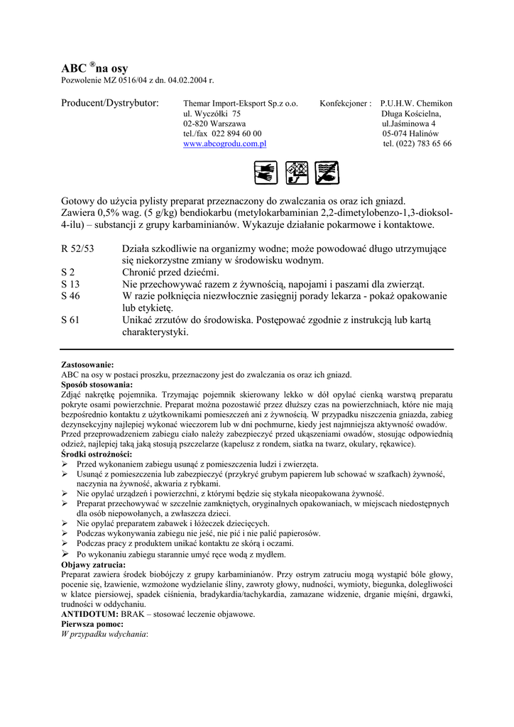 ABC ®na osy Pozwolenie MZ 0516/04 z dn. 04.02.2004 r. Producent/Dystrybutor: Themar Import-Eksport Sp.z o.o. ul. Wyczółki 75 02-820 Warszawa tel./fax 022 894 60 00 www.abcogrodu.com.pl Konfekcjoner : P.U.H.W. Chemikon Długa Kościelna, ul.Jaśminowa 4 05-074 Halinów tel. (022) 783 65 66 Gotowy do uŜycia pylisty preparat przeznaczony do zwalczania os oraz ich gniazd. Zawiera 0,5% wag. (5 g/kg) bendiokarbu (metylokarbaminian 2,2-dimetylobenzo-1,3-dioksol4-ilu) – substancji z grupy karbaminianów. Wykazuje działanie pokarmowe i kontaktowe. R 52/53 S2 S 13 S 46 S 61 Działa szkodliwie na organizmy wodne; moŜe powodować długo utrzymujące się niekorzystne zmiany w środowisku wodnym. Chronić przed dziećmi. Nie przechowywać razem z Ŝywnością, napojami i paszami dla zwierząt. W razie połknięcia niezwłocznie zasięgnij porady lekarza - pokaŜ opakowanie lub etykietę. Unikać zrzutów do środowiska. Postępować zgodnie z instrukcją lub kartą charakterystyki. Zastosowanie: ABC na osy w postaci proszku, przeznaczony jest do zwalczania os oraz ich gniazd. Sposób stosowania: Zdjąć nakrętkę pojemnika. Trzymając pojemnik skierowany lekko w dół opylać cienką warstwą preparatu pokryte osami powierzchnie. Preparat moŜna pozostawić przez dłuŜszy czas na powierzchniach, które nie mają bezpośrednio kontaktu z uŜytkownikami pomieszczeń ani z Ŝywnością. W przypadku niszczenia gniazda, zabieg dezynsekcyjny najlepiej wykonać wieczorem lub w dni pochmurne, kiedy jest najmniejsza aktywność owadów. Przed przeprowadzeniem zabiegu ciało naleŜy zabezpieczyć przed ukąszeniami owadów, stosując odpowiednią odzieŜ, najlepiej taką jaką stosują pszczelarze (kapelusz z rondem, siatka na twarz, okulary, rękawice). Środki ostroŜności: Przed wykonaniem zabiegu usunąć z pomieszczenia ludzi i zwierzęta. Usunąć z pomieszczenia lub zabezpieczyć (przykryć grubym papierem lub schować w szafkach) Ŝywność, naczynia na Ŝywność, akwaria z rybkami. Nie opylać urządzeń i powierzchni, z którymi będzie się stykała nieopakowana Ŝywność. Preparat przechowywać w szczelnie zamkniętych, oryginalnych opakowaniach, w miejscach niedostępnych dla osób niepowołanych, a zwłaszcza dzieci. Nie opylać preparatem zabawek i łóŜeczek dziecięcych. Podczas wykonywania zabiegu nie jeść, nie pić i nie palić papierosów. Podczas pracy z produktem unikać kontaktu ze skórą i oczami. Po wykonaniu zabiegu starannie umyć ręce wodą z mydłem. Objawy zatrucia: Preparat zawiera środek biobójczy z grupy karbaminianów. Przy ostrym zatruciu mogą wystąpić bóle głowy, pocenie się, łzawienie, wzmoŜone wydzielanie śliny, zawroty głowy, nudności, wymioty, biegunka, dolegliwości w klatce piersiowej, spadek ciśnienia, bradykardia/tachykardia, zamazane widzenie, drganie mięśni, drgawki, trudności w oddychaniu. ANTIDOTUM: BRAK – stosować leczenie objawowe. Pierwsza pomoc: W przypadku wdychania: Wynieść poszkodowanego z miejsca naraŜenia, ułoŜyć w wygodnej pozycji półleŜącej lub siedzącej, zapewnić spokój, chronić przed utratą ciepła. JeŜeli wystąpią zaburzenia oddychania, podawać tlen do oddychania. JeŜeli objawy nie ustępują, wezwać lekarza. W przypadku skaŜenia oczu: Natychmiast płukać duŜą ilością letniej wody, najlepiej bieŜącej, przez co najmniej 15 min. Usunąć szkła kontaktowe. Unikać silnego strumienia wody ze względu na ryzyko mechanicznego uszkodzenia rogówki. JeŜeli podraŜnienie nie ustępuje, naleŜy skonsultować się z lekarzem-okulistą. W przypadku skaŜenia skóry: Obficie zmywać letnią, bieŜącą wodą. Zdjąć zanieczyszczoną odzieŜ. Jeśli podraŜnienie nie ustępuje, zasięgnąć porady lekarza. W przypadku połknięcia: JeŜeli nastąpi połknięcie, nie prowokować wymiotów. Wypłukać usta wodą, a następnie podać do wypicia duŜą ilość wody (jeśli poszkodowany jest przytomny). Zapewnić pomoc lekarską. Magazynowanie: Preparat przechowywać w oryginalnych, szczelnie zamkniętych opakowaniach w suchym i dobrze wentylowanym pomieszczeniu magazynowym w temperaturze 0 - 30 0C, z dala od środków spoŜywczych, napojów i pasz. Chronić przed bezpośrednim nasłonecznieniem, wysoką temperaturą i wilgocią. Chronić przed dziećmi. Zabezpieczyć pojemniki przed mechanicznym uszkodzeniem. Postępowanie z odpadami preparatu i opakowaniem: Resztki preparatu i puste opakowania traktować jako odpady komunalne. Nie dopuszczać do zanieczyszczenia wód gruntowych i powierzchniowych. Zabrania się spalania opakowań po środku we własnym zakresie. UWAGA! ZABRANIA SIĘ WYKORZYSTYWANIA OPRÓśNIONYCH OPAKOWAŃ DO INNYCH CELÓW, W TYM TAKśE TRAKTOWANIA ICH JAKO SUROWCE WTÓRNE. Zalecenia dotyczące wentylacji: Preparat nie działa szkodliwie przez drogi oddechowe. Pomieszczenie (po dokładnym wywietrzeniu) moŜna uŜytkować po wykonaniu zabiegu. Skutek działania środka biobójczego: Preparat wykazuje działanie kontaktowe (efekt biobójczy następuje po zetknięciu owada z opylaną powierzchnią). W przypadku ponownego pojawienia się insektów, zabieg naleŜy powtórzyć po około dwóch tygodniach. Pomoc medyczna: W sytuacjach, kiedy konieczna jest inna pomoc medyczna niŜ ujęta w ostrzeŜeniach skontaktować się z najbliŜszym ośrodkiem toksykologicznym: Ośrodki toksykologiczne: Gdańsk (058) 349 28 31, Kraków (012) 411 99 99, Warszawa (022) 619 66 54, Poznań (061) 847 69 46 Data waŜności: Nr partii: ........... Zawartość netto: ..........