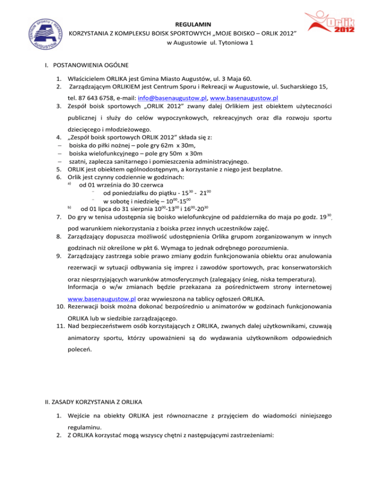 REGULAMIN KORZYSTANIA Z KOMPLEKSU BOISK SPORTOWYCH „MOJE BOISKO – ORLIK 2012” w Augustowie ul. Tytoniowa 1 I. POSTANOWIENIA OGÓLNE 1. Właścicielem ORLIKA jest Gmina Miasto Augustów, ul. 3 Maja 60. 2. Zarządzającym ORLIKIEM jest Centrum Sporu i Rekreacji w Augustowie, ul. Sucharskiego 15, tel. 87 643 6758, e-mail: [email protected], www.basenaugustow.pl 3. Zespół boisk sportowych „ORLIK 2012” zwany dalej Orlikiem jest obiektem użyteczności publicznej i służy do celów wypoczynkowych, rekreacyjnych oraz dla rozwoju sportu 4. − − − 5. 6. 7. dziecięcego i młodzieżowego. „Zespół boisk sportowych ORLIK 2012” składa się z: boiska do piłki nożnej – pole gry 62m x 30m, boiska wielofunkcyjnego – pole gry 50m x 30m szatni, zaplecza sanitarnego i pomieszczenia administracyjnego. ORLIK jest obiektem ogólnodostępnym, a korzystanie z niego jest bezpłatne. Orlik jest czynny codziennie w godzinach: a) od 01 września do 30 czerwca − od poniedziałku do piątku - 1530 - 2100 − w sobotę i niedzielę – 1000-1500 b) od 01 lipca do 31 sierpnia 1000-1300 i 1600-2030 Do gry w tenisa udostępnia się boisko wielofunkcyjne od października do maja po godz. 19 30, pod warunkiem niekorzystania z boiska przez innych uczestników zajęć. 8. Zarządzający dopuszcza możliwość udostępnienia Orlika grupom zorganizowanym w innych godzinach niż określone w pkt 6. Wymaga to jednak odrębnego porozumienia. 9. Zarządzający zastrzega sobie prawo zmiany godzin funkcjonowania obiektu oraz anulowania rezerwacji w sytuacji odbywania się imprez i zawodów sportowych, prac konserwatorskich oraz niesprzyjających warunków atmosferycznych (zalegający śnieg, niska temperatura). Informacja o w/w zmianach będzie przekazana za pośrednictwem strony internetowej www.basenaugustow.pl oraz wywieszona na tablicy ogłoszeń ORLIKA. 10. Rezerwacji boisk można dokonać bezpośrednio u animatorów w godzinach funkcjonowania ORLIKA lub w siedzibie zarządzającego. 11. Nad bezpieczeństwem osób korzystających z ORLIKA, zwanych dalej użytkownikami, czuwają animatorzy sportu, którzy upoważnieni są do wydawania użytkownikom odpowiednich poleceń. II. ZASADY KORZYSTANIA Z ORLIKA 1. Wejście na obiekty ORLIKA jest równoznaczne z przyjęciem do wiadomości niniejszego regulaminu. 2. Z ORLIKA korzystać mogą wszyscy chętni z następującymi zastrzeżeniami: a) osoby indywidualne mogą korzystać z boisk w każdym czasie, jeżeli na boiskach nie odbywają się aktualnie zorganizowane zajęcia sportowe, b) dzieci do lat 6, mogą korzystać z boisk wyłącznie pod opieką pełnoletnich opiekunów, c) grupy zorganizowane muszą wcześniej uzgodnić termin wejścia na ORLIK z animatorem lub zarządzającym obiektem. 3. Osoby i grupy zorganizowane korzystające z ORLIKA zobowiązane są do wpisywania się w rejestrze użytkowników, prowadzonej przez animatorów. 4. Koniecznym warunkiem korzystania z boisk jest posiadanie odpowiedniego stroju oraz obuwia sportowego o miękkiej, czystej i płaskiej podeszwie. Nie dopuszcza się używania korków i kolców. 5. Wszystkie zajęcia sportowe odbywające się na ORLIKU koordynują animatorzy. 6. W przypadku korzystania z ORLIKA przez grupy zorganizowane, odpowiedzialność za bezpieczeństwo uczestników zajęć ponoszą opiekunowie grup. 7. Jednorazowo z zajęć na ORLIKU może korzystać nie więcej niż 40 osób. 8. Z szatni oraz pomieszczeń sanitarnych ORLIKA mogą korzystać wyłącznie uczestnicy zajęć. III. PODSTAWOWE OBOWIĄZKI UŻYTKOWNIKA 1. Każdy użytkownik ORLIKA zobowiązany jest do: a) przestrzegania wszystkich postanowień niniejszego regulaminu, b) dokonania wpisu w księdze użytkowników, c) korzystania z wszystkich obiektów i urządzeń sportowych zgodnie z ich przeznaczeniem, d) przestrzegania porządku, czystości i zasad estetyki na terenie całego obiektu i w jego bezpośrednim otoczeniu, e) stosowania się do poleceń i nakazów zarządzającego oraz animatorów. 2. Na wszystkich obiektach ORLIKA obowiązują przyjęte powszechnie normy współżycia społecznego, a w rywalizacji sportowej zasada „ fair play”. 3. Każdy użytkownik jest zobowiązany natychmiast powiadomić animatora o wszelkich zauważonych uszkodzeniach urządzeń sportowych, kontuzjach osób przebywających na obiekcie oraz o innych zdarzeniach, które mogą mieć wpływ na bezpieczeństwo użytkowników. IV. ZAKAZY DOTYCZĄCE UŻYTKOWNIKÓW ORLIKA 1. W celu zapewnienia bezpieczeństwa użytkownikom oraz korzystania z boisk zgodnie z ich przeznaczeniem zabrania się: a) spożywania alkoholu, środków odurzających i innych, podobnie działających substancji, b) palenia papierosów, c) zakłócania porządku i przeszkadzania osobom korzystającym z boisk, d) używania wulgarnych słów i okrzyków, e) wspinania na ogrodzenie i urządzenia sportowe, f) wnoszenia materiałów i przedmiotów niebezpiecznych, wykonanych z kruchego, pękającego lub twardego materiału g) jazdy na rowerze, motorowerze, deskorolkach, rolkach oraz innym sprzęcie mogącym niszczyć nawierzchnie boisk i terenów zielonych, i) pozostawiania śmieci, a w szczególności puszek metalowych i butelek plastikowych po napojach, papierów, opakowań itp. 2. Na teren obiektów ORLIKA obowiązuje zakaz wprowadzania zwierząt. V. SANKCJE I ODPOWIEDZIALNOŚĆ 1. Animatorzy mają obowiązek odmówić wstępu na obiekty sportowe osobom, które nie zgadzają się z postanowieniami niniejszego regulaminu. 2. Animatorzy mają obowiązek nakazać opuszczenie ORLIKA użytkownikom, którzy nie przestrzegają niniejszego regulaminu. 3. Animatorzy i zarządzający ORLIKIEM nie ponoszą odpowiedzialności za: a) straty materialne oraz kontuzje użytkowników, które wynikły z braku stosowania się do postanowień niniejszego regulaminu, b) przedmioty, dokumenty i inne wartości, stanowiące własność użytkowników. 4. Użytkownik, który w wyniku niewłaściwego korzystania z 
