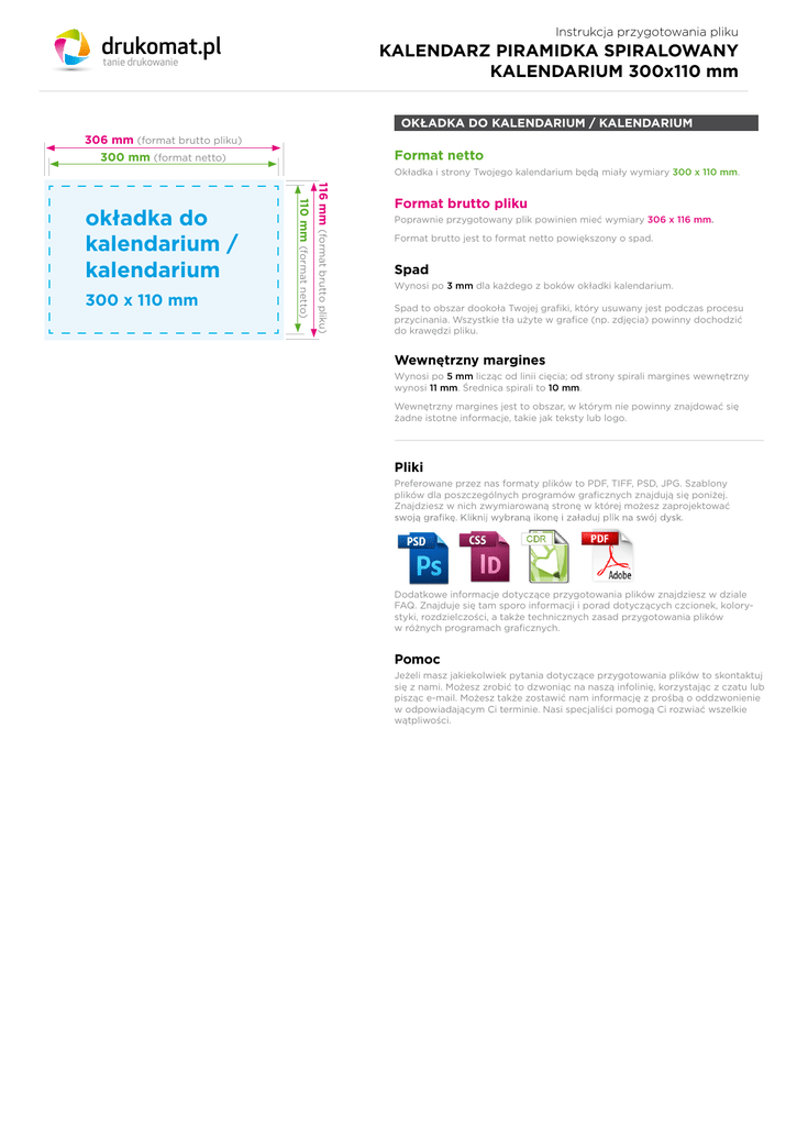 Instrukcja przygotowania pliku drukomat.pl tanie drukowanie KALENDARZ PIRAMIDKA SPIRALOWANY KALENDARIUM 300x110 mm OKŁADKA DO KALENDARIUM / kalendarium 306 mm (format brutto pliku) 300 mm (format netto) 300 x 110 mm 110 mm (format netto) okładka do kalendarium / kalendarium Okładka i strony Twojego kalendarium będ miały wymiary 300 x 110 mm. 116 mm (format brutto pliku) drukomat.pl tanie drukowanie Format netto Format brutto pliku Poprawnie przygotowany plik powinien mieć wymiary 306 x 116 mm. Format brutto jest to format netto powiększony o spad. Spad Wynosi po 3 mm dla każdego z boków okładki kalendarium. Spad to obszar dookoła Twojej grafiki, który usuwany jest podczas procesu przycinania. Wszystkie tła użyte w grafice (np. zdjęcia) powinny dochodzić do krawędzi pliku. Wewnętrzny margines Wynosi po 5 mm licząc od linii cięcia; od strony spirali margines wewnętrzny wynosi 11 mm. Średnica spirali to 10 mm. Wewnętrzny margines jest to obszar, w którym nie powinny znajdować się żadne istotne informacje, takie jak teksty lub logo. Pliki Preferowane przez nas formaty plików to PDF, TIFF, PSD, JPG. Szablony plików dla poszczególnych programów graficznych znajdują się poniżej. Znajdziesz w nich zwymiarowaną stronę w której możesz zaprojektować Dodatkowe informacje dotyczące przygotowania plików znajdziesz w dziale FAQ. Znajduje się tam sporo informacji i porad dotyczących czcionek, kolorystyki, rozdzielczości, a także technicznych zasad przygotowania plików w różnych programach graficznych. Pomoc Jeżeli masz jakiekolwiek pytania dotyczące przygotowania plików to skontaktuj się z nami. Możesz zrobić to dzwoniąc na naszą infolinię, korzystając z czatu lub pisząc e-mail. Możesz także zostawić nam informację z prośbą o oddzwonienie w odpowiadającym Ci terminie. Nasi specjaliści pomogą Ci rozwiać wszelkie wątpliwości. Instrukcja przygotowania pliku drukomat.pl tanie drukowanie KALENDARZ PIRAMIDKA SPIRALOWANY KALENDARIUM 300x110 mm PODKŁAD 306 mm (format brutto pliku) 300 mm (format netto) Format netto drukomat.pl Exero od te feu feugiamet ad do tanie drukowanie zakładka na klejenie 306 x 48 mm, góra (w tym część bez zadruku 306 x 43 mm) 306 x 5 mm - przedłużona grafika z górnej części podkładu Podkład pod kalendarium będzie miał wymiary 300 x 395 mm. 43 mm 5 mm 290 x 20 mm miejsce na informację (w tym część bez zadruku 306 x 68 mm) Exero od ad lorem 5 mm (wewnętrzny margines) 5 mm 68 mm zakładka na klejenie 306 x 73 mm, dół 5 mm Exero od ad lorem 401 mm (format brutto pliku) 140 mm (format netto) 290 x 20 mm miejsce na informację 306 x 5 mm - przedłużona grafika z dolnej części podkładu 395 mm (format netto pliku) 140 mm od da temaiguef uef et do orexE maiguef al tiagua tnesnocmaido -mul te nit dessilicaf ue dommoc -on tinev tulod ta mue hbineh nas erol temauq ,tarp tuplun tat durts sinelod otselod lev ,teerolod et etauqessearp tid 290 mm (format brutto z grafiką) brutto pliku odiamconsent augaitFormat la feugiam Poprawnie przygotowany plik powinien mieć wymiary 306 x 401 mm. commod eu facilissedFormat tinbrutto et jest lumto format netto powiększony o spad. kalendarz piramidka san henibh eum at dolut venit noSpad spiralowany strud tat nulput prat, quamet Wynosi po 3 mmlore dla każdego z boków podkładu kalendarium. kalendarium 300x110 mm te doloreet, vel dolesto dolenis Spad to obszar dookoła Twojej grafiki, który usuwany jest podczas procesu przycinania. Wszystkie Exero od te feu feugiamet ad do tła użyte w grafice (np. zdjęcia) powinny dochodzić do krawędzi pliku. dit praessequate odiamconsent augait la feugiam miejsce na kalendarium spiralowane 300 x 110 mm commod eu facilissed Wewnętrzny tin et lummargines Wynosi po 5 mm dla boków podkładu, 10 mm licząc od dolnej linii grafiki san henibh eum at dolut no-krawędzi. oraz venit 11 mm od górnej Wewnętrzny margines strud tat nulput prat, quamet lorejest to obszar, w którym nie powinny znajdować się żadne istotne informacje, takie jak teksty lub logo. te doloreet, vel dolesto dolenis Uwaga dit praessequate 1. Kalendarium o wymiarze 300 x 110 mm zostanie umieszczone za pomocą (format netto) f et do orexE tnesnocmaido f ue dommoc ue hbineh nas plun tat durts ,teerolod et uqessearp tid 11 mm miejsce bez zadruku 5 mm (wewnętrzny margines) 10 mm (wewnętrzny margines) Wizualizacja gotowego produktu: spirali. 2.W górnej części podkładu dodana zakładka na sklejenie o wymiarze 306 x 48 mm, w tym: - 306 x 43 mm to obszar bez zadruku przeznaczony na sklejenie kalendarza - 306 x 5 mm przedłużona grafika z górnej części podkładu 3.W dolnej części podkładu dodana zakładka na sklejenie o wymiarze 306 x 73 mm, w tym: - 306 x 68 mm to obszar bez zadruku przeznaczony na sklejenie kalendarza - 306 x 5 mm przedłużona grafika z dolnej części podkładu 4.Pole zadruku na istotne informacje na kalendarzu (np. dane teleadresowe) to 290 x 20 mm, z zachowaniem 5 mm marginesu wewnętrznego z każdej strony. Pliki Preferowane przez nas formaty plików to PDF, TIFF, PSD, JPG. Szablony plików dla poszczególnych programów graficznych znajdują się poniżej. Znajdziesz w nich zwymiarowaną stronę w której możesz zaprojektować swoją grafikę. Kliknij wybraną ikonę i załaduj plik na swój dysk. Dodatkowe informacje dotyczące przygotowania plików znajdziesz w dziale FAQ. Znajduje się tam sporo informacji i porad dotyczących czcionek, kolorystyki, rozdzielczości, a także technicznych zasad przygotowania plików w różnych programach graficznych. Pomoc Jeżeli masz jakiekolwiek pytania dotyczące przygotowania plików to skontaktuj się z nami. Możesz zrobić to dzwoniąc na naszą infolinię, korzystając z czatu lub pisząc e-mail. Możesz także zostawić nam informację z prośbą o oddzwonienie w odpowiadającym Ci terminie. Nasi specjaliści pomogą Ci rozwiać wszelkie wątpliwości. DRUKUJ drukuj instrukcję przygoto