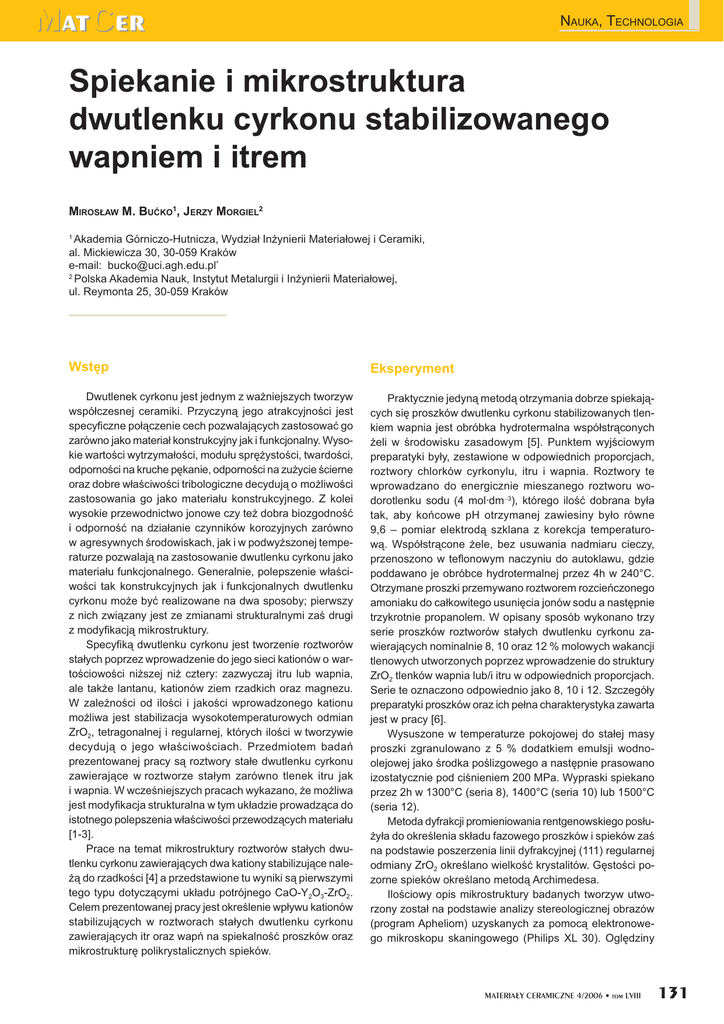 MatCer NAUKA, TECHNOLOGIA Spiekanie i mikrostruktura dwutlenku cyrkonu stabilizowanego wapniem i itrem MIROSAW M. BUKO1, JERZY MORGIEL2 1 Akademia Górniczo-Hutnicza, Wydzia Inynierii Materiaowej i Ceramiki, al. Mickiewicza 30, 30-059 Kraków e-mail: [email protected]* 2 Polska Akademia Nauk, Instytut Metalurgii i Inynierii Materiaowej, ul. Reymonta 25, 30-059 Kraków Wstp Eksperyment Dwutlenek cyrkonu jest jednym z waniejszych tworzyw wspóczesnej ceramiki. Przyczyn jego atrakcyjnoci jest specyficzne poczenie cech pozwalajcych zastosowa go zarówno jako materia konstrukcyjny jak i funkcjonalny. Wysokie wartoci wytrzymaoci, moduu sprystoci, twardoci, odpornoci na kruche pkanie, odpornoci na zuycie cierne oraz dobre waciwoci tribologiczne decyduj o moliwoci zastosowania go jako materiau konstrukcyjnego. Z kolei wysokie przewodnictwo jonowe czy te dobra biozgodno i odporno na dziaanie czynników korozyjnych zarówno w agresywnych rodowiskach, jak i w podwyszonej temperaturze pozwalaj na zastosowanie dwutlenku cyrkonu jako materiau funkcjonalnego. Generalnie, polepszenie waciwoci tak konstrukcyjnych jak i funkcjonalnych dwutlenku cyrkonu moe by realizowane na dwa sposoby; pierwszy z nich zwizany jest ze zmianami strukturalnymi za drugi z modyfikacj mikrostruktury. Specyfik dwutlenku cyrkonu jest tworzenie roztworów staych poprzez wprowadzenie do jego sieci kationów o wartociowoci niszej ni cztery: zazwyczaj itru lub wapnia, ale take lantanu, kationów ziem rzadkich oraz magnezu. W zalenoci od iloci i jakoci wprowadzonego kationu moliwa jest stabilizacja wysokotemperaturowych odmian ZrO2, tetragonalnej i regularnej, których iloci w tworzywie decyduj o jego waciwociach. Przedmiotem bada prezentowanej pracy s roztwory stae dwutlenku cyrkonu zawierajce w roztworze staym zarówno tlenek itru jak i wapnia. W wczeniejszych pracach wykazano, e moliwa jest modyfikacja strukturalna w tym ukadzie prowadzca do istotnego polepszenia waciwoci przewodzcych materiau [1-3]. Prace na temat mikrostruktury roztworów staych dwutlenku cyrkonu zawierajcych dwa kationy stabilizujce nale do rzadkoci [4] a przedstawione tu wyniki s pierwszymi tego typu dotyczcymi ukadu potrójnego CaO-Y2O3-ZrO2. Celem prezentowanej pracy jest okrelenie wpywu kationów stabilizujcych w roztworach staych dwutlenku cyrkonu zawierajcych itr oraz wap na spiekalno proszków oraz mikrostruktur polikrystalicznych spieków. Praktycznie jedyn metod otrzymania dobrze spiekajcych si proszków dwutlenku cyrkonu stabilizowanych tlenkiem wapnia jest obróbka hydrotermalna wspóstrconych eli w rodowisku zasadowym [5]. Punktem wyjciowym preparatyki byy, zestawione w odpowiednich proporcjach, roztwory chlorków cyrkonylu, itru i wapnia. Roztwory te wprowadzano do energicznie mieszanego roztworu wodorotlenku sodu (4 mol·dm3), którego ilo dobrana bya tak, aby kocowe pH otrzymanej zawiesiny byo równe 9,6 – pomiar elektrod szklana z korekcja temperaturow. Wspóstrcone ele, bez usuwania nadmiaru cieczy, przenoszono w teflonowym naczyniu do autoklawu, gdzie poddawano je obróbce hydrotermalnej przez 4h w 240°C. Otrzymane proszki przemywano roztworem rozcieczonego amoniaku do cakowitego usunicia jonów sodu a nastpnie trzykrotnie propanolem. W opisany sposób wykonano trzy serie proszków roztworów staych dwutlenku cyrkonu zawierajcych nominalnie 8, 10 oraz 12 % molowych wakancji tlenowych utworzonych poprzez wprowadzenie do struktury ZrO2 tlenków wapnia lub/i itru w odpowiednich proporcjach. Serie te oznaczono odpowiednio jako 8, 10 i 12. Szczegóy preparatyki proszków oraz ich pena charakterystyka zawarta jest w pracy [6]. Wysuszone w temperaturze pokojowej do staej masy proszki zgranulowano z 5 % dodatkiem emulsji wodnoolejowej jako rodka polizgowego a nastpnie prasowano izostatycznie pod cinieniem 200 MPa. Wypraski spiekano przez 2h w 1300°C (seria 8), 1400°C (seria 10) lub 1500°C (seria 12). Metoda dyfrakcji promieniowania rentgenowskiego posuya do okrelenia skadu fazowego proszków i spieków za na podstawie poszerzenia linii dyfrakcyjnej (111) regularnej odmiany ZrO2 okrelano wielko krystalitów. Gstoci pozorne spieków okrelano metod Archimedesa. Ilociowy opis mikrostruktury badanych tworzyw utworzony zosta na podstawie analizy stereologicznej obrazów (program Apheliom) uzyskanych za pomoc elektronowego mikroskopu skaningowego (Philips XL 30). Ogldziny MATERIA£Y CERAMICZNE 4/2006 • tom LVIII 131 NAUKA, TECHNOLOGIA mikroskopowe przeprowadzono na powierzchniach trawionych termicznie zgadów, przy czym parametrami mikrostruktury okrelanymi bezporednio z pomiarów bya powierzchnia oraz obwód ziarna na podstawie, których obliczano rednic ziarna paskiego oraz wspóczynnik ksztatu. Przyjto, e wielko ziarna odpowiada rednicy koa o powierzchni równej powierzchni tego ziarna. Przedmiotem bada mikrostrukturalnych oprócz zgadów byy take cienkie folie wykonane z wyselekcjonowanych materiaów. W tym przypadku ogldzin dokonano za pomoc elektronowego mikroskopu transmisyjnego (Philips CM20) wyposaonego w urzdzenia do analizy elementarnej metod spektroskopii promieniowania rentgenowskiego wzbudzonego wizk elektronów (EDAX Phoenix EDS). W tym przypadku przedmiotem bada byy cienkie folie trzech wybranych materiaów serii 10, na których dokonywano punktowej analizy skadu chemicznego wntrza ziaren oraz granic midzyziarnowych. a. b. Wyniki i dyskusja Analiza chemiczna proszków wykazaa, e opisany sposób preparatyki gwarantowa ilociowe wbudowanie si wapnia do struktury krystalicznej roztworu staego dwutlenku cyrkonu. Ogldziny mikroskopowe (TEM) wykazay, e otrzymane w wyniku obróbki hydrotermalnej proszki skaday si z nanometrycznych krystalitów (redni rozmiar ok. 12 nm), których zdecydowana wikszo posiadaa izometryczne ksztaty. StwierdzoRys. 2 Mikrofotografia trawionej termicznie powierzchni zgadu (a.) no, równie obecno niewielkiej iloci wyduonych materiau ((Y2O3)0,5(CaO)0,5)0,1(ZrO2)0,9 oraz rozkad wielkoci ziaren krystalitów, lecz nie zao