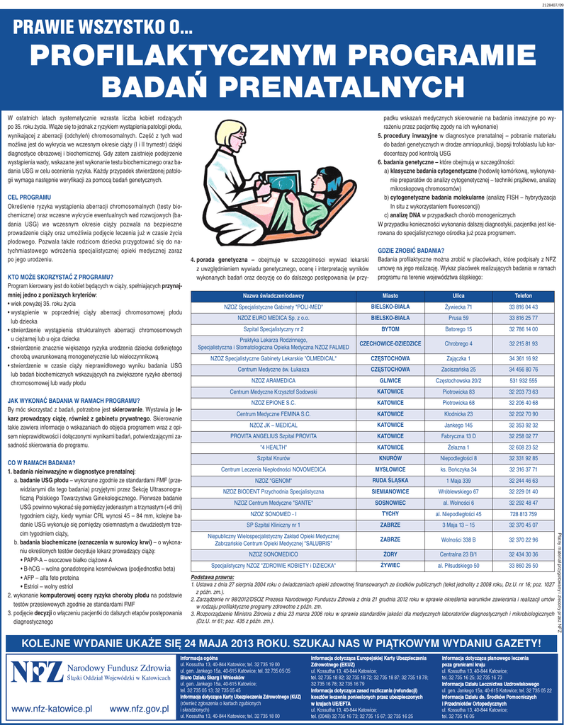 2128407/09 PRAWIE WSZYSTKO O… PROFILAKTYCZNYM PROGRAMIE BADAŃ PRENATALNYCH W ostatnich latach systematycznie wzrasta liczba kobiet rodzących po 35. roku życia. Wiąże się to jednak z ryzykiem wystąpienia patologii płodu, wynikającej z aberracji (odchyleń) chromosomalnych. Część z tych wad możliwa jest do wykrycia we wczesnym okresie ciąży (I i II trymestr) dzięki diagnostyce obrazowej i biochemicznej. Gdy zatem zaistnieje podejrzenie wystąpienia wady, wskazane jest wykonanie testu biochemicznego oraz badania USG w celu ocenienia ryzyka. Każdy przypadek stwierdzonej patologii wymaga następnie weryfikacji za pomocą badań genetycznych. CEL PROGRAMU Określenie ryzyka wystąpienia aberracji chromosomalnych (testy biochemiczne) oraz wczesne wykrycie ewentualnych wad rozwojowych (badania USG) we wczesnym okresie ciąży pozwala na bezpieczne prowadzenie ciąży oraz umożliwia podjęcie leczenia już w czasie życia płodowego. Pozwala także rodzicom dziecka przygotować się do natychmiastowego wdrożenia specjalistycznej opieki medycznej zaraz po jego urodzeniu. KTO MOŻE SKORZYSTAĆ Z PROGRAMU? Program kierowany jest do kobiet będących w ciąży, spełniających przynajmniej jedno z poniższych kryteriów: • wiek powyżej 35. roku życia • wystąpienie w poprzedniej ciąży aberracji chromosomowej płodu lub dziecka • stwierdzenie wystąpienia strukturalnych aberracji chromosomowych u ciężarnej lub u ojca dziecka • stwierdzenie znacznie większego ryzyka urodzenia dziecka dotkniętego chorobą uwarunkowaną monogenetycznie lub wieloczynnikową • stwierdzenie w czasie ciąży nieprawidłowego wyniku badania USG lub badań biochemicznych wskazujących na zwiększone ryzyko aberracji chromosomowej lub wady płodu JAK WYKONAĆ BADANIA W RAMACH PROGRAMU? By móc skorzystać z badań, potrzebne jest skierowanie. Wystawia je lekarz prowadzący ciążę, również z gabinetu prywatnego. Skierowanie takie zawiera informacje o wskazaniach do objęcia programem wraz z opisem nieprawidłowości i dołączonymi wynikami badań, potwierdzającymi zasadność skierowania do programu. 4. porada genetyczna – obejmuje w szczególności wywiad lekarski z uwzględnieniem wywiadu genetycznego, ocenę i interpretację wyników wykonanych badań oraz decyzję co do dalszego postępowania (w przy- GDZIE ZROBIĆ BADANIA? Badania profilaktyczne można zrobić w placówkach, które podpisały z NFZ umowę na jego realizację. Wykaz placówek realizujących badania w ramach programu na terenie województwa śląskiego: Nazwa świadczeniodawcy Miasto Ulica Telefon NZOZ Specjalistyczne Gabinety "POLI-MED" BIELSKO-BIAŁA Żywiecka 71 33 816 04 43 NZOZ EURO MEDICA Sp. z o.o. BIELSKO-BIAŁA Prusa 59 33 816 25 77 Szpital Specjalistyczny nr 2 BYTOM Batorego 15 32 786 14 00 Praktyka Lekarza Rodzinnego, Specjalistyczna i Stomatologiczna Opieka Medyczna NZOZ FALMED CZECHOWICE-DZIEDZICE Chrobrego 4 32 215 81 93 NZOZ Specjalistyczne Gabinety Lekarskie "OLMEDICAL" CZĘSTOCHOWA Zajączka 1 34 361 16 92 Centrum Medyczne św. Łukasza CZĘSTOCHOWA Zaciszańska 25 34 456 80 76 NZOZ ARAMEDICA GLIWICE Częstochowska 20/2 531 932 555 Centrum Medyczne Krzysztof Sodowski KATOWICE Piotrowicka 83 32 203 73 63 NZOZ EPIONE S.C. KATOWICE Piotrowicka 68 32 206 40 68 Centrum Medyczne FEMINA S.C. KATOWICE Kłodnicka 23 32 202 70 90 NZOZ JK – MEDICAL KATOWICE Jankego 145 32 353 92 32 PROVITA ANGELIUS Szpital PROVITA KATOWICE Fabryczna 13 D 32 258 02 77 "4 HEALTH" KATOWICE Żelazna 1 32 608 23 52 Szpital Knurów KNURÓW Niepodległości 8 32 331 92 85 Centrum Leczenia Niepłodności NOVOMEDICA MYSŁOWICE ks. Bończyka 34 32 316 37 71 NZOZ "GENOM" RUDA ŚLĄSKA 1 Maja 339 32 244 46 63 NZOZ BIODENT Przychodnia Specjalistyczna SIEMIANOWICE Wróblewskiego 67 32 229 01 40 NZOZ Centrum Medyczne "SANTE" SOSNOWIEC al. Wolności 6 32 292 48 47 NZOZ SONOMED - I TYCHY al. Niepodległości 45 728 813 759 SP Szpital Kliniczny nr 1 ZABRZE 3 Maja 13 – 15 32 370 45 07 Niepubliczny Wielospecjalistyczny Zakład Opieki Medycznej Zabrzańskie Centrum Opieki Medycznej "SALUBRIS" ZABRZE Wolności 338 B 32 370 22 96 NZOZ SONOMEDICO ŻORY Centralna 23 B/1 32 434 30 36 Specjalistyczny NZOZ "ZDROWIE KOBIETY i DZIECKA" ŻYWIEC al. Piłsudskiego 50 33 860 26 50 Podstawa prawna: 1. Ustawa z dnia 27 sierpnia 2004 roku o świadczeniach opieki zdrowotnej finansowanych ze środków publicznych (tekst jednolity z 2008 roku, Dz.U. nr 16; poz. 1027 z późn. zm.). 2. Zarządzenie nr 98/2012/DSOZ Prezesa Narodowego Funduszu Zdrowia z dnia 21 grudnia 2012 roku w sprawie określenia warunków zawierania i realizacji umów w rodzaju profilaktyczne programy zdrowotne z późn. zm. 3. Rozporządzenie Ministra Zdrowia z dnia 23 marca 2006 roku w sprawie standardów jakości dla medycznych laboratoriów diagnostycznych i mikrobiologicznych (Dz.U. nr 61; poz. 435 z późn. zm.). KOLEJNE WYDANIE UKAŻE SIĘ 24 MAJA 2013 ROKU. SZUKAJ NAS W PIĄTKOWYM WYDANIU GAZETY! Płatny materiał przygotowany i zlecony przez NFZ CO W RAMACH BADANIA? 1. badania nieinwazyjne w diagnostyce prenatalnej: a. badanie USG płodu – wykonane zgodnie ze standardami FMF (przewidzianymi dla tego badania) przyjętymi przez Sekcję Ultrasonograficzną Polskiego Towarzystwa Ginekologicznego. Pierwsze badanie USG powinno wykonać się pomiędzy jedenastym a trzynastym (+6 dni) tygodniem ciąży, kiedy wymiar CRL wynosi 45 – 84 mm, kolejne badanie USG wykonuje się pomiędzy osiemnastym a dwudziestym trzecim tygodniem ciąży, b. badania biochemiczne (oznaczenia w surowicy krwi) – o wykonaniu określonych testów decyduje lekarz prowadzący ciążę: • PAPP-A – osoczowe białko ciążowe A • B-hCG – wolna gonadotropina kosmówkowa (podjednostka beta) • AFP – alfa feto proteina • Estriol – wolny estriol 2. wykonanie komputerowej oceny ryzyka choroby płodu na podstawie testów przesiewowych zgodnie ze standardami FMF 3. podjęcie decyzji o włączeniu pacjentki 