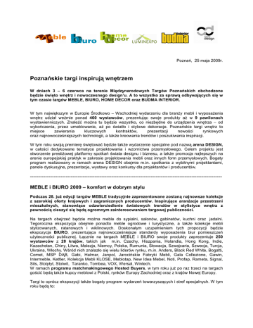 Poznań, 25 maja 2009r. Poznańskie targi inspirują wnętrzem W dniach 3 – 6 czerwca na terenie Międzynarodowych Targów Poznańskich obchodzone będzie święto wnętrz i nowoczesnego design’u. A to wszystko za sprawą odbywających się w tym czasie targów MEBLE, BIURO, HOME DECOR oraz BUDMA INTERIOR. W tym największym w Europie Środkowo – Wschodniej wydarzeniu dla branŜy mebli i wyposaŜenia wnętrz udział weźmie ponad 460 wystawców, prezentując swoje produkty aŜ w 9 pawilonach wystawienniczych. Znaleźć moŜna tu będzie wszystko, co niezbędne do urządzenia wnętrza – od wykończenia, przez umeblowanie, aŜ po światło i stylowe dekoracje. Poznańskie targi wnętrz to miejsce zawierania kluczowych kontraktów, prezentacji nowości rynkowych oraz najnowocześniejszych technologii, a takŜe kreowania trendów i poszukiwania inspiracji. W tym roku swoją premierę świętować będzie takŜe wydarzenie specjalne pod nazwą arena DESIGN, w całości dedykowane tematyce projektowania i wzornictwa przemysłowego. Celem projektu jest stworzenie prestiŜowej platformy spotkań świata designu i biznesu, a takŜe promocja najlepszych na arenie europejskiej praktyk w zakresie projektowania mebli oraz innych form przemysłowych. Bogaty program realizowany w ramach arena DESIGN obejmie m.in. spotkania z wybitnymi projektantami, panele dyskusyjne, prezentacje, wystawy oraz konkursy dla projektantów i producentów. ----------------------------------------------------------------------------------------------------------------MEBLE i BIURO 2009 – komfort w dobrym stylu Podczas 28. juŜ edycji targów MEBLE tradycyjnie zaprezentowane zostaną najnowsze kolekcje z szerokiej oferty krajowych i zagranicznych producentów. Inspirujące aranŜacje przestrzeni mieszkalnych, stanowiące odzwierciedlenie światowych trendów w stylistyce wnętrz z pewnością cieszyć się będą ogromnym zainteresowaniem targowej publiczności. Na targach obejrzeć będzie moŜna meble do sypialni, salonów, gabinetów, kuchni oraz jadalni. Tegoroczna ekspozycja obejmie ponadto meble ogrodowe i turystyczne, a takŜe kolekcje mebli stylizowanych, ratanowych i wiklinowych. Doskonałym uzupełnieniem tych propozycji będzie ekspozycja BIURO, prezentująca najnowocześniejsze standardy wyposaŜenia biur pomieszczeń uŜyteczności publicznej. Łącznie na targach MEBLE i BIURO swoje produkty zaprezentuje 250 wystawców z 20 krajów, takich jak m.in. Czechy, Hiszpania, Holandia, Hong Kong, Indie, Kazachstan, Chiny, Litwa, Malezja, Niemcy, Polska, Rumunia, Słowacja, Szwajcaria, Szwecja, Turcja, Ukraina, Włochy. Wśród nich znalazło się wielu liderów rynku, m.in. Anders, Black Red White, Bogatti, Comet, MSP DĄB, Gabi, Halmar, Janpol, Jarocińskie Fabryki Mebli, Gala Collezione, Gawin, Intermeble, Kettler, Kolekcja Mebli KLOSE, Meblotap, New Idea Mebel, Noti, Profap, Rameta, Signal, Sits, Stolpłyt, Stolwit, Taranko, Tombea, VOX, Wersal, Wintech. W ramach programu matchmakingowego Hosted Buyers, w tym roku juŜ po raz trzeci na targach gościć będą takŜe kupcy meblowi z Polski, rynków Europy Zachodniej oraz z krajów Nowej Europy. Targi to oprócz ekspozycji takŜe bogaty program wydarzeń towarzyszących i stref specjalnych. W tym roku będą to: Salon Mebli Plus: Polska branŜa meblarska. Co dalej? Dyskusje panelowe zorganizowane przez miesięcznik „Meble Plus" w oparciu o wyniki „Barometru Nastrojów BranŜy Meblarskiej" odbywać się będą codziennie o godz. 12.00 na stoisku nr 81 w pawilonie 5. O kondycji przemysłu meblarskiego w Polsce, pomocy ze środków publicznych, perspektywach dla eksportu i drogach wyjścia z kryzysu dyskutować będą zaproszeni eksperci czołowi producenci mebli, handlowcy, ekonomiści i przedstawiciele mediów branŜowych. Organizatorzy: „Meble Plus”, Międzynarodowe Targi Poznańskie Termin: 3–6 czerwca, 12.00 Miejsce: Pawilon 5, stoisko nr 81 Wręczenie nagród w prestiŜowym konkursie DIAMENT MEBLARSTWA Konkurs DIAMENT MEBLARSTWA, organizowany od 2007 roku przez portal branŜy meblarskiej meble.pl, wyróŜnia i promuje najlepszych producentów mebli w Polsce, ceniących niebanalne wzornictwo i oryginalność rozwiązań technologicznych. Uroczystość odbędzie się 4 czerwca 2009, o godz.17.00, w pawilonie 11 na terenie Międzynarodowych Targów Poznańskich. Organizatorzy: Meble.pl, Międzynarodowe Targi Poznańskie Termin: 4 czerwca, 17.00 Miejsce: Pawilon 11 (Iglica) MEBLE live - targowe studio telewizyjne Targowe studio telewizyjne zrealizowane we współpracy z portalem meble.pl działać będzie przez cały czas trwania targów, dokumentując wszystkie waŜniejsze wydarzenia, ekspozycje wystawców oraz niezapomnianą atmosferę najwaŜniejszego spotkania branŜowego w Polsce. Filmowe relacje oraz wywiady z przedstawicielami firm obecnych na targach oglądać moŜna na Ŝywo za pośrednictwem strony internetowej www.meble.mtp.pl. Studio zlokalizowane zostało w pawilonie 5 na stoisku nr 6. Organizatorzy: Meble.pl, Międzynarodowe Targi Poznańskie Termin: 3-6 czerwca Miejsce: Pawilon 5, stoisko nr 6 Konferencje i seminaria branŜowe OIGPM Cykl spotkań zorganizowanych przez Ogólnopolską Izbę Gospodarczą Producentów Mebli, poświęconych m.in. aktualnym zagadnieniom sprzedaŜy i promocji polskich mebli na rynkach zagranicznych, programowi promocji Znaku BranŜowego „POLSKIE MEBLE - POTWIERDZONA JAKOŚĆ" oraz uregulowaniom prawnym związanym z zakupem mebli biurowych. Na stoisku Izby w pawilonie 6A realizowany jest dodatkowo program informacyjno-edukacyjny adresowany do odwiedzających targi klientów indywidualnych, pracowników sklepów meblowych oraz pracowników firm meblarskich. Prezentacje pod hasłem: „Wszystko o meblach od producenta do klienta" poruszać będą m.in. tematy bezpieczeństwa, ergonomii, wzornictwa i uŜytkowania mebli, a takŜe wyposaŜenia dodatkowego. Organizatorzy: Ogólnopolska Izba Gospodarcza Producent