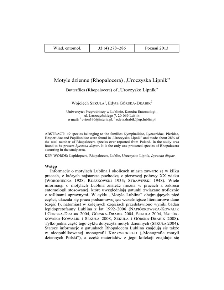 Wiad. entomol. 32 (4) 278–286 Poznań 2013 Motyle dzienne (Rhopalocera) „Uroczyska Lipnik” Butterflies (Rhopalocera) of „Uroczysko Lipnik” Wojciech SEKUŁA1, Edyta GÓRSKA-DRABIK2 Uniwersytet Przyrodniczy w Lublinie, Katedra Entomologii, ul. Leszczyńskiego 7, 20-069 Lublin e-mail: 1 [email protected], 2 [email protected] ABSTRACT: 49 species belonging to the families Nymphalidae, Lycaenidae, Pieridae, Hesperiidae and Papilionidae were found in „Uroczysko Lipnik” and made about 28% of the total number of Rhopalocera species ever reported from Poland. In the study area found to be present Lycaena dispar. It is the only one protected species of Rhopalocera occurring in the study area. KEY WORDS: Lepidoptera, Rhopalocera, Lublin, Uroczysko Lipnik, Lycaena dispar. Wstęp Informacje o motylach Lublina i okolicach miasta zawarte są w kilku pracach, z których najstarsze pochodzą z pierwszej połowy XX wieku (WORONIECKA 1928; RUSZKOWSKI 1933; STRAWIŃSKI 1948). Wiele informacji o motylach Lublina znaleźć można w pracach z zakresu entomologii stosowanej, które uwzględniają gatunki związane troficznie z roślinami uprawnymi. W cyklu „Motyle Lublina” obejmujących pięć części, ukazała się praca podsumowująca wcześniejsze literaturowe dane (część I), natomiast w kolejnych częściach przedstawiono wyniki badań lepidopretofauny Lublina z lat 1992–2006 (NAPIÓRKOWSKA-KOWALIK i GÓRSKA-DRABIK 2004, GÓRSKA-DRABIK 2004, SEKUŁA 2004, NAPIÓRKOWSKA-KOWALIK i SEKUŁA 2008, SEKUŁA i GÓRSKA-DRABIK 2008). Tylko jedna część tego cyklu dotyczyła motyli dziennych (SEKUŁA 2004). Starsze informacje o gatunkach Rhopalocera Lublina znajdują się także w nieopublikowanej monografii KRZYWICKIEGO („Monografia motyli dziennych Polski”), a część materiałów z jego kolekcji znajduje się MOTYLE DZIENNE (RHOPALOCERA) „UROCZYSKA LIPNIK” 279 w Muzeum Przyrodniczym Uniwersytetu Marii Curie-Skłodowskiej w Lublinie. Niniejsze opracowanie jest kontynuacją badań dotyczących występowania motyli w Lublinie. Celem badań było zinwentaryzowanie fauny motyli dziennych cennego przyrodniczo terenu „Uroczysko Lipnik” położonego w granicach administracyjnych miasta, który dotychczas nie był zbadany pod kątem tej grupy owadów. Teren badań Uroczysko Lipnik stanowi część dzielnicy Rudnik, położonej w północno-wschodniej części Lublina. Obszar ten o powierzchni około 5,5 ha stanowi rozgałęziony i rozległy wąwóz lessowy, który jest charakterystycznym elementem rzeźby Wyżyny Lubelskiej. Różnica wysokości w wąwozie to około 30 m, a maksymalne nachylenie stoku wynosi około 30–40o. Stoki wąwozu zarośnięte są przez zbiorowiska roślinności murawowo-zaroślowej oraz coraz bardziej licznymi zadrzewieniami i zakrzewieniami. Kserotermiczną roślinność (35 gatunków roślin naczyniowych) z klasy Festuco-Brometea tego terenu stanowią w dużej mierze gatunki łąkowe i światłolubne rośliny okrajkowe z klasy Trifolio-Geranietea, a także gatunki synantropijne tj.: nawłoć olbrzymia Solidago gigantea L., trzcinnik piaskowy Calamagrostis epigeios L., ostrożeń polny Cirsium arvense L. i bylica pospolita Artemisia vulgaris L. oraz wodno-szuwarowe. Roślinność tego terenu ma charakter półnaturalny. Znajdują się tu gatunki kalcyfile, także pochodzenia stepowego. Znaleźć tu można szałwię łąkową Salvia pratensis L., rutewkę mniejszą Thalictrum minus L., goździka kartuzka Dianthus carthusianorum L., wiązówkę bulwkowatą Filipendula hexapetala Moench, driakiew żółtawą Scobiosa ochroleuca L., żebrzycę roczną Seceli annuum L., dziewannę fioletową Verbascum phoeniceum L. i przetacznika kłosowego Veronica spicata L. Obecne tu murawy kserotermiczne bogate są w rzadkie gatunki stepowe, tj.: Carex Michelin L., Festuca valesiaca L., Peucedaniu alsaticum L., Seseli annuum L., Veronica austriaca L. i Phleum phleoides L. Na dnie wąwozu znajdują się zagłębienia trwałe i wypełniające się wodą okresowo (FIJAŁKOWSKI 1954, IZDEBSKI 1958). Uroczysko Lipnik zostało przebadane pod kątem wybranych grup kręgowców i bezkręgowców związanych ze zbiornikami wodnymi. Stwierdzono obecność 10 gatunków płazów oraz 32 gatunki chrząszczy (Coleoptera), 16 gatunków ważek (Odonata) oraz 8 gatunków pluskwiaków (BERNARD i in. 2004, BIESIADKA i PAKULNICKA 2004, PAWŁOWSKI 280 W. SEKUŁA, E. GÓRSKA-DRABIK i in. 2002, PRZEWOŹNY i in. 2006). Wśród zinwentaryzowanych zwierząt, są także gatunki objęte ochroną gatunkową i znajdujące się na „Czerwonej Liście Zwierząt Ginących i Zagrożonych w Polsce”: żegnicy południowej Aeshna affinis (L.), kałużnicy czarnozielonej Hydrophilus piceus (L.), traszki grzebieniastej Triturus cristatus LAUR. i kumaka nizinnego Bombina bombina L. (BALANA i in. 2006). Ten cenny przyrodniczo obszar ulega degradacji na skutek postępującej erozji, eutrofizacji gleb i urbanizacji, a także ekspansji roślinności ruderalnej i działalności człowieka. Obecnie teren ten częściowo użytkowany jest przez zwolenników motokrosu. Materiał i metody Badania prowadzono w okresie od trzeciej dekady kwietnia do końca trzeciej dekady września w latach 2010 i 2011 z częstotliwością co 14 dni. Obserwacje przeprowadzono w godzinach przedpołudniowych oraz wczesnych godzinach popołudniowych w dni z niewielkim zachmurzeniem, słabym wiatrem i przy temperaturze 17–25oC. Obecność poszczególnych osobników odnotowywano w dzienniku. Przy określeniu liczebności posłużono się czterostopniową skalą uwzględniającą liczbę obserwowanych osobników: pojedynczy (1–5 osobników), rzadki (6–15 osobników), liczny (16–100 osobników), bardzo liczny (powyżej 100 osobników). Dla każdego gatunku podano okres występowania (cyfrą rzymską oznaczono miesiąc, a cyfrą arabską dekady). Porządek systematyczny rodzin i nazewnictwo przyjęto według BUSZKI i MASŁOWSKIEGO (2008). Wyni