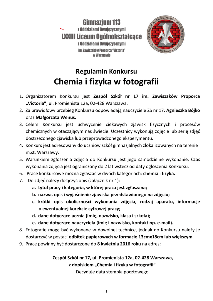 Regulamin Konkursu Chemia i fizyka w fotografii 1. Organizatorem Konkursu jest Zespół Szkół nr 17 im. Zawiszaków Proporca „Victoria”, ul. Promienista 12a, 02-428 Warszawa. 2. Za prawidłowy przebieg Konkursu odpowiadają nauczyciele ZS nr 17: Agnieszka Bójko oraz Małgorzata Wenus. 3. Celem Konkursu jest uchwycenie ciekawych zjawisk fizycznych i procesów chemicznych w otaczającym nas świecie. Uczestnicy wykonują zdjęcie lub serię zdjęć dostrzeżonego zjawiska lub przeprowadzonego eksperymentu. 4. Konkurs jest adresowany do uczniów szkół gimnazjalnych zlokalizowanych na terenie m.st. Warszawy. 5. Warunkiem zgłoszenia zdjęcia do Konkursu jest jego samodzielne wykonanie. Czas wykonania zdjęcia jest ograniczony do 2 lat wstecz od daty ogłoszenia Konkursu. 6. Prace konkursowe można zgłaszać w dwóch kategoriach: chemia i fizyka. 7. Do zdjęć należy dołączyć opis (załącznik nr 1): a. tytuł pracy i kategoria, w której praca jest zgłaszana; b. nazwa, opis i wyjaśnienie zjawiska przedstawionego na zdjęciu; c. krótki opis okoliczności wykonania zdjęcia, rodzaj aparatu, informacje o ewentualnej korekcie cyfrowej pracy; d. dane dotyczące ucznia (imię, nazwisko, klasa i szkoła); e. dane dotyczące nauczyciela (imię i nazwisko, kontakt np. e-mail). 8. Fotografie mogą być wykonane w dowolnej technice, jednak do Konkursu należy je dostarczyć w postaci odbitek papierowych w formacie 13cmx18cm lub większym. 9. Prace powinny być dostarczone do 8 kwietnia 2016 roku na adres: Zespół Szkół nr 17, ul. Promienista 12a, 02-428 Warszawa, z dopiskiem „Chemia i fizyka w fotografii”. Decyduje data stempla pocztowego. 1 10.Korekta cyfrowa zdjęć przesłanych na Konkurs może polegać jedynie na działaniach odpowiadających zabiegom stosowanym w ciemni fotograficznej (redukcja koloru, rozjaśnianie, kontrastowanie). Wszelkie inne zmiany, w tym fotomontaż, są niedopuszczalne. 11.Przy ocenie prac będzie brana pod uwagę umiejętność dostrzegania i dokumentowania zjawisk fizycznych i procesów chemicznych. 12. Oceny zdjęć dokona Komisja Konkursu, przewidziane są nagrody rzeczowe za I, II i III miejsce w każdej kategorii. 13.Komisja Konkursu może przyznać dwie nagrody tego samego stopnia. 14.Każdy uczestnik konkursu może otrzymać tylko jedną nagrodę. 15.Komisja Konkursu ma prawo odrzucić prace niezgodne z Regulaminem, odbiegające od tematu, wadliwe technicznie lub naruszające prawo. 16.Do Konkursu nie zostaną przyjęte zdjęcia, których wykonanie odbyło się z naruszeniem zasad bezpieczeństwa, mogło spowodować zagrożenie dla zdrowia lub życia, oraz zdjęcia zawierające treści obraźliwe czy wulgarne. 17.Zdjęcia zgłoszone do Konkursu nie mogą naruszać jakichkolwiek praw osób trzecich, w szczególności praw autorskich, dóbr osobistych lub prawa do ochrony wizerunku. 18. Oficjalne ogłoszenie wyników Konkursu oraz wręczenie nagród nastąpi 18 maja 2016 roku o godz. 12.00 w Zespole Szkół nr 17, ul. Promienista 12a, Warszawa. 19.Zgłoszenie pracy do Konkursu oznacza, że Uczestnikowi przysługuje autorskie prawo majątkowe i osobiste do nadesłanych zdjęć. 20.Przystąpienie do Konkursu oznacza wyrażenie zgody na przetwarzanie danych osobowych uczestników przez Organizatora w celu przeprowadzenia i rozstrzygnięcia Konkursu oraz identyfikacji Uczestników i Laureatów Konkursu, wydania nagród oraz publicznego podania imion i nazwisk osób nagrodzonych, nazwy szkoły, imienia i nazwiska nauczyciela, zgodnie z ustawą o ochronie danych osobowych. 21.Wszystkie prace biorące udział w konkursie przechodzą na własność Organizatora (nie będą zwracane Uczestnikom Konkursu). Organizator zastrzega sobie prawo do różnych form publikacji nadesłanych prac. 22.Zgłoszenie zdjęć do Konkursu jest jednoznaczne z przyjęciem przez Uczestnika Konkursu warunków Regulaminu. 23.Naruszenie przez Uczestnika Konkursu któregokolwiek z warunków uczestnictwa w Konkursie, spowoduje utratę prawa do otrzymania nagrody. W przypadku stwierdzenia naruszenia zapisów niniejszego Regulaminu, Uczestnik Konkursu będzie zobowiązany do zwrotu otrzymanej nagrody. 24.Dodatkowe informacje i wyjaśnienia można uzyskać pod numerem telefonu 022 863 73 04 lub pod adresem e-mail: [email protected]. 2 Załącznik nr 1 – Konkurs „Chemia i fizyka w fotografii” 2016 Autor pracy: Szkoła, klasa: Nauczyciel: Tytuł pracy: Nazwa, opis i wyjaśnienie zjawiska (do 200 słów): Opis okoliczności wykonania zdjęcia, rodzaj aparatu, informacja o ewentualnej korekcie cyfrowej: Kategoria (chemia lub fizyka): Liczba zdjęć (dotyczy serii zdjęć): Dane kontaktowe nauczyciela (np. e-mail): 3