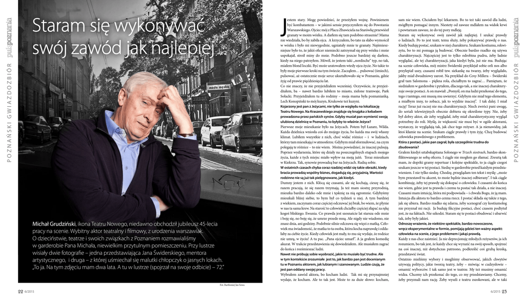 POZNAŃSKI GWIAZDOZBIÓR Kojarzony jest pan z Jeżycami, nie tylko ze względu na lokalizację Teatru Nowego. Na Kraszewskiego znajduje się knajpka z kebabem prowadzona przez pańskich synów. Gdyby musiał pan wymienić swoją ulubioną dzielnicę w Poznaniu, to byłyby to właśnie Jeżyce? Pierwsze moje mieszkanie było na Jeżycach. Potem był Łazarz, Wilda. Każda dzielnica wniosła coś do mojego życia, bo każda ma swój własny klimat. Lubiłem wszystkie z nich, choć widać różnice – i w ludziach, którzy tam mieszkają i w atmosferze. Gdybym miał sformułować, na czym polegają te różnice – to nie wiem. Można powiedzieć, że inaczej pulsują. Poprzez wydarzenia, które się działy na poszczególnych etapach mojego życia, każde z tych miejsc miało wpływ na moją jaźń. Teraz mieszkam w Kiekrzu. Tak, synowie prowadzą bar na Jeżycach. Radzą sobie. W ostatnich czasach chyba coraz rzadziej widzi się takie obrazki, kiedy bracia prowadzą wspólny biznes, dogadują się, przyjaźnią. Wartości rodzinne nie są już tak pielęgnowane, jak kiedyś. Michał Grudziński, ikona Teatru Nowego, niedawno obchodził jubileusz 45-lecia pracy na scenie. Wybitny aktor teatralny i filmowy, z urodzenia warszawiak. O dzieciństwie, teatrze i swoich związkach z Poznaniem rozmawialiśmy w garderobie Pana Michała, niewielkim przytulnym pomieszczeniu. Przy lustrze wisiały dwie fotografie – jedna przedstawiająca Jana Świderskiego, mentora artystycznego, i druga – z której uśmiechał się malutki chłopczyk o jasnych lokach. „To ja. Na tym zdjęciu mam dwa lata. A tu w lustrze (spojrzał na swoje odbicie) – 72.” Dumny jestem z nich. Kłócą się czasami, ale się kochają, cieszę się, że razem pracują, że się razem trzymają. Ja też mam siostrę przyrodnią, mieszka bardzo daleko ode mnie i tęsknię za nią ogromnie. Gdybyśmy mieszkali bliżej siebie, to bym był co tydzień u niej. A tym bardziej z wiekiem, zaczynam coraz częściej odczuwać jej brak, bo wiem, że płynie w nas ta sama krew. Na starość to człowiek chciałby częściej złapać za rękę kogoś bliskiego. Ewunia. Co prawda jest szesnaście lat starsza ode mnie i boję się, no boję się, że umrze przede mną. Ale nigdy nie wiadomo, nie znasz dnia, ani godziny. Podobnie silnie odczuwa się więzi z matką. Człowiek ma świadomość, że matka to ta osoba, która kocha naprawdę i oddałaby za ciebie życie. Kiedy człowiek jest mały, to mu się wydaje, że rodzice nie umrą, w życiu! A tu pac. „Pana ojciec umarł”. A ja grałem komedię akurat. W trakcie przedstawienia się dowiedziałem. Ale musiałem zagrać do końca i rozśmieszać ludzi. Nawet nie próbuję sobie wyobrazić, jakie to musiało być trudne. Ale w tym kontekście zrozumiałe jest to, jak bardzo pan jest docenianym tu w Poznaniu aktorem, jak lubianym i szanowanym. Ludzie czują, że jest pan oddany swojej pracy. Wybrałem zawód aktora, bo kocham ludzi. Tak mi się przynajmniej wydaje, że kocham. Ale to tak jest. Może to za duże słowo: kocham, sam nie wiem. Chciałem być lekarzem. Bo to też taki zawód dla ludzi, mógłbym pomagać innym. Niestety od zawsze mdlałem na widok krwi i powtarzam zawsze, że do tej pory mdleję. Staram się wykonywać swój zawód jak najlepiej. I szukać prawdy o ludziach. Po to jest teatr, temu służy, żeby pokazywać prawdę o nas. Kiedy buduję postać, szukam w niej charakteru. Szukam kostiumu, rekwizytu, bo to mi pomaga ją budować. Obecnie bardzo rzadko się używa charakteryzacji. Najczęściej jest to tylko odrobina pudru, żeby ładnie wyglądać, ale tej charakteryzacji, jaka kiedyś była, już nie ma. Budując na scenie człowieka, mój mistrz Świderski przyklejał sobie orli nos albo przylepiał uszy, czasami robił tzw. siekankę na twarzy, żeby wyglądało, jakby miał dwudniowy zarost. Na przykład do Ceny Millera – Świderski grał tam Salomona – piękna rola, chciałbym to zagrać… Pamiętam, że siedziałem w garderobie i pytałem, dlaczego tak, a nie inaczej charakteryzuje swoje postaci. A on mawiał: „Pomyśl, on ma ludzi przekonać do tego, tego i tamtego, oni muszą mu uwierzyć. Gdybym nie miał tego elementu, a miałbym inny, to zobacz, jak to wyjdzie inaczej”. I tak dalej. I miał rację! Teraz już raczej nie ma charakteryzacji. Niech zwróci pani uwagę, do seriali telewizyjnych obecnie dobiera się określone typy. Nie, żeby był dobry aktor, ale żeby wyglądał, żeby miał charakterystyczny wygląd potrzebny do roli. Myślę, że większość nie musi być w ogóle aktorami, wystarczy, że wyglądają tak, jak chce tego reżyser. A ja nienawidzę, jak ktoś kłamie na scenie. Szukam ciągle prawdy i tym żyję. Chcę budować człowieka prawdziwego z problemem. Która z postaci, jakie pan zagrał, była szczególnie trudna do zbudowania? Grałem kiedyś sztabskapitana Solonego w Trzech siostrach, bardzo skonfliktowanego ze sobą oficera. I ciągle nie mogłem go złamać. Zresztą tak mam, że dopóki gramy repertuar i kolejne spektakle, to ja ciągle czegoś szukam jeszcze w tej postaci. Siedzę w garderobie przed każdym przedstawieniem. I nie tylko siedzę. Chodzę, przeglądam ten tekst i myślę: „może bym przestawił tu akcent, to może będzie inaczej odbierany”. I tak ciągle kombinuję, żeby tej prawdy się dokopać o człowieku. I czasami do końca nie wiem, gdzie jest ta prawda i czemu ta postać tak działa, a nie inaczej. Czasami mam intuicję, która mi podpowiada – i chwała Bogu, że ją mam. Intuicja dla aktora to bardzo cenna rzecz. I postać składa się także z tego, jak się ubiera. Bardzo rzadko się zdarza, żeby scenograf czy kostiumolog nie przyznał mi racji. Ja buduję fikcyjne postaci, choć czasem podtytuł jest, że na faktach. Nie szkodzi. Staram się te postaci obudować i ubarwić tak, żeby były jakieś. Odnoszę wrażenie, że niektóre spektakle, bardzo nowoczesne, wręcz ekspery