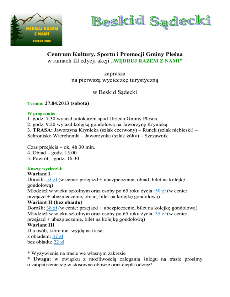 Centrum Kultury, Sportu i Promocji Gminy Pleśna w ramach III edycji akcji „WĘDRUJ RAZEM Z NAMI” zaprasza na pierwszą wycieczkę turystyczną w Beskid Sądecki Termin: 27.04.2013 (sobota) W programie: 1. godz. 7.30 wyjazd autokarem spod Urzędu Gminy Pleśna 2. godz. 9.20 wyjazd kolejką gondolową na Jaworzynę Krynicką 3. TRASA: Jaworzyna Krynicka (szlak czerwony) – Runek (szlak niebieski) – Schronisko Wierchomla – Jaworzynka (szlak żółty) – Szczawnik Czas przejścia – ok. 4h 30 min. 4. Obiad – godz. 15.00 5. Powrót – godz. 16.30 Koszty wycieczki: Wariant I Dorośli: 53 zł (w cenie: przejazd + ubezpieczenie, obiad, bilet na kolejkę gondolową) Młodzież w wieku szkolnym oraz osoby po 65 roku życia: 50 zł (w cenie: przejazd + ubezpieczenie, obiad, bilet na kolejkę gondolową) Wariant II (bez obiadu) Dorośli: 38 zł (w cenie: przejazd + ubezpieczenie, bilet na kolejkę gondolową) Młodzież w wieku szkolnym oraz osoby po 65 roku życia: 35 zł (w cenie: przejazd + ubezpieczenie, bilet na kolejkę gondolową) Wariant III Dla osób, które nie wyjdą na trasę: z obiadem: 37 zł bez obiadu: 22 zł * Wyżywienie na trasie we własnym zakresie * Uwaga: w związku z możliwością zalegania śniegu na trasie prosimy o zaopatrzenie się w stosowne obuwie oraz ciepłą odzież! Kierownik wycieczki: Jan Wójtowicz Zgłoszenia wraz z opłatą do dnia 23.04.2013 (wtorek) w Centrum Kultury, Sportu i Promocji Gminy Pleśna. Osoby, które nie dokonają wpłaty do ustalonego wyżej terminu, zostaną skreślone z listy uczestników. Uwaga: nie przyjmujemy opłat w autobusie w dniu wycieczki oraz nie zapisujemy na telefon! Osoby zainteresowane proszone są o zapoznanie z regulaminem. Chęć uczestnictwa i udział w wycieczce oznaczają pełną akceptację jego warunków. Organizator: Centrum Kultury, Sportu i Promocji Gminy Pleśna