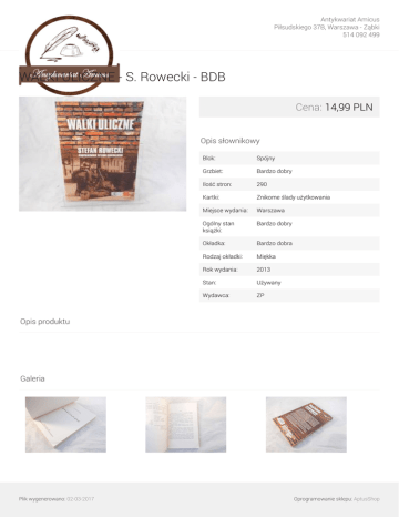 Antykwariat Amicus Piłsudskiego 37B, Warszawa - Ząbki 514 092 499 WALKI ULICZNE - S. Rowecki - BDB Cena: 14,99 PLN Opis słownikowy Blok: Spójny Grzbiet: Bardzo dobry Ilość stron: 290 Kartki: Znikome ślady użytkowania Miejsce wydania: Warszawa Ogólny stan książki: Bardzo dobry Okładka: Bardzo dobra Rodzaj okładki: Miękka Rok wydania: 2013 Stan: Używany Wydawca: ZP Opis produktu Galeria Plik wygenerowano: 02-03-2017 Powered by TCPDF (www.tcpdf.org) Oprogramowanie sklepu: AptusShop