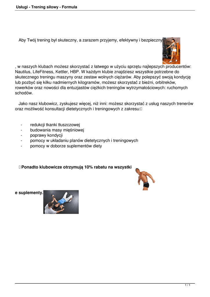 Usługi - Trening siłowy - Formula Aby Twój trening był skuteczny, a zarazem przyjemy, efektywny i bezpieczny , w naszych klubach możesz skorzystać z łatwego w użyciu sprzętu najlepszych producentów: Nautilus, LifeFitness, Kettler, HBP. W każdym klubie znajdziesz wszystkie potrzebne do skutecznego treningu maszyny oraz zestaw wolnych ciężarów. Aby polepszyć swoją kondycję lub pozbyć się kilku nadmiernych kilogramów, możesz skorzystać z bieżni, orbitreków, rowerków oraz nowości dla entuzjastów ciężkich treningów wytrzymałościowych: ruchomych schodów. Jako nasz klubowicz, zyskujesz więcej, niż inni: możesz skorzystać z usług naszych trenerów oraz możliwość konsultacji dietetycznych i treningowych z zakresu: - redukcji tkanki tłuszczowej budowania masy mięśniowej poprawy kondycji pomocy w układaniu planów dietetycznych i treningowych pomocy w doborze suplementów diety Ponadto klubowicze otrzymują 10% rabatu na wszystki e suplementy. 1/1