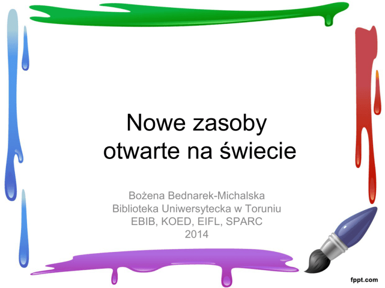 Nowe zasoby otwarte na świecie Bożena Bednarek-Michalska Biblioteka Uniwersytecka w Toruniu EBIB, KOED, EIFL, SPARC 2014 Co to znaczy OTWARTE? 1. autor(rzy) i właściciel(e) praw autorskich przyznają użytkownikom nieograniczone i nieodwołalne prawo dostępu do zasobów i publiczną licencję na kopiowanie, użycie, dystrybuowanie, transmitowanie i wyświetlanie dzieła, także na wykonanie i dystrybuowanie pochodnej dzieła w dowolnej postaci cyfrowej, dla ważnych celów, które to prawa uzależnione są od dokładnego podania atrybucji dotyczących autorstwa (standardy publiczne będą rozwijane tak, by dostarczały mechanizmów dla właściwego wprowadzania w życie przynależnych autorom praw i odpowiedzialnego ich używania, tak jak to się robi teraz) oraz udzielają prawa do zrobienie małej liczby drukowanych kopii dla osobistego użytku. 2. Kompletna wersja pracy i wszystkie dodatkowe materiały wraz z kopią pozwolenia na wyżej wymienione wykorzystanie, w odpowiednim standardowym elektronicznym formacie, jest deponowana (i tym samym publikowana) przynajmniej w jednym z repozytoriów dostępnych on-line pracujących na platformie technicznej także zgodnej ze standardami (jak w definicji Open Archive), a utrzymywanej i wspieranej przez instytucję akademicką, towarzystwo naukowe, agencję rządową lub inną wiarygodną organizację, która jest w stanie realizować wolny dostęp do wiedzy i nierestrykcyjną dystrybucję z długoterminowym archiwizowaniem. 2 zasady z Deklaracji Berlińskiej Poziomy otwartości! Co to znaczy ZASOBY? Termin „zasoby" nie oznacza jedynie treści, ale obejmuje (wg OECD, 2007) trzy istotne elementy powiązane ze sobą: Treści - edukacyjne czy naukowe: pełne kursy, moduły, obiekty cyfrowe, kolekcje książek, czasopisma lub artykuły, itp.; Narzędzia: oprogramowanie wspierające nauczanie, użytkowanie, udostępnianie, przechowywanie treści, przeszukanie i organizację zasobu, systemy zarządzania treścią i nauczaniem, narzędzia społecznościowe itp.; Modele: zasady implementacji i organizacji tych zasobów, np. zastosowanie wolnych licencji prawnoautorskich, odmiennych modeli biznesowych, stosowanie wysokiej jakości standardów związanych z cyfrowym przekazem. Giving Knowledge for Free: the Emergence of Open Educational Resources. Centre for educational research and innovation. Paris, OECD Publishing 2007. Tryb dostępu:http://www.oecd.org/edu/ceri/givingknowledgeforfreetheemergenceofopeneducationalresourc es.htm. ISBN: 9789264032125. Kto tworzy otwarte zasoby? Biblioteki, archiwa, muzea (GLAM) ● Instytucje naukowe i fundacje naukowe ● Międzynarodowe organizacje (ONZ, OECD, Bank Światowy i inne) ● Instytucje non-profit ● Rządy ● Firmy komercyjne ● Niektóre statystyki OA Typy zasobów ze względu na zastosowanie w praktyce szkoły wyższej Naukowe, badawcze – czasopisma otwarte, repozytoria, surowe dane badawcze, otwarte laboratoria, otwarte recenzje, Dydaktyczne – kursy e-learningowe, podręczniki, wykłady (audio/video lub prezentacje), scenariusze zajęć, poradniki, lektury, proste obiekty cyfrowe, encyklopedia Listy czasopism otwartych 1. Czasopisma open access – DOAJ 9.804 tytuły http://www.doaj.org/. 2. Lista Regensburska – ponad 111.000 tytułów, http://rzblx1.uni-regensburg.de/ezeit/ 3. OSD EBSCO – http://www.opensciencedirectory.net/ około 13.000 czasopism Przykładowe czasopisma OA Nowatorskie podejście: PLOS – Public Library of Science http://www.plos.org/publications/ Czy to portal (blogi, kolekcje, czasopisma, innowacje, laboratorium)? Czy repozytorium artykułów? Czy nowym kanałem komunikacyjnym dla badań (currents)? Czy daje dostęp do czasopism czy do surowych danych? (atomizacja czasopisma, atomizacja artykułu) Article Source: ‘HypothesisFinder:’ A Strategy for the Detection of Speculative Statements in Scientific Text. Malhotra A, Younesi E, Gurulingappa H, Hofmann-Apitius M (2013) ‘HypothesisFinder:’ A Strategy for the Detection of Speculative Statements in Scientific Text. PLoS Comput Biol 9(7): e1003117. doi:10.1371/journal.pcbi.1003117. http://www.ploscompbiol.org/article/info%3Adoi%2F10.1371%2Fjournal.pcbi.1003117 Listy repozytoriów otwartych publikacji 1. Repozytoria open access – ROAR, OpenDOAR - http://www.opendoar.org/. 2. ROAR - http://roar.eprints.org/ 3. Open Access Directory http://oad.simmons.edu/oadwiki/Disciplinar y_repositories Przykładowe repozytoria otwarte publikacji naukowych 1. Scielo - http://www.scielo.org/php/index.php (ponadnarodowe) 2. HAL - http://hal.archives-ouvertes.fr/ (krajowe centralne) 3. ORBI - http://orbi.ulg.ac.be/project?id=108 (instytucjonalne repozytorium + bibliografia) Wielość baz Chmura http://lod-cloud.net/ bazuje na zasobach DataHub, Open Knowledge Foundation Listy repozytoriów surowych danych DataBib, DataHub Open Access Directory Data Repositories figshare Przykładowe repozytoria otwartych danych badawczych NASA's Global Change Master Directory http://gcmd.nasa.gov/ Bank Światowy http://data.worldbank.org/ International Council for Science World Data System http:// www.icsu-wds.org/services/data-portal, DANS http://www.dans.knaw.nl/en (Film o wadze zbierania danych naukowych http://youtu.be/HJbo-OAaJ1I ) Kompendium o peptydach PAe000005: Human prostate cancer cell lines, cytosolic, ICAT Organism: Human Dates Deposit: August 19, 2002 Publications Lin B, White JT, Lu W, Xie T, Utleg AG, Yan X, Yi EC, Shannon P, Khrebtukova I, Lange PH, Evidence for the presence of disease-perturbed networks in prostate cancer cells by genomic and proteomic analyses: a systems approach to disease. Cancer Res. Summary Human prostate cancer cell lines: LNCaP, CL-1, cytosolic. labeled with old ICAT cytosolic fraction comparison with ICAT Preparation Growth: LNCaP and CL1 cells were grown as described by Tso et al. Cancer J Sci Am 2000, 6: 220–33. Digestion: Procedures based on Han et al., Nat Biotechnol 2001; 19: 946–51. Extract: Fr