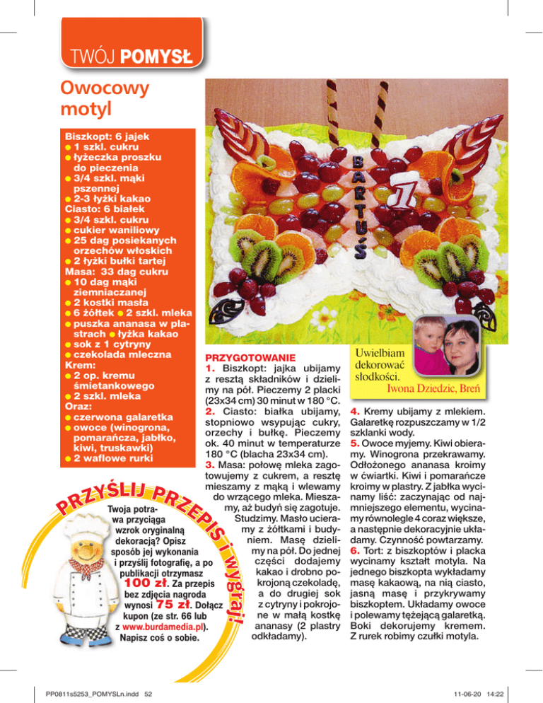 TWÓJ POMYSŁ Owocowy motyl Biszkopt: 6 jajek ● 1 szkl. cukru ● łyżeczka proszku do pieczenia ● 3/4 szkl. mąki pszennej ● 2-3 łyżki kakao Ciasto: 6 białek ● 3/4 szkl. cukru ● cukier waniliowy ● 25 dag posiekanych orzechów włoskich ● 2 łyżki bułki tartej Masa: 33 dag cukru ● 10 dag mąki ziemniaczanej ● 2 kostki masła ● 6 żółtek ● 2 szkl. mleka ● puszka ananasa w plastrach ● łyżka kakao ● sok z 1 cytryny ● czekolada mleczna Krem: ● 2 op. kremu śmietankowego ● 2 szkl. mleka Oraz: ● czerwona galaretka ● owoce (winogrona, pomarańcza, jabłko, kiwi, truskawki) ● 2 waflowe rurki PRZYGOTOWANIE 1. Biszkopt: jajka ubijamy z resztą składników i dzielimy na pół. Pieczemy 2 placki (23x34 cm) 30 minut w 180 °C. 2. Ciasto: białka ubijamy, stopniowo wsypując cukry, orzechy i bułkę. Pieczemy ok. 40 minut w temperaturze 180 °C (blacha 23x34 cm). 3. Masa: połowę mleka zagotowujemy z cukrem, a resztę mieszamy z mąką i wlewamy do wrzącego mleka. Mieszamy, aż budyń się zagotuje. Twoja potraStudzimy. Masło ucierawa przyciąga my z żółtkami i budywzrok oryginalną niem. Masę dzielidekoracją? Opisz my na pół. Do jednej sposób jej wykonania części dodajemy i przyślij fotografię, a po kakao i drobno popublikacji otrzymasz krojoną czekoladę, 100 zł. Za przepis a do drugiej sok bez zdjęcia nagroda z cytryny i pokrojowynosi 75 zł. Dołącz ne w małą kostkę kupon (ze str. 66 lub ananasy (2 plastry z www.burdamedia.pl). odkładamy). Napisz coś o sobie. PP0811s5253_POMYSLn.indd 52 Uwielbiam dekorować słodkości. Iwona Dziedzic, Breń 4. Kremy ubijamy z mlekiem. Galaretkę rozpuszczamy w 1/2 szklanki wody. 5. Owoce myjemy. Kiwi obieramy. Winogrona przekrawamy. Odłożonego ananasa kroimy w ćwiartki. Kiwi i pomarańcze kroimy w plastry. Z jabłka wycinamy liść: zaczynając od najmniejszego elementu, wycinamy równolegle 4 coraz większe, a następnie dekoracyjnie układamy. Czynność powtarzamy. 6. Tort: z biszkoptów i placka wycinamy kształt motyla. Na jednego biszkopta wykładamy masę kakaową, na nią ciasto, jasną masę i przykrywamy biszkoptem. Układamy owoce i polewamy tężejącą galaretką. Boki dekorujemy kremem. Z rurek robimy czułki motyla. 11-06-20 14:22