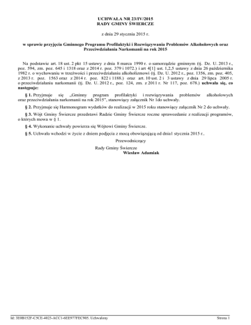 UCHWAŁA NR 23/IV/2015 RADY GMINY ŚWIERCZE z dnia 29 stycznia 2015 r. w sprawie przyjęcia Gminnego Programu Profilaktyki i Rozwiązywania Problemów Alkoholowych oraz Przeciwdziałania Narkomanii na rok 2015 Na podstawie art. 18 ust. 2 pkt 15 ustawy z dnia 8 marca 1990 r. o samorządzie gminnym (tj. Dz. U. 2013 r., poz. 594, zm. poz. 645 i 1318 oraz z 2014 r. poz. 379 i 1072.) i art 4[1] ust. 1,2,5 ustawy z dnia 26 października 1982 r. o wychowaniu w trzeźwości i przeciwdziałaniu alkoholizmowi (tj. Dz. U. 2012 r., poz. 1356, zm. poz. 405, z 2013 r. poz. 1563 oraz z 2014 r. poz. 822 i 1188.) oraz art. 10 ust. 2 i 3 ustawy z dnia 29 lipca 2005 r. o przeciwdziałaniu narkomanii (tj. Dz. U. 2012 r., poz. 124, zm. z 2011 r. Nr 117, poz. 678.) uchwala się, co następuje: § 1. Przyjmuje się „Gminny program profilaktyki i rozwiązywania problemów oraz przeciwdziałania narkomanii na rok 2015”, stanowiący załącznik Nr 1do uchwały. alkoholowych § 2. Przyjmuje się Harmonogram wydatków do realizacji w 2015 roku stanowiący załącznik Nr 2 do uchwały. § 3. Wójt Gminy Świercze przedstawi Radzie Gminy Świercze roczne sprawozdanie z realizacji programów, o których mowa w § 1. § 4. Wykonanie uchwały powierza się Wójtowi Gminy Świercze. § 5. Uchwała wchodzi w życie z dniem podjęcia z mocą obowiązującą od dnia1 stycznia 2015 r.. Przewodniczący Rady Gminy Świercze Wiesław Adamiak Id: 3E0B152F-C5CE-4023-ACC1-6EE977FEC905. Uchwalony Strona 1 Załącznik Nr 1 do Uchwały Nr 23/IV/2015 Rady Gminy Świercze z dnia 29 stycznia 2015 r. GMINNY PROGRAM PROFILAKTYKI I ROZWIĄZYWANIA PROBLEMÓW ALKOHOLOWYCH ORAZ PRZECIWDZIAŁANIA NARKOMANII NA TERENIE GMINY ŚWIERCZE NA 2015 ROK Gminny program profilaktyki i rozwiązywania problemów alkoholowych oraz przeciwdziałania narkomanii na 2015 rok, zwany dalej Programem, określa kierunki pracy związane z zapobieganiem i przeciwdziałaniem zjawiskom patologii, jakimi są uzależnienia od środków psychoaktywnych. Obowiązek posiadania i realizacji Programu wynika z Ustawy o wychowaniu w trzeźwości i przeciwdziałaniu alkoholizmowi (tj. Dz. U. 2012 r., poz. 1356, zm. poz. 405, z 2013 r. poz. 1563 oraz z 2014 r. poz. 822 i 1188.), Ustawy o przeciwdziałaniu narkomanii (tj. Dz. U. 2012 r., poz. 124, zm. z 2011 r. Nr 117, poz. 678.) , które wyznaczają podstawowe zadania gmin w zakresie szeroko rozumianej profilaktyki oraz pomocy osobom i rodzinom dotkniętym problemem uzależnień. Cele i zadania określone w niniejszym Programie korespondują również z innymi dokumentami strategicznymi: Narodowym Programem Profilaktyki i Rozwiązywania Problemów Alkoholowych na lata 20112015, uwzględniają "Rekomendacje do realizowania i finansowania programów profilaktyki i rozwiązywania problemów alkoholowych w 2015 r." wydane przez PARPA oraz "Standardy realizacji działań profilaktycznych oraz działań z zakresu pomocy osobom uzależnionym" opublikowane przez Krajowe Biuro Do Spraw Przeciwdziałania Narkomanii. Program ten stanowi integralną część Strategii rozwiązywania problemów społecznych Gminy Świercze na lata 2008-2020 przyjętego uchwałą Nr 108/XX/08 Rady Gminy Świercze z dnia 28 sierpnia 2008 r.. Realizacja zadań programu odbywa się przez cały rok kalendarzowy i jest finansowana ze środków pochodzących z dochodów z opłat pobieranych przez gminę Świercze za zezwolenia na sprzedaż napojów alkoholowych, na podstawie art. 182 ustawy o wychowaniu w trzeźwości i przeciwdziałaniu alkoholizmowi oraz środków własnych zgodnie z załącznikiem Nr 2. Działania programu – realizowane w oparciu o zasadę pomocniczości – adresowane są do osób fizycznych i prawnych, realizujących zadania na rzecz profilaktyki i rozwiązywania problemów alkoholowych , narkomanii oraz przeciwdziałania przemocy w rodzinie w społeczności lokalnej, a w szczególności do: 1) osób uzależnionych i ich rodzin; 2) dzieci i młodzieży, w tym m.in. z grup podwyższonego ryzyka, ze z powodu dysfunkcji lub sytuacji społeczno-psychologicznej, a także ich rodziców; środowisk zagrożonych 3) grup samopomocy osób uzależnionych i ich rodzin; 4) osób zawodowo zajmujących się profilaktyką, i narkomanii oraz przeciwdziałaniem przemocy w rodzinie; rozwiązywaniem problemów alkoholowych 5) ofiar i sprawców przemocy domowej; Realizatorami programu są: 1) Urząd Gminy Świercze; 2) Ośrodek Pomocy Społecznej; 3) placówki oświatowe. Diagnoza problemów uzależnień w Gminie Świercze Poniższa diagnoza posłuży do wykorzystania odpowiednich instrumentów kreowania polityki samorządu, celem zmniejszenia istniejących problemów Na koniec 2014 r. ogólna liczba mieszkańców Gminy wynosiła 4.716, w tym 3.760 stanowili mieszkańcy powyżej 18 roku życia ( rok 2013 4712/3.644; rok 2012 4.722/3.633; rok 2011 4.772/3.716) Id: 3E0B152F-C5CE-4023-ACC1-6EE977FEC905. Uchwalony Strona 1 Sprzedaż napojów alkoholowych ( w tym piwa) przeznaczonych do spożycia poza miejscem sprzedaży prowadziło 20 punktów, a sprzedaż napojów alkoholowych przeznaczonych do spożycia w miejscu sprzedaży 3 punkty. Na jeden punkt sprzedaży napojów alkoholowych przypada 163 mieszkańców powyżej 18 roku życia. W roku 2014 wydano 2 jednorazowe zezwolenia na sprzedaż napojów alkoholowych podmiotom posiadającym zezwolenia. O skali problemów związanych z używaniem napojów alkoholowych świadczy m.in. liczba osób korzystających z pomocy punktu konsultacyjno-informacyjnego . W 2014 roku do GKPiRPA wpłynęło 11 wniosków o wszczęcie procedury leczenia odwykowego -10 wniosków dotyczyło mężczyzn 1 dot. kobiety w związku z tym przeprowadzono 40 rozmów interwencyjno-motywujących, 4 osoby podjęły terapię , 3 wnioski zostały złożone do Sądu (rok 2013 - 12 wniosków o wszczęcie procedury leczenia odwykowego, 3 wnioski zostały skierowane do Sądu o nałożenie obowiązku poddania się leczeniu odwykowemu ; rok 2012 - 23 wnios