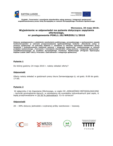 Projekt „Tworzenie i rozwijanie standardów usług pomocy i integracji społecznej” współfinansowany przez Unię Europejską w ramach Europejskiego Funduszu Społecznego Warszawa, 20 maja 2010r. Wyjaśnienie w odpowiedzi na pytanie dotyczące zapytania ofertowego, nr postępowania POKL1.18/WRZOS/1/2010 Dotyczy postępowania o udzielenie zamówienia publicznego, prowadzonego z zachowaniem zasady konkurencyjności w zakresie przeprowadzenia ogólnopolskiego badania „Standardy usług w pomocy społecznej” na potrzeby Zadania 2 „Działania w zakresie wdrażania standardów pracy socjalnej i funkcjonowania instytucji pomocy i integracji społecznej” realizowanego w ramach projektu systemowego „Tworzenie i rozwijanie standardów usług pomocy i integracji społecznej”, współfinansowanego ze środków Europejskiego Funduszu Społecznego (Program Operacyjny Kapitał Ludzki 2007-2013, Priorytet I Zatrudnienie i integracja społeczna) Pytanie 1 Do której godziny 24 maja 2010 r. należy składać oferty? Odpowiedź Oferty należy składać w godzinach pracy biura Zamawiającego tj. od godz. 8:00 do godz. 17:00. Pytanie 2 W załączniku 2 do Zapytania Ofertowego, w części III „WSKAZÓWKI METODOLOGICZNE – techniki gromadzenia danych, w odniesieniu do wywiadów indywidualnych jest zapis, iż będą przeprowadzane w 20-30 % jednostkach. Co to oznacza? Odpowiedź 20 – 30% dotyczy jednostek z wybranej próby warstwowo – losowej. Stowarzyszenie Samorządowych Ośrodków Pomocy Społecznej FORUM