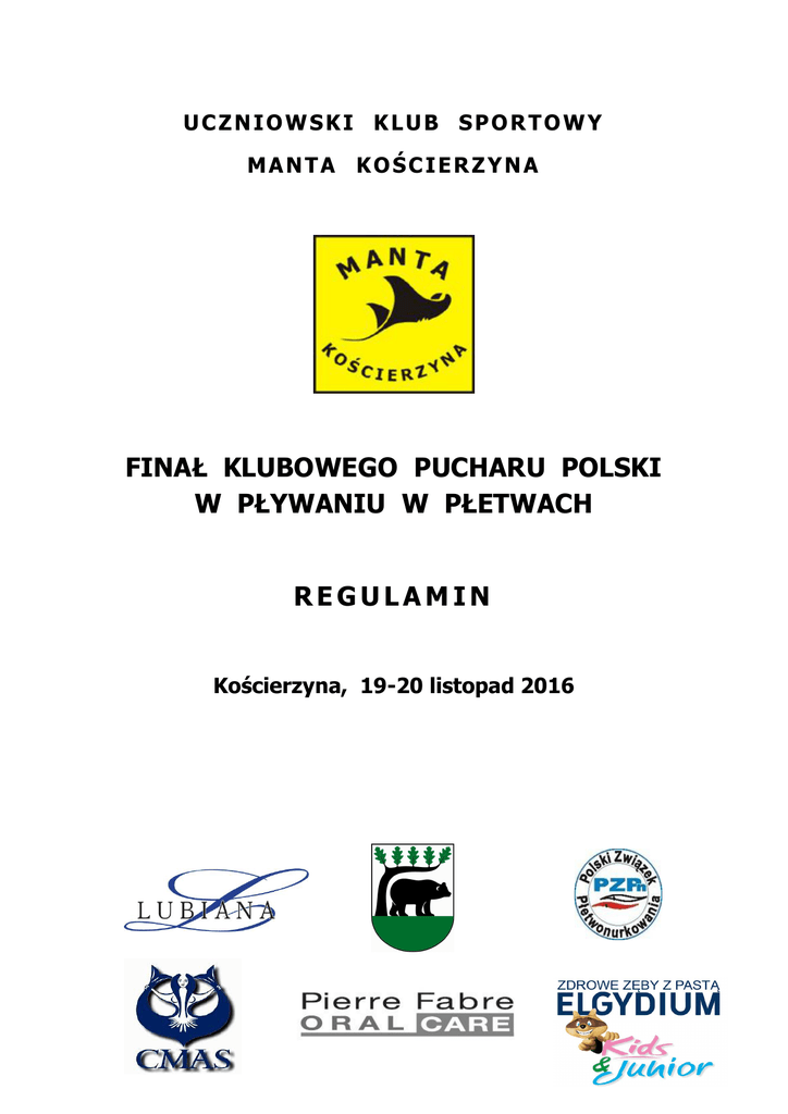 UCZNIOWSKI KLUB SPORTOWY MANTA KOŚCIERZYNA FINAŁ KLUBOWEGO PUCHARU POLSKI W PŁYWANIU W PŁETWACH REGULAMIN Kościerzyna, 19-20 listopad 2016 1. CEL ZAWODÓW: Wyłonienie najlepszego klubu w Polsce Wyłonienie najlepszego zawodnika i zawodniczki w poszczególnych kategoriach wiekowych Propagowanie zdrowego trybu życia, aktywności ruchowej dzieci i młodzieży Propagowanie pływania w płetwach Promocja Kaszub i miasta Kościerzyna 2. TERMIN I MIEJSCE ZAWODÓW: Pływalnia Aqua Centrum w Kościerzynie, ul. Hallera 2 19-20 listopad 2016 r. 3. ORGANIZATOR UKS MANTA KOŚCIERZYNA Waldemar Wanta – Prezes Klubu, Kierownik Zawodów tel: 697-676-626 Karolina Kolińska – członek Zarządu tel: 692-141-285 Beata Zembrzycka-Greń – członek Zarządu tel: 600-989-665 e-mail: [email protected] 4. ORGANIZATOR ZAPEWNIA: Pomiar czasu elektroniczny i ręczny Opiekę ratownika medycznego w trakcie trwania zawodów Komisję sędziowską 5. WARUNKI TECHNICZNE Pływalnia 25m x 16m 6 torów, szerokość 2,5m Głębokość 1,5m – 1,8 m Temperatura wody: 28ºC (± 1ºC) 6. ZAWODY WSPIERAJĄ: Burmistrz Miasta Kościerzyna Zakłady Porcelany Stołowej „Lubiana” S.A. w Łubianie Pierre Fabre ORAL CARE 7. UCZESTNICTWO W zawodach wziąć mogą udział zawodnicy, posiadający licencję PZP-n oraz aktualne badania lekarskie (nie starsze niż 6-miesięcy) do wglądu na odprawie kierowników drużyn przed rozgrzewką. KAT. E –rocznik 2005 i młodsi; KAT. D –rocznik 2003 i 2004; KAT. C –rocznik 2001 i 2002; KAT. B –rocznik 1999 i 2000; KAT. A –rocznik 1998 i starsi; Każdy zawodnik ma prawo startu w trzech konkurencjach indywidualnych i dwóch sztafetach. Zawody rozegrane zostaną w dwóch blokach startowych po jednym na dzień trwania zawodów. Zawody zostaną przeprowadzone wg regulaminu Klubowego Pucharu Polski na rok 2016. 8. ZGŁOSZENIA. Zgłoszenia prosimy przesyłać na adres [email protected] do dnia 12.11.2016 r. Ostatnie poprawki przyjmowane będą do dnia 14.11.2016 r., po tym terminie poprawek nie przyjmujemy. Zgłoszenia przyjmowane będą w formacie .lxf z programu Splash Team Manager. Listy startowe przesłane zostaną drogą elektroniczną z adresu: [email protected] 9. OPŁATY. 50 zł /zawodnik – opłata startowa Wpłat prosimy dokonywać wyłącznie na konto klubowe do dnia 14.11.2016 r. BGŻ S.A. O/Kościerzyna Nr: 73 2030 0045 1110 0000 0257 6760 W tytule prosimy podać: nazwę klubu oraz ilość zawodników. Wpłaty indywidualne od zawodników poszczególnych klubów nie będą akceptowane. 100 zł / klub: płatne na konto PZP-n: BZ WBK SA 21 1090 1102 0000 0001 0316 8343 Warunkiem dopuszczenia do startów jest uiszczenie opłaty startowej oraz opłaty klubowej. W przypadku nie dopełnienia tych formalności klub nie zostanie dopuszczony do startów w Rundzie Finałowej KPP. 10. NAGRODY Medale i dyplomy dla 3 najlepszych zawodników/zawodniczek w każdej konkurencji zawodów Puchary dla 3 najlepszych klubów Finałowej Rundy KPP 2016 Puchar dla najlepszego zawodnika i zawodniczki każdej kategorii wiekowej w klasyfikacji Finałowej Rundy KPP Puchary dla 3 najlepszych klubów w generalnej klasyfikacji KPP 2016 Statuetki i nagrody dla 3 najlepszych zawodników i zawodniczek każdej kategorii w generalnej klasyfikacji KPP 2016 Pamiątkowy upominek dla każdego zawodnika biorącego udział w zawodach 11. PROTESTY Protesty można składać do 30 minut po ogłoszeniu wyników na tablicy. Kaucja za protest wynosi 200,00 PLN. Zwrot kaucji w przypadku uznania protestu, natomiast w przypadku nie uznania protestu kaucja przechodzi na rzecz organizatora 12. POSTANOWIENIA KOŃCOWE Organizator nie bierze odpowiedzialności za straty spowodowane przez zawodników zarówno w miejscu zakwaterowania jak i na pływalni. Sprawy nie objęte powyższym regulaminem zostaną omówione na odprawie technicznej w dniu zawodów. Ostateczna interpretacja regulaminu należy do organizatora. Organizator nie zapewnia noclegu, ani wyżywienia dla zawodników. RAMOWY PROGRAM ZAWODÓW Sobota 19.11.2016 r. 12:30 - 13:00 13:00 - 13:30 13:30- 14:00 odprawa techniczna kierowników drużyn rozgrzewka I grupy klubów rozgrzewka II grupy klubów 14:10 Ceremonia Otwarcia Zawodów 14:15 - 19:00 I blok konkurencji (w każdym bloku rozpoczynają dziewczynki od najmłodszej kategorii do najstarszej); 25 m AP / kat. E, D / - dziewczęta i chłopcy, 50 m AP / kat. C, B, A / - dziewczęta i chłopcy, 50 m BF / kat. E, D, C, B, A / - dziewczęta i chłopcy, 800 m SF / kat. D, C, B, A / - dziewczęta i chłopcy, 200 m SF / kat. E, D, C, B, A / - dziewczęta i chłopcy, 100 m BF / kat. E, D, C, B, A / - dziewczęta i chłopcy, 100 m IM / kat. D, C, B, A / - dziewczęta i chłopcy, sztafeta 4 x 50 m pp / kat. JUNIOR / dziewczęta i chłopcy, sztafeta 4 x 100 m pp /kat. OPEN / dziewczęta i chłopcy, Dekoracje zwycięzców w przerwach między konkurencjami. Niedziela 20.11.2016 r. 8:00 - 8:30 rozgrzewka II grupy klubów; 8:30 - 9:00 rozgrzewka I grupy klubów; 9:15 - 14:30 II blok konkurencji; 50 m SF / kat. E, D, C, B, A / - dziewczęta i chłopcy, 400 m SF / kat. E, D, C, B, A / - dziewczęta i chłopcy, 200 m BF / kat. E, D, C, B, A / - dziewczęta i chłopcy, 100 m SF / kat. E, D, C, B, A / - dziewczęta i chłopcy, sztafeta 4 x 50 m BF / kat. JUNIOR sztafeta 4 x 100 m BF / kat. OPEN ok. 15:00 Ogłoszenie klasyfikacji finałowej Serdecznie zapraszamy!