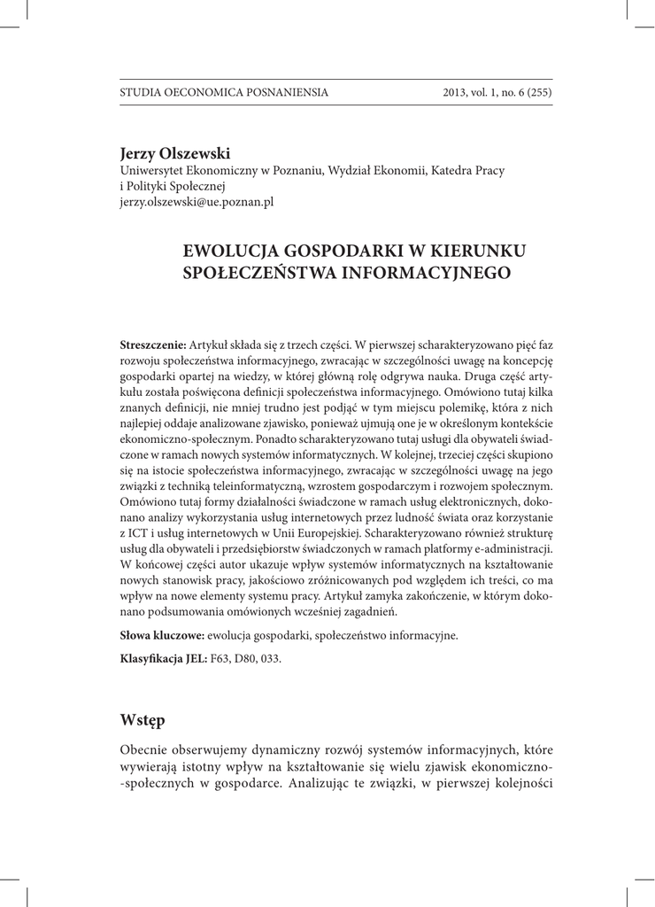 STUDIA OECONOMICA POSNANIENSIA 2013, vol. 1, no. 6 (255) Jerzy Olszewski Uniwersytet Ekonomiczny w Poznaniu, Wydział Ekonomii, Katedra Pracy i Polityki Społecznej [email protected] Ewolucja gospodarki w kierunku społeczeństwa informacyjnego Streszczenie: Artykuł składa się z trzech części. W pierwszej scharakteryzowano pięć faz rozwoju społeczeństwa informacyjnego, zwracając w szczególności uwagę na koncepcję gospodarki opartej na wiedzy, w której główną rolę odgrywa nauka. Druga część artykułu została poświęcona definicji społeczeństwa informacyjnego. Omówiono tutaj kilka znanych definicji, nie mniej trudno jest podjąć w tym miejscu polemikę, która z nich najlepiej oddaje analizowane zjawisko, ponieważ ujmują one je w określonym kontekście ekonomiczno-społecznym. Ponadto scharakteryzowano tutaj usługi dla obywateli świadczone w ramach nowych systemów informatycznych. W kolejnej, trzeciej części skupiono się na istocie społeczeństwa informacyjnego, zwracając w szczególności uwagę na jego związki z techniką teleinformatyczną, wzrostem gospodarczym i rozwojem społecznym. Omówiono tutaj formy działalności świadczone w ramach usług elektronicznych, dokonano analizy wykorzystania usług internetowych przez ludność świata oraz korzystanie z ICT i usług internetowych w Unii Europejskiej. Scharakteryzowano również strukturę usług dla obywateli i przedsiębiorstw świadczonych w ramach platformy e-administracji. W końcowej części autor ukazuje wpływ systemów informatycznych na kształtowanie nowych stanowisk pracy, jakościowo zróżnicowanych pod względem ich treści, co ma wpływ na nowe elementy systemu pracy. Artykuł zamyka zakończenie, w którym dokonano podsumowania omówionych wcześniej zagadnień. Słowa kluczowe: ewolucja gospodarki, społeczeństwo informacyjne. Klasyfikacja JEL: F63, D80, 033. Wstęp Obecnie obserwujemy dynamiczny rozwój systemów informacyjnych, które wywierają istotny wpływ na kształtowanie się wielu zjawisk ekonomiczno-społecznych w gospodarce. Analizując te związki, w pierwszej kolejności 70 Jerzy Olszewski scharakteryzowano pięć faz rozwoju społeczeństwa informacyjnego, zwracając w szczególności uwagę na koncepcję gospodarki opartej na wiedzy, w której główną rolę odgrywa nauka. W celu zrozumienia zjawisk zachodzących we współczesnej gospodarce podjęto próbę zdefiniowania społeczeństwa informacyjnego, w ramach którego coraz większego znaczenie nabierają usługi elektroniczne świadczone dla obywateli w ramach rozwijających się systemów informatycznych. Dokonano analizy wykorzystania usług internetowych przez ludność świata oraz w Unii Europejskiej. Na szczególną uwagę zasługują zmiany w strukturze świadczonych usług w ramach platformy e–administracji dla obywateli i przedsiębiorstw, jak również analiza wpływu systemów informatycznych na kształtowanie się nowych stanowisk pracy, jakościowo zróżnicowanych pod względem ich treści. 1. Fazy rozwoju społeczeństwa informacyjnego Szczególne natężenie zmian, przede wszystkim o charakterze techniczno-techno logicznym, miało miejsce w XX wieku i na początku naszego tysiąclecia. W tym okresie jesteśmy świadkami rozwoju technologii informacyjnych, między innymi technologii umożliwiających globalizację rynków, takich jak: –– rynki kapitałowe i finansowe, –– systemy bankowe, –– rynki wiedzy, –– e-biznesu, –– wszelkiego rodzaju usługi (komunikacyjne, transportowe, turystyczne). Przemiany te spowodowały narodzenie się „cywilizacji informacyjnej”. Termin ten został po raz pierwszy użyty w 1963 roku przez japońskiego socjologa Tadao Umesama i jego oryginalna, japońska nazwa to „joko shaka” [Goban-Klas 1999, s. 286]. Po II wojnie światowej próbowano znaleźć termin adekwatnie określający proces transformacji społeczeństw II połowy XX wieku. Wysiłki te obrazuje tabela 1 zawierająca zestawienie nazw nadawanych zmianom cywilizacyjnym w okresie 1950–1999. Okres ten można podzielić na pięć etapów rozwoju. Pierwszy (lata 1950–1961) obejmuje takie zjawiska, jak rewolucja organizacyjna, edukacyjna i w konsekwencji wykształcenie się społeczeństwa przemysłowego. Drugi etap transformacji społeczeństwa obejmuje lata 1962–1973, kiedy wybucha rewolucja komputerowa, rodzi się człowiek wiedzy, nowa klasa pracująca i nowe społeczeństwo usług. Trzeci etap transformacji obejmuje lata 1974–1979, kiedy ma miejsce trzecia rewolucja przemysłowa i elektroniczna, i zaczyna dominować ekonomia informacji. Czwarty etap transformacji społeczeństwa to lata 1980–1993, ma on swoje początki w rewolucji mikroelektronicznej, następują rewolucyjne zmiany Ewolucja gospodarki w kierunku społeczeństwa informacyjnego 71 w środkach komunikowania. Ostatni, piąty etap transformacji społeczeństwa obejmuje lata 1993–2008, kiedy rodzi się „społeczeństwo sieciowe”. Obecnie jest realizowana koncepcja gospodarki oparta na wiedzy (GOW), w której główną rolę odgrywa nauka, a przede wszystkim technologia informacyjna i telekomunikacyjna, zmiany strukturalne oraz szybkie upowszechnianie się rezultatów naukowych w całej gospodarce [Wyrwicka 2011]. 2. Definicja społeczeństwa informacyjnego W ubiegłym stuleciu uznano, iż technologie informacyjno-telekomunikacyjne (ICT – information and communication technologies) wywierają i będą wywierać duży wpływ na rozwój ekonomiczno-społeczny. Analizy i spostrzeżenia poczynione w krajach wysoko rozwiniętych potwierdzają wcześniej postawioną tezę, iż informatyzacja wkroczyła do wszystkich dziedzin życia. Należy stwierdzić, iż w mniejszym stopniu te procesy odnoszą się do krajów średnio i słabo rozwiniętych [Arendt, Kryńska i Kukulak-Dolata 2011]. Na naszym kontynencie terminem „społeczeństwo informacyjne” zaczęto posługiwać się od 1978 roku (trzeci eta