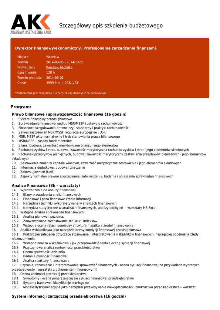 Szczegółowy opis szkolenia budżetowego Dyrektor finansowy/ekonomiczny. Profesjonalne zarządzanie finansami. Miejsce Wrocław Termin 2014-09-06 - 2014-12-21 Prowadzący Kowalski Michał J. Czas trwania 128 h Termin płatności 2014-09-01 Cena* 3999 PLN + 23% VAT *Podana cena jest ceną netto. Do ceny należy doliczyć 23% podatku VAT Program: Prawo bilansowe i sprawozdawczość finansowa (16 godzin) 1. System finansowy przedsiębiorstwa 2. Sprawozdanie finansowe według MSR/MSSF i ustawy o rachunkowości 3. Finansowe uregulowania prawne czyli standardy i praktyki rachunkowości 4. Zakres zastosowań MSR/MSSF regulacje europejskie i UoR 5. MSR, MSSF akty normatywne i tryb stanowienia prawa bilansowego 6. MSR/MSSF – zasady fundamentalne 7. Bilans, budowa, zawartość merytoryczna bilansu i jego elementów 8. Rachunek zysków i strat, budowa, zawartość merytoryczna rachunku zysków i strat i jego elementów składowych 9. Rachunek przepływów pieniężnych, budowa, zawartość merytoryczna zestawienia przepływów pieniężnych i jego elementów składowych 10. Zestawienie zmian w kapitale własnym, zawartość merytoryczna zestawienia i jego elementów składowych 11. Informacja dodatkowa, budowa i znaczenie 12. Zakres ujawnień (UoR) 13. Aspekty formalno prawne sporządzania, zatwierdzania, badania i ogłaszania sprawozdań finansowych Analiza Finansowa (8h – warsztaty) 14. Wprowadzenie do analizy finansowej 14.1. Etapy prowadzenia analiz finansowych 14.2. Finansowe i poza finansowe źródła informacji 14.3. Narzędzia i techniki wykorzystywane w analizach finansowych 14.4. Narzędzia statystyczne w analizach finansowych, analizy odchyleń – warsztaty MS Excel 15. Wstępna analiza sprawozdań finansowych 15.1. Analiza pionowa i pozioma, 15.2. Zaawansowane zastosowania struktur i indeksów 15.3. Wstępna ocena relacji pomiędzy strukturą majątku a źródeł finansowania 16. Analiza wskaźnikowa jako narzędzie oceny kondycji finansowej przedsiębiorstwa 16.1. Praktyczne zalecenia dotyczące stosowania i interpretowania wskaźników finansowych, najczęściej popełniane błędy i niezrozumienia 16.2. Wstępna analiza wskaźnikowa – jak przeprowadzić szybką ocenę sytuacji finansowej 16.3. Przyczynowa analiza rentowności przedsiębiorstwa 16.4. Ocena sprawności działania 16.5. Badanie płynności finansowej 16.6. Analiza struktury finansowania 17. Czytanie, rozumienie i interpretowanie sprawozdań finansowych - ocena sytuacji finansowej na przykładach wybranych przedsiębiorstw (warsztaty z dokumentami finansowymi) 18. Ocena zdolności płatniczej przedsiębiorstwa 18.1. Symptomy i ocena pogarszającej się sytuacji finansowej przedsiębiorstwa 18.2. Systemy bankowe i klasyfikacje scoringowe 18.3. Modele dyskryminacyjne jako narzędzia przewidywania niewypłacalności i bankructwa przedsiębiorstwa – warsztat System informacji zarządczej przedsiębiorstwa (16 godzin) 1. Wdrażanie systemu informacji zarządczej i controllingu w przedsiębiorstwie a. Rachunkowość zarządcza i controlling – funkcje, cele, korzyści i bariery wdrażania b. Strategiczne a operacyjne zadania w obszarze generowania informacji zarządczej c. System finansowej informacji zarządczej w przedsiębiorstwie d. Przykłady controllingowych raportów od poziomu naczelnego kierownictwa do operacyjnego e. Organizacja funkcji controlingowych w przedsiębiorstwie (decentralizacji zarządzania, pozycja controllingu w strukturze organizacyjnej, zakres zadań i kompetencji, procedury wdrażania) f. Zarządcze układy prezentowania wyników g. Zasady wyodrębnianie ośrodków odpowiedzialności i pomiaru ich efektywności 2. Rozwiązania informatyczne wykorzystywane przy ewidencjonowaniu wyników ośrodków odpowiedzialności – przegląd systemów informatycznych wspierających controlling i informację zarządczą 3. Budżetowanie jako narzędzie wpierające zarządzanie efektywnością a. Budżetowanie jako metoda zarządzania (fazy tworzenia budżetu, realizacji i kontroli, etapy opracowywania budżetu, budżet a plan finansowy) b. Przykłady dokumentów budżetowych i planów finansowych c. Zasady i rodzaje budżetowania (cykl budżetowania, budżetowanie odgórne i oddolne, przyrostowe, od zera, budżety sporządzane centralnie a budżetowanie ośrodków odpowiedzialności d. Problemy i nieefektywność tradycyjnych systemów budżetowania (przyczyny kryzysu budżetowania, wady i zagrożenia budżetowania) e. Rola i miejsce Komisji Budżetowej w controllingu f. Narzędzia budżetowania – analiza najlepszych praktyk 4. Tradycyjne narzędzia zarządzania kosztami a. Pojęcie i klasyfikacja kosztów formalny zakres informacyjny o kosztach b. Zarządcze układy ewidencjonowania kosztów (koszty stałe i zmienne, pośrednie i bezpośrednie, kontrolowane i niekontrolowane) c. Kalkulacje kosztu jednostkowego (marża brutto, nośniki kosztów i klucze rozliczeniowe, kalkulacja podziałowa prosta i ze współczynnikami, kalkulacje doliczeniowa, fazowa i odjemna) d. Rachunek kosztów zmiennych (próg rentowności, ryzyko operacyjne i wskaźnik bezpieczeństwa, mechanizm dźwigni operacyjnej) Procesowe zarządzanie kosztami i efektywnością (8 godzin) 1. a. b. c. d. 2. 3. 4. Rachunek kosztów działań (ABC) – wprowadzenie Koszty i zasady ich rozliczania Idea procesowej kalkulacji kosztów - składniki, mechanizm rozliczania Activity Based Management – zastosowania strategiczne i operacyjne Podmiotowe i przedmiotowe zastosowanie ABC/ABM (kiedy podjąć decyzje o wdrożeniu ABC/ABM, po co wdrażać ABC/ABM) Etapy wdrażania rachunku kosztów działań – procedury implementacyjne Rachunek kosztów działań oparty na czasie (Time Driven Activity Based Costing) Zaawansowane zastosowania rachunku kosztów działań (integracja koncepcji ABC i VBM, Activty Based Budgeting) Ocena efektywności przedsięwzięć biznesowych (16 godzin) 1. Pojęcie i rodzaje inwestycji a. Modele realizacji inwestycji - p