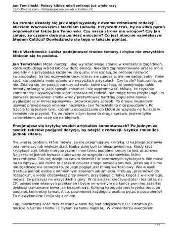 Jan Temciński: Polscy kibice mieli zniknąć już wiele razy CelticPoland.com - Polskojęzyczny serwis o Celticu FC Na stronie ukazały się jak dotąd wywiady z dwoma członkami redakcji Mickiem Wachowskim i Maćkiem Habudą. Przyszedł czas, by na kilka pytań odpowiedział także Jan Temciński. Czy nasza strona ma wrogów? Czy Jan żałuje, że czasem daje się ponieść emocjom? Co jest obecnie największym błędem Celticu? Dowiedziecie się tego w tekście poniżej. Mick Wachowski: Lubisz podejmować trudne tematy i chyba nie wszystkim kibicom się to podoba. Jan Temciński: Może inaczej: lubię wyrażać swoje zdanie w kontekście zagadnień, które wzbudzają wśród kibiców dużo emocji. Niektóre zaprezentowane przeze mnie poglądy nie przypadają każdemu do gustu. Inni uznają, że próbuję narzucić światopogląd. Są też oczywiście tacy, którzy się zgadzają, ale nie sądzę, żeby istniał ktoś, kto podziela moje zdanie we wszystkich artykułach. Czy to źle? Naturalnie, że nie. Zdarza się, że padają zarzuty od osób, które uważają, że podejmując takie tematy próbuję w jakiś sposób zaistnieć i się wypromować. Mówią, że czytanie komentarzy i wywoływanie kłótni sprawia mi radość. Nie mogę temu przytaknąć. Po pierwsze powinienem chyba wtedy prezentować bardziej popularne opinie i wygłaszać je w mniej agresywny i prowokacyjny sposób. Po drugie musiałbym używać prawdziwego imienia i nazwiska - Jan Temciński to mój pseudonim. Po trzecie to ja jestem tym, któremu dopuszczanie do kłótni ze względu na funkcje w serwisie nie przystoi. To, że różnie z tym bywa to druga sprawa. Jestem tylko człowiekiem, ale uczę się na błędach. Przejmujesz się krytyką swoich artykułów komentarzach? Po jednym ze swoich tekstów podjąłeś decyzję, by odejść z redakcji. Szybko zmieniłeś jednak zdanie. Nie wierzę osobom, które mówią, że nie przejmują się krytyką. U każdego zostawia ona mniejszy lub większy ślad. Najbardziej boli ta niesprawiedliwa. Kiedy ktoś krytykuje styl, błędy merytoryczne i inne temu podobne rzeczy to jest to zdrowe. Najczęściej jednak bywasz atakowany ze względu na stanowisko, które prezentujesz. Tak się dzieje na całym świecie i w przeróżnych sytuacjach. Nie masz na to wpływu, ale mimo to czasem czujesz z tego powodu smutek. Jeżeli się z kimś nie zgadzasz nie oznacza to, że jego pogląd jest mniej wartościowy. Wiele osób traktuje jednak osobę z odmiennym zdaniem jak śmiecia. Próbują „przemówić do rozsądku”, a kiedy obstawiasz przy swoim, przylepiają ci łatkę kogoś z wielkim ego, mówią, że patrzysz na wszystkich z góry. W dzisiejszej rzeczywistości i też tutaj, na CP, posiadanie własnych przekonań i bycie im wiernym do końca pomimo zażartej dyskusji traktowane bywa jak bezczelność. Kolejną kategorią jest krytyka tego, że podjąłeś konkretny temat. A co, powinieneś każdego z osobna pytać o pozwolenie? To niewykonalne i mija się z celem. Tak, niezliczoną ilość razy zastanawiałem się nad odejściem z CP. Ostatnio po tekście o Saltire Thistle FC byłem ku temu najbliżej. W komentarzu wieczorem 1/4 Jan Temciński: Polscy kibice mieli zniknąć już wiele razy CelticPoland.com - Polskojęzyczny serwis o Celticu FC daliśmy informację, że nie jestem już w redakcji. Wtedy pojawiła się odpowiedź jednego z użytkowników. Jak łatwo się domyślić nie była ona zbyt wartościowa. Ktoś sobie z tego po prostu zakpił. Postawiło mnie to do pionu i zmieniłem decyzję. „Naprawdę mam się przejmować takimi ludźmi?” - pomyślałem. Miałem rację. Nie było warto. Ten ktoś później kpił ze zmiany decyzji i po ośmiu (!) czysto złośliwych komentarzach (i moich ostrzeżeniach) pod rząd dostał ode mnie bana. Co więcej, potem przez pewien czas się rejestrował na nowe konta i próbował wszystkim to ogłosić. To, że Jan Temciński zrezygnował i zmienił zdanie. Komentarze były kasowane, bo zbanowany użytkownik nie ma prawa ich dodawać z nowego profilu. On jednak myślał, że robimy to by ukryć moją rezygnację. Po to założył cztery zupełnie nowe maile. Aktualnie mnie to śmieszy i żeby oszczędzić jemu pracy, i innym jemu podobnym, mogę ogłosić z dumą: tak, zrezygnowałem i wróciłem. To żadna tajemnica. Teraz możesz (możecie) znaleźć sobie kolejny cel w życiu. Żałujesz, że pod paroma tekstami wdałeś się w niepotrzebną dyskusję? Bronienie swoich racji to jednak nic złego. Kiedy poniosą człowieka emocje to należy tego żałować. Dyskutowanie ze świadomością, że nic dobrego ona nie przyniesie nie jest zbyt korzystne i należy wtedy się zastanowić nad jej słusznością. Ja jednak wpadam w te pułapki i zaczynam prowadzić batalie pod artykułami. Zapominam, że z początku konstruktywna rozmowa na gorące tematy prawie zawsze przeradza się w wojnę. Bronienie swoich racji to nic złego, ale trzeba też umieć robić to z klasą. W późniejszym etapie za dużo działamy na emocjach i nie zawsze wygląda to tak jak powinno. Wiele zależy także od osoby, z którą prowadzisz konwersację. Zdarza się, że bywa ona źle nastawiona od samego początku i nie przyjmuje do wiadomości twoich praw. W takim przypadku katastrofa jest nieuchronna i jedynie milczenie może coś zdziałać. Niestety rzadko powstrzymuje się od odpowiedzi. Teraz wiem, że to błąd. Powiedziałeś kiedyś, że CelticPoland.com bardziej nie lubią niektórzy fani Celticu, niż Rangers. Mógłbyś rozwinąć ten temat? Zazwyczaj nie lubią nas osoby, które dostały bana i te, których nie nauczono minimum kultury. Wiem, że to odważne stwierdzenie, ale nie boję się głosić takich tez. Wszystko zaczęło się od pewnego artykułu, nie pamiętam dokładnie jakiego, lecz poruszał on kwestie polityczne. Rozpętało się pod nim prawdziwe piekło. Kibice nazywali siebie faszystami i komuchami, w powietrzu fruwały obelgi… 