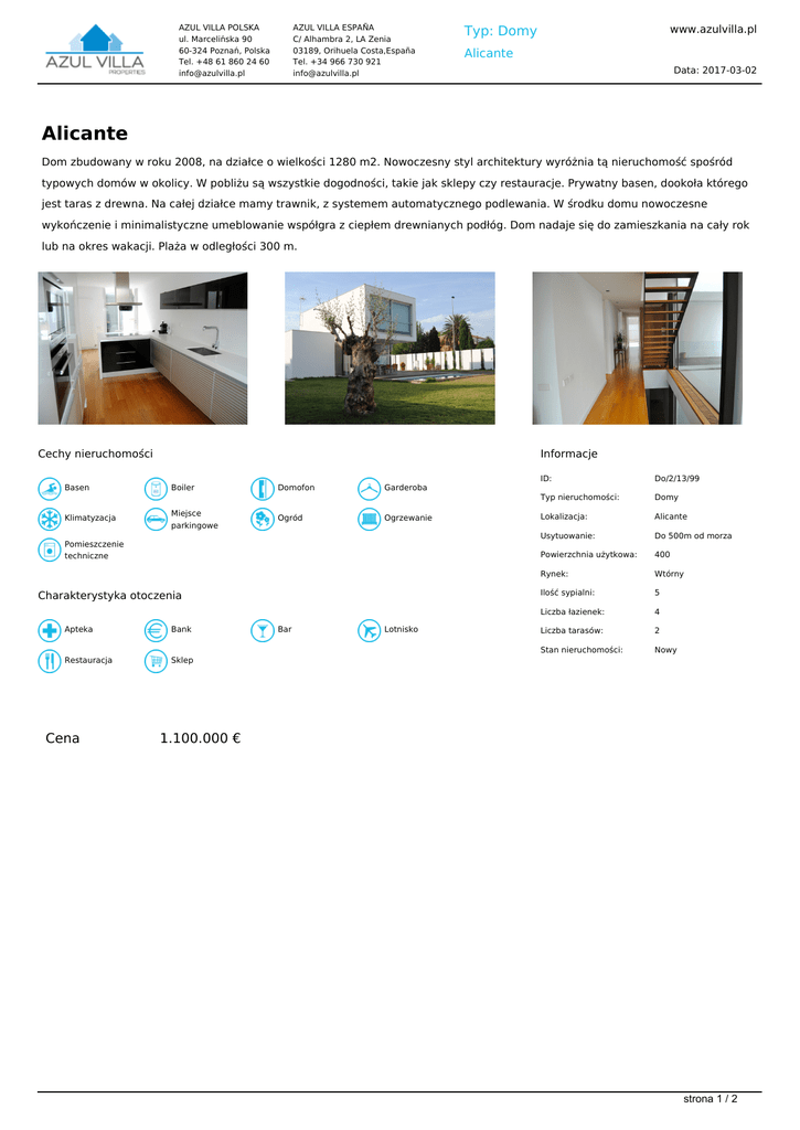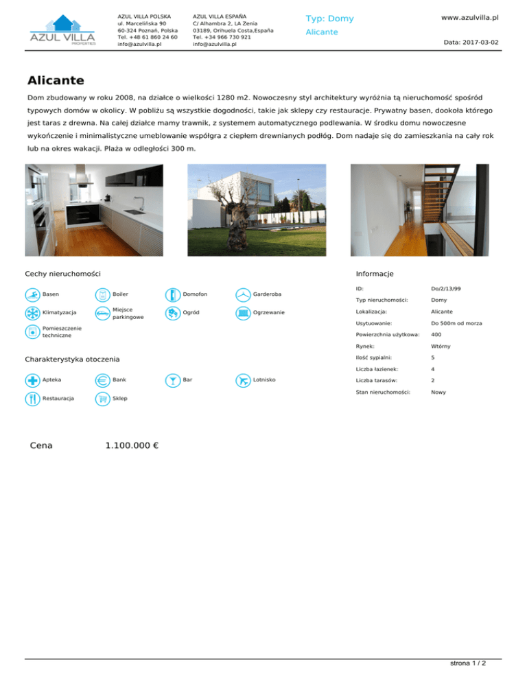 AZUL VILLA POLSKA ul. Marcelińska 90 60-324 Poznań, Polska Tel. +48 61 860 24 60 [email protected] AZUL VILLA ESPAÑA C/ Alhambra 2, LA Zenia 03189, Orihuela Costa,España Tel. +34 966 730 921 [email protected] www.azulvilla.pl Typ: Domy Alicante Data: 2017-03-02 Alicante Dom zbudowany w roku 2008, na działce o wielkości 1280 m2. Nowoczesny styl architektury wyróżnia tą nieruchomość spośród typowych domów w okolicy. W pobliżu są wszystkie dogodności, takie jak sklepy czy restauracje. Prywatny basen, dookoła którego jest taras z drewna. Na całej działce mamy trawnik, z systemem automatycznego podlewania. W środku domu nowoczesne wykończenie i minimalistyczne umeblowanie współgra z ciepłem drewnianych podłóg. Dom nadaje się do zamieszkania na cały rok lub na okres wakacji. Plaża w odległości 300 m. Cechy nieruchomości Informacje Basen Boiler Klimatyzacja Miejsce parkingowe Domofon Ogród Garderoba Ogrzewanie Pomieszczenie techniczne Charakterystyka otoczenia Apteka Restauracja Cena Bank Bar Lotnisko ID: Do/2/13/99 Typ nieruchomości: Domy Lokalizacja: Alicante Usytuowanie: Do 500m od morza Powierzchnia użytkowa: 400 Rynek: Wtórny Ilość sypialni: 5 Liczba łazienek: 4 Liczba tarasów: 2 Stan nieruchomości: Nowy Sklep 1.100.000 € strona 1 / 2 AZUL VILLA POLSKA ul. Marcelińska 90 60-324 Poznań, Polska Tel. +48 61 860 24 60 [email protected] AZUL VILLA ESPAÑA C/ Alhambra 2, LA Zenia 03189, Orihuela Costa,España Tel. +34 966 730 921 [email protected] Typ: Domy www.azulvilla.pl Alicante Data: 2017-03-02 strona 2 / 2