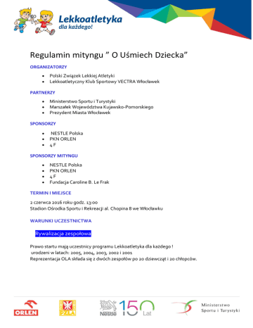 ILO Regulamin mityngu ” O Uśmiech Dziecka” ORGANIZATORZY Polski Związek Lekkiej Atletyki Lekkoatletyczny Klub Sportowy VECTRA Włocławek PARTNERZY Ministerstwo Sportu i Turystyki Marszałek Województwa Kujawsko-Pomorskiego Prezydent Miasta Włocławek SPONSORZY NESTLE Polska PKN ORLEN 4F SPONSORZY MITYNGU NESTLE Polska PKN ORLEN 4F Fundacja Caroline B. Le Frak TERMIN I MIEJSCE 2 czerwca 2016 roku godz. 13:00 Stadion Ośrodka Sportu i Rekreacji al. Chopina 8 we Włocławku WARUNKI UCZESTNICTWA Rywalizacja zespołowa Prawo startu mają uczestnicy programu Lekkoatletyka dla każdego ! urodzeni w latach: 2005, 2004, 2003, 2002 i 2001 Reprezentacja OLA składa się z dwóch zespołów po 20 dziewcząt i 20 chłopców. ILO KONKURENCJE Oddzielnie dziewczęta i chłopcy: 100m 600m wyścig australijski 1000m wyścig australijski skok w dal ze strefy dla dzieci z klas IV-V skok w dal dla dzieci z klas VI SP i I-II G rzut piłeczką palantową PUNKTACJA ZESPOŁOWA Punktuje pierwszych osiem zawodniczek / zawodników w każdej konkurencji wg klucza: 1m – 8 pkt, 2m-7 pkt, 3m -6 pkt, 4m – 5pkt, 5m – 4 pkt, 6m-3 pkt, 7m – 2 pkt, 8m – 1 pkt. W biegu na 100m wlicza się sumę czasów dzieci z każdego rocznika. ZASADY ROZGRYWANIA KONKURENCJI 100m – rozgrywane w seriach na czas Do punktacji zespołu wlicza się sumę czasów zawodników każdego rocznika z zespołu Skok w dal [ dzieci klas IV i V skok ze strefy 1m] Cztery próby, z których do punktacji liczy się suma dwóch najlepszych skoków Piłka palantowa Zawodnicy mają prawo do czterech prób, z których suma dwóch najlepszych jest brana do punktacji Wyścig australijski na dystansie 600m Ostatni zawodnik na 200m i 400m odpada z rywalizacji Wyścig australijski na 1000m Ostatni zawodnik na 400m i 800m odpada z rywalizacji ZESPOŁY Lp. 1 2 3 4 5 6 7 8 9 10 OLA Bydgoszcz Bydgoszcz Grudziądz Łódź Olsztyn Piła Płock Toruń Warszawa Włocławek Miasto BYDGOSZCZ KRUSZWICA [+ Inowrocław] GRUDZIĄDZ ŁÓDŹ OLSZTYN PIŁA PŁOCK TORUŃ PŁOŃSK WŁOCŁAWEK ILO Konkurencja Kl. IV Kl. V Kl. VI Kl. I G Kl. II G Razem 20 30 50 50 10 10 10 10 10 200 20 20 40 w dal ze strefy w dal piłka palantowa 100m 600m australijski IV 600m australijski V 1000m australijski VI 1000m australijski I G 1000m australijski IIG 1 0 1 1 1 0 0 0 0 1 0 1 1 0 1 0 0 0 0 1 1 1 0 0 1 0 0 0 1 1 1 0 0 0 1 0 0 1 1 1 0 0 0 0 1 Zespół dziewcząt Zespół chłopców Reprezentacja OLA 4 4 8 4 4 8 4 4 8 4 4 8 4 4 8 ILOŚCI DZIECI w KONKRENCJACH Rywalizacja indywidualna KONKURENCJE Oddzielnie dziewczęta i chłopcy: 100m – rozgrywane w seriach na czas 300m – rozgrywane w seriach na czas 600m – rozgrywane w seriach na czas 1000m – rozgrywane w seriach na czas Skok wzwyż WARUNKI UCZESTNICTWA Zawody w formule otwartej dla dzieci roczników: 2005, 2004, 2003, 2002, zgłoszonych przez OLA , szkoły lub kluby sportowe. Dziecko ma prawo startu w jednej konkurencji NAGRODY medale dla wszystkich uczestników dyplomy dla wszystkich uczestników puchary dla zespołów za miejsca 1-8 oddzielnie dla dziewcząt i chłopców ZGŁOSZENIA Poprzez system Domtel w terminie do dnia 25.05.2016r. do godz. 21.00 ILO KATEGORIE WIEKOWE Dziewczęta 11 lat Chłopcy 11 lat Dziewczęta 12 lat Chłopcy 12 lat Dziewczęta 13 lat Chłopcy 13 lat Dziewczęta 14 lat Chłopcy 14 lat Dziewczęta 15 lat Chłopcy 15 lat Klasa IV SP Klasa IV SP Klasa V SP Klasa V SP Klasa VI SP Klasa VI SP Klasa I G Klasa I G Klasa II G Klasa II G Rocznik 2005 Rocznik 2005 Rocznik 2004 Rocznik 2004 Rocznik 2003 Rocznik 2003 Rocznik 2002 Rocznik 2002 Rocznik 2001 Rocznika 2001 INNE Organizator zapewnia ciepły posiłek dla wszystkich uczestników. Każdy zawodnik musi posiadać zgodę obojga rodziców lub prawnych opiekunów na udział w zawodach. Organizator nie ponosi odpowiedzialności za rzeczy zagubione podczas imprezy. Zawody zostaną rozegrane bez względu na pogodę. Wszyscy zawodnicy maja obowiązek startu w koszulkach LDK. Każdy uczestnik programu jest ubezpieczony od następstw nieszczęśliwych wypadków. Zawodnicy startują z numerami organizatora. Interpretacja niniejszego regulaminu należy do organizatora. PROPOZYCJA PROGRAMU MINUTOWEGO 13.00 600m DZ wyścig australijski 13.05 600m CH wyścig australijski 13.10 600m DZ klas IV 13.15 600m DZ klas V 13.20 600m DZ klas VI 13.25 600m DZ klas I-II G 13.30 600m CH klas IV 13.35 600m CH klas V 13.40 600m CH klas VI 13.45 600m CH klas I-III G 13.50 100m DZ [8 biegów] 14.15 w dal CH I+DZ IV-V wzwyż DZ w dal DZ+ VI SP +I-II G piłka pal. DZ wzwyż CH 14.30 100m CH [ 8 biegów] 15.10 1000m DZ wyścig australijski 15.15 1000m CH wyścig australijski 15.20 300m DZ ind. piłka pal. CH w dal CH VI SP + I-II G ILO 15.40 300m CH ind. 16.00 Dekoracje zespołów Zapraszamy