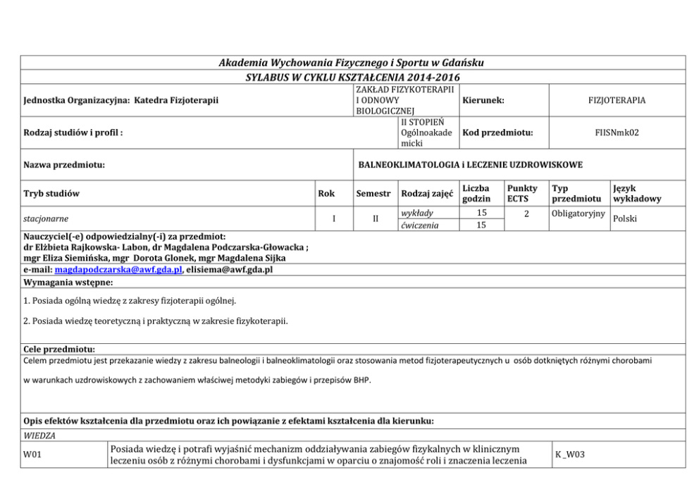 Akademia Wychowania Fizycznego i Sportu w Gdańsku SYLABUS W CYKLU KSZTAŁCENIA 2014-2016 ZAKŁAD FIZYKOTERAPII I ODNOWY Kierunek: BIOLOGICZNEJ II STOPIEŃ Ogólnoakade Kod przedmiotu: micki Jednostka Organizacyjna: Katedra Fizjoterapii Rodzaj studiów i profil : Nazwa przedmiotu: FIZJOTERAPIA FIISNmk02 BALNEOKLIMATOLOGIA i LECZENIE UZDROWISKOWE Tryb studiów Rok stacjonarne Semestr I II Rodzaj zajęć wykłady ćwiczenia Liczba godzin 15 15 Punkty ECTS 2 Typ przedmiotu Obligatoryjny Język wykładowy Polski Nauczyciel(-e) odpowiedzialny(-i) za przedmiot: dr Elżbieta Rajkowska- Labon, dr Magdalena Podczarska-Głowacka ; mgr Eliza Siemińska, mgr Dorota Glonek, mgr Magdalena Sijka e-mail: [email protected], [email protected] Wymagania wstępne: 1. Posiada ogólną wiedzę z zakresy fizjoterapii ogólnej. 2. Posiada wiedzę teoretyczną i praktyczną w zakresie fizykoterapii. Cele przedmiotu: Celem przedmiotu jest przekazanie wiedzy z zakresu balneologii i balneoklimatologii oraz stosowania metod fizjoterapeutycznych u osób dotkniętych różnymi chorobami w warunkach uzdrowiskowych z zachowaniem właściwej metodyki zabiegów i przepisów BHP. Opis efektów kształcenia dla przedmiotu oraz ich powiązanie z efektami kształcenia dla kierunku: WIEDZA W01 Posiada wiedzę i potrafi wyjaśnić mechanizm oddziaływania zabiegów fizykalnych w klinicznym leczeniu osób z różnymi chorobami i dysfunkcjami w oparciu o znajomość roli i znaczenia leczenia K _W03 uzdrowiskowego w całokształcie procesu rehabilitacji W02 Ma wiedzę na temat znaczenia i roli leczenia w warunkach uzdrowiska K _W21 UMIEJĘTNOŚCI U01 U02 U03 Potrafi analizować wyniki oraz ocenić przydatność różnych badań aparaturowych dla doboru środków fizjoterapii w leczeniu uzdrowiskowym oraz kontroli wyników zastosowanego leczenia Potrafi tworzyć, weryfikować i modyfikować program usprawniania osób z różnymi dysfunkcjami narządu ruchu i innych narządów oraz układów ,stosownie do ich stanu klinicznego i funkcjonalnego oraz celów kompleksowej rehabilitacji Potrafi zaplanować i wykonywać zabiegi fizykalne w klinicznym leczeniu osób z różnymi chorobami i dysfunkcjami w oparciu o znajomość roli i znaczenia leczenia uzdrowiskowego K_U04 K _U08 K _U12 KOMPETENCJE K1 K2 Jest świadomy potrzeby do uzupełniania i doskonalenia kwalifikacji- potrafi samodzielnie zdobywać wiedzę i umiejętności w zakresie balneoklimatologii i leczenia uzdrowiskowego z wykorzystaniem wiarygodnych i efektywnych źródeł i metod Identyfikuje i przestrzega właściwych relacji z pacjentem, z rodziną pacjenta, z najbliższym otoczeniem i społeczeństwem K_K02 K_K04 Kryteria i metody oceny osiągniętych efektów kształcenia: Wykład: EGZAMIN PISEMNY : TEST- pytania zamknięte (test jednokrotnego lub wielokrotnego wyboru)oraz pytania otwarte ( W1-W2) Ćwiczenia: Ocena zaliczeniowa na podstawie zaliczeń cząstkowych otrzymywanych w trakcie semestru za : - przygotowanie prezentacji multimedialnych -plan leczenia uzdrowiskowego w wybranych jednostkach chorobowych (W1-W3, K1) , - sprawdzian praktycznych umiejętności ( U1-U3) ocenie eksperta podlega: zgodność ze standardem wykonania zabiegu, czasu wykonania zabiegu, zachowanie zasad bezpieczeństwa, samodzielność - uczestnictwo w zajęciach klinicznych w placówce sanatoryjnej ( K1, K2, ) Aby uzyskać zaliczenie przedmiotu student musi osiągnąć wszystkie, wyznaczone w karcie przedmiotu, efekty kształcenia Metody i formy realizacji przedmiotu: - wykład kursowy (informacyjny) i wykład konwersatoryjny, - ćwiczenia kliniczne - demonstrowanie, analiza przypadków, rozwiązywanie problemów (planowanie terapii), praca w grupach Treści kształcenia: Wykłady: • Ogólna charakterystyka balneologii – definicja balneologii, rys historyczny, odczyn uzdrowiskowy, rodzaje lecznictwa uzdrowiskowego, wskazania i przeciwwskazania do leczenia uzdrowiskowego • Metody hydroterapii stosowanej w uzdrowiskach • Peloidoterapia – podział, skład borowin, zabiegi borowinowe, wskazania i przeciwwskazania • Lecznicze wody mineralne uzdrowiskowe • Termoterapia (ciepło -, zimnolecznictwo) • Areozoloterapia • Turystyka uzdrowiskowa • Leczenie uzdrowiskowe pacjentów z cukrzycą Ćwiczenia: Student poznaje standardy wykonania poszczególnych zabiegów oraz metodykę i bhp pracy na zajęciach w AWFiS. ( 6 godz.) • Zasady leczenia balneologicznego i fizykoterapeutycznego w wybranych przypadkach klinicznych Na zajęciach klinicznych, które odbywają się w placówce sanatoryjnej, student uczestniczy w praktycznym zastosowaniu balneoklimatologii, w poszczególnych jednostkach chorobowych. ( 9 godz.) • Hydroterapia w uzdrowiskach – praktyczne zastosowanie • Terrmoterapia w uzdrowiskach – praktyczne zastosowanie • Inhalacje w uzdrowiskach – praktyczne zastosowanie • Peloidoterapia w uzdrowiskach – praktyczne zastosowanie • Balneofizykoterapia w chorobach narządu krążenia – praktyczne zastosowanie • Ginekologia uzdrowiskowa – praktyczne zastosowanie Forma zaliczenia: Wykład : - Egzamin Ćwiczenia: Zaliczenie bez oceny Literatura: podstawowa: • Kochański W. (2002): Balneologia i hydroterapia. Wrocław. Wyd. • Mika T., Kasprzak W. (2006): Fizykoterapia. Warszawa: Wyd. Lek. PZWL. • Ponikowska I., Ferson D.(2009): Nowoczesna medycyna uzdrowiskowa. Warszawa : Wyd. Lek. PZWL. • Ponikowska I.(2004): Kompendium balneologii. Kierunki i wskazania do leczenia uzdrowiskowego. Warszawa : Wyd. Adam Marszałek • Straburzyńska-Lupa A., Straburzyński G. (2008): Fizjoterapia z elementami klinicznymi. Warszawa: Wyd. Lek..PZWL. uzupełniająca: • Kasprzak W., Mańkowska A. (2008): Fizykoterapia, medycyna uzdrowiskowa i SPA. Warszawa: • Kolster B., Ebett – Paprotny G. (2001): Poradnik fizjoterapeuty. Wrocław: Wyd. im. Ossolińskich. • Ponikowska I.(2005): Lecznictwo uzdrowiskowe. Warszawa : Wyd. .Branta. • Ponikowska I.(1995): Diabetologia uzdrowis