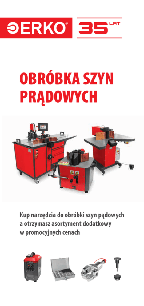 OBRÓBKA SZYN PRĄDOWYCH Kup narzędzia do obróbki szyn pądowych a otrzymasz asortyment dodatkowy w promocyjnych cenach Stanowisko do obróbki szyn prądowych SH 800PLC Stanowisko do gięcia i cięcia szyn prądowych HG 200 Otrzymasz: Głowice hydrauliczną GZ_300 w cenie 1 zł netto Zestaw matryc do zaciskania ZS_K-K8 w cenie 1 zł netto Stanowisko do obróbki szyn prądowych Otrzymasz wkładkę do cięcia HG_205 w niższej cenie o 20% od ceny wyjściowej Giętarko-dziurkarka HGD 125 SH 300 Otrzymasz Agregat AH_100 w niższej cenie o 20% od ceny wyjściowej Otrzymasz 2 standardowe wycinaki okrągłe HGD_103 w cenie 1 zł netto każdy Regulamin promocji „Obróbka szyn prądowych” §1. Organizator promocji Organizatorem promocji, „Obróbka szyn prądowych” są Zakłady Metalowe ERKO R. Pętlak spółka jawna Bracia Pętlak z siedzibą w Jonkowie przy ul. Hanowskiego 7 – zwane dalej Producentem. §2. Przedmiot promocji Za zakup narzędzi przedstawionych w ulotce Klient otrzymuje wymieniony asortyment dodatkowy w promocyjnej cenie. Asortyment dodatkowy przyznany za zakup narzędzi zostanie zafakturowany przez Producenta łącznie z pozostałymi pozycjami faktury dotyczącymi promocji. Promocja dotyczy jedynie nowych i kompletnych wyrobów Producenta. §3. Czas trwania promocji Promocja trwa od 10.10.2016 r. do 31.12.2016 r. lub do wyczerpania zapasów. Za decydującą o udziale w promocji datę przyjmuje się datę złożenia zamówienia. Promocja może zostać wydłużona/skrócona/odwołana przez Producenta bez wcześniejszego powiadomienia. §4. Uczestnicy promocji Promocja obejmuje wszystkich Klientów Producenta oraz Klientów jego Dystrybutorów nie posiadających wobec niego zaległości płatniczych. §5. Warunki promocji Zakupiony promocyjnie towar musi być odebrany w całości i terminowo opłacony oraz nie podlega zwrotowi ani wymianie. §6. Postanowienia końcowe Producent zastrzega sobie prawo do zmiany zasad i warunków promocji bez wcześniejszego powiadomienia. Producent nie ponosi odpowiedzialności w stosunku do żadnego Klienta za jakiekolwiek straty finansowe poniesione przez niego w wyniku odmowy, anulacji lub wycofania Promocji oraz za niewykorzystanie przez Klienta lub niemożność skorzystania z Promocji z jakichkolwiek powodów. Uczestnikom promocji nie przysługuje prawo otrzymania ekwiwalentu pieniężnego lub rzeczowego z tytułu promocji. * Regulamin promocji na www.erko.pl. Promocja obowiązuje od 10.10.2016 do 31.12.2016 lub do wyczerpania zapasów. ERKO sp.j. 11-042 Jonkowo, ul. Hanowskiego 7, Polska tel./fax +48 89 512 92 73 dział sprzedaży: [email protected] www.erko.pl