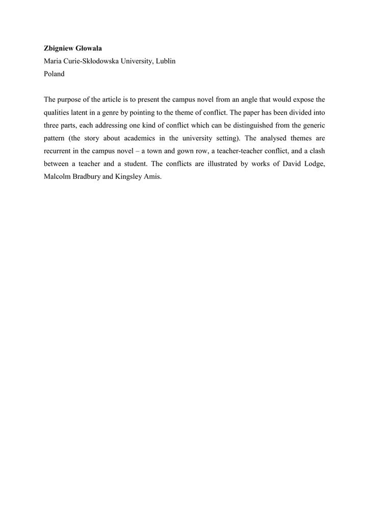 Zbigniew Głowala Maria Curie-Skłodowska University, Lublin Poland The purpose of the article is to present the campus novel from an angle that would expose the qualities latent in a genre by pointing to the theme of conflict. The paper has been divided into three parts, each addressing one kind of conflict which can be distinguished from the generic pattern (the story about academics in the university setting). The analysed themes are recurrent in the campus novel – a town and gown row, a teacher-teacher conflict, and a clash between a teacher and a student. The conflicts are illustrated by works of David Lodge, Malcolm Bradbury and Kingsley Amis.